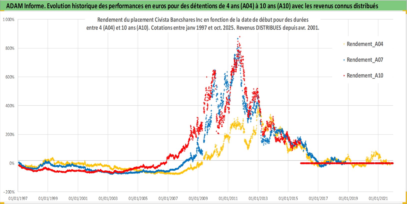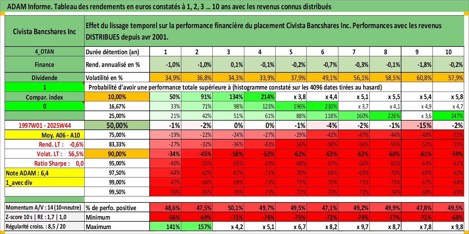 Site dédié aux investisseursPage dédiée sur site financeAnalyse des valorisations hebdomadaires de l'action Civista Bancshares Inc. Cet actif est cote en USD. Les valorisations sont en contrevaleur EURO et couvrent les semaines 1997W01 a 2025W44. Les revenus de cet actif financier sont pris en compte depuis la semaine 2001W15. La note ESG de cet actif n'est pas connue.