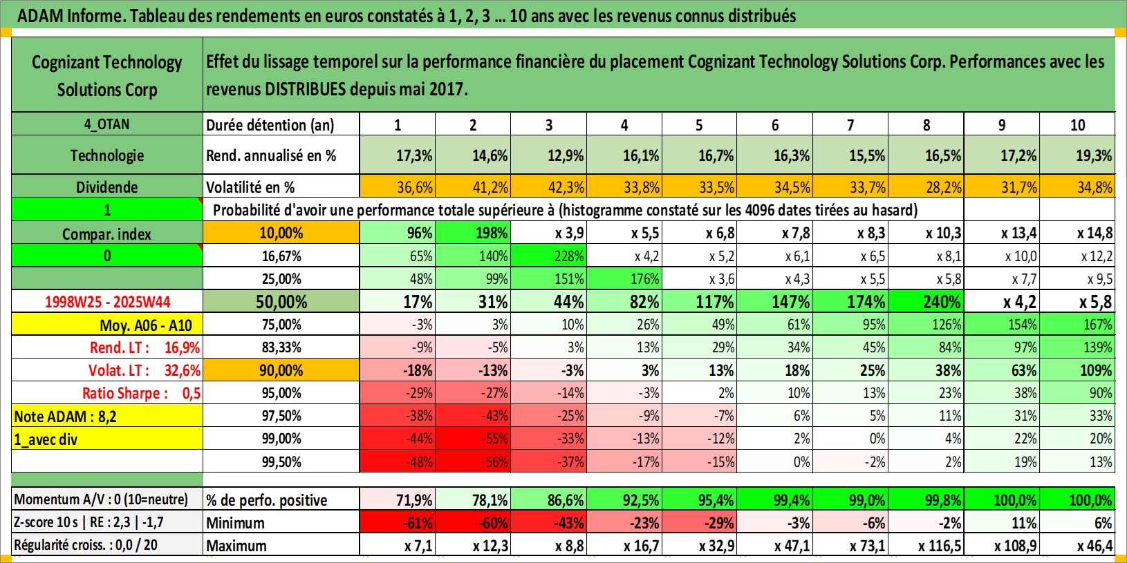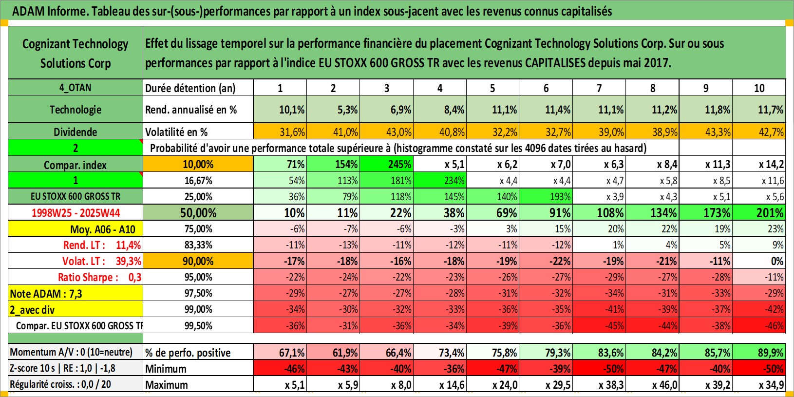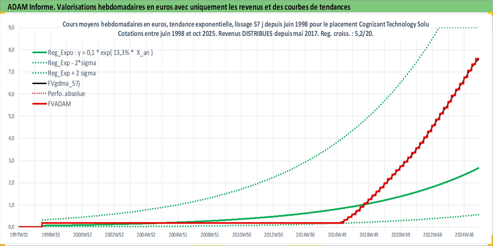 Site dédié aux investisseursPage dédiée sur site financeAnalyse des valorisations hebdomadaires de l'action Cognizant Technology Solutions Corp. Cet actif est cote en USD. Les valorisations sont en contrevaleur EURO et couvrent les semaines 1998W25 a 2025W44. Les revenus de cet actif financier sont pris en compte depuis la semaine 2017W20. La note globale ESG de cet actif est estimee a 14.0 (apres rebasage entre 0 et 20).