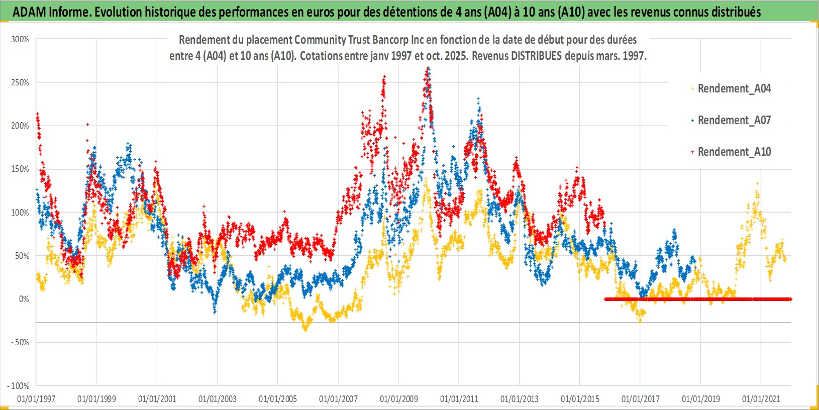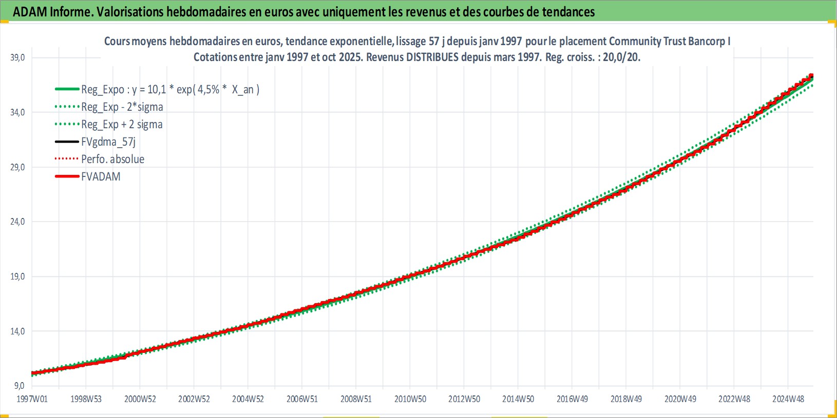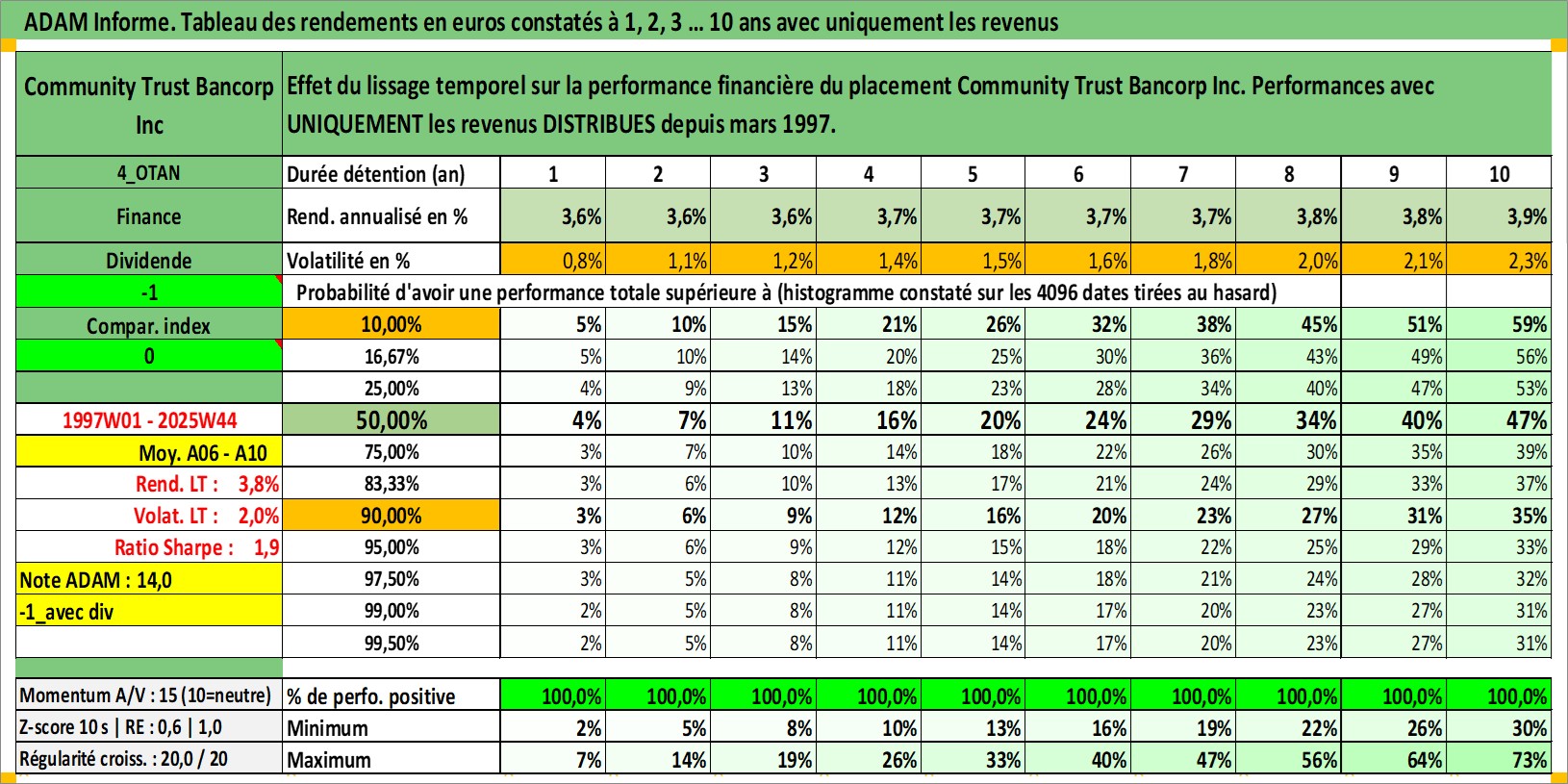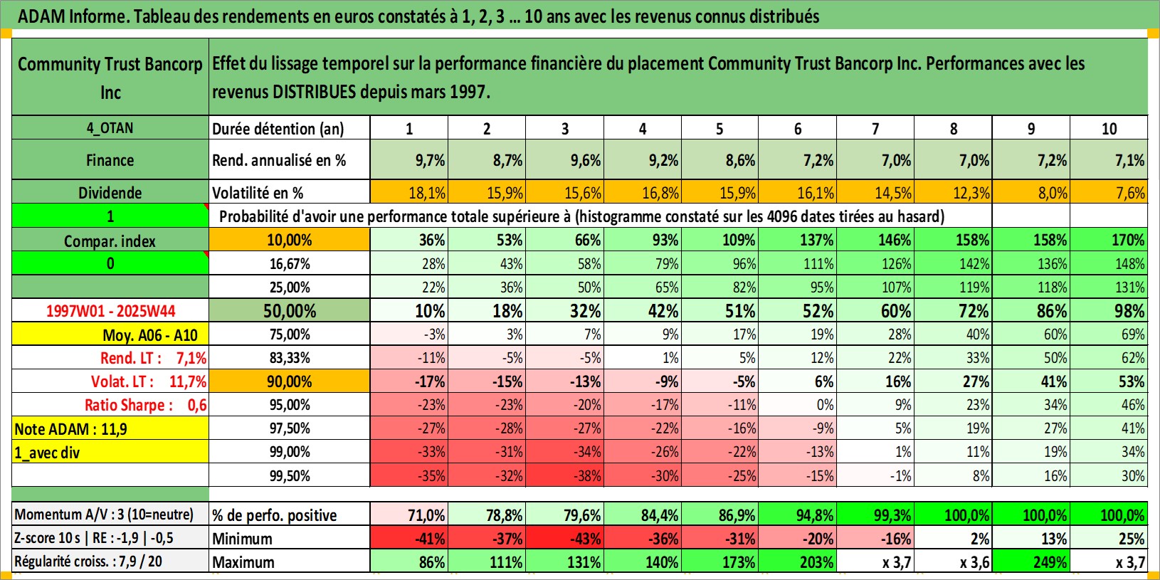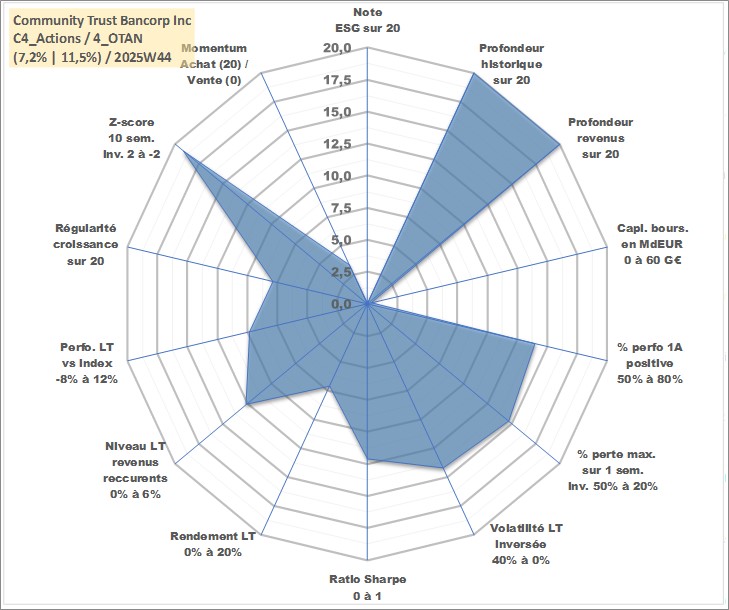 Site dédié aux investisseursPage dédiée sur site financeAnalyse des valorisations hebdomadaires de l'action Community Trust Bancorp Inc. Cet actif est cote en USD. Les valorisations sont en contrevaleur EURO et couvrent les semaines 1997W01 a 2025W44. Les revenus de cet actif financier sont pris en compte depuis la semaine 1997W11. La note ESG de cet actif n'est pas connue.