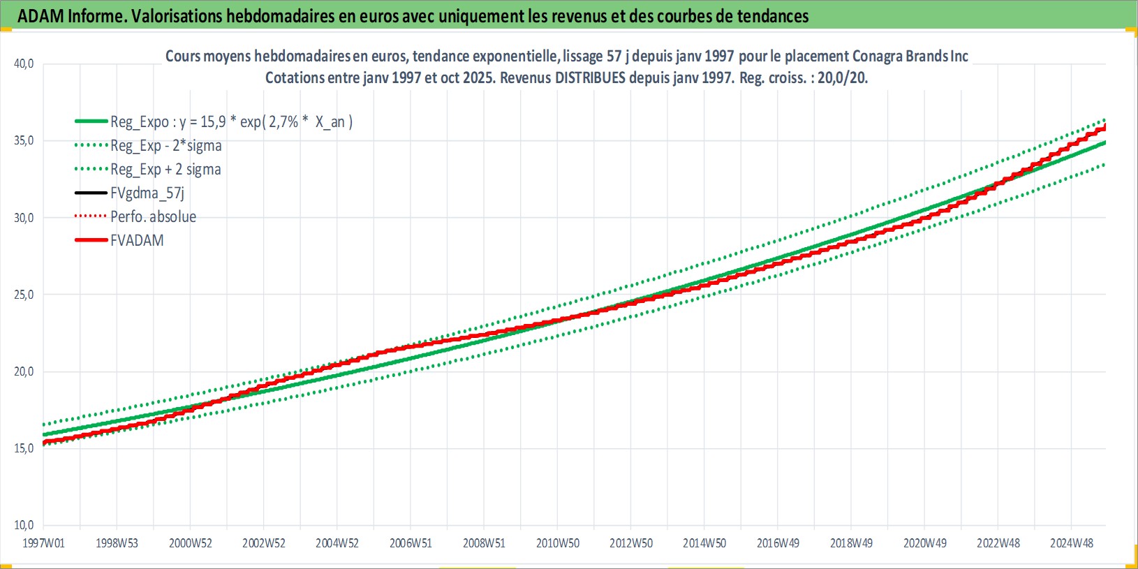 Site dédié aux investisseursPage dédiée sur site financeAnalyse des valorisations hebdomadaires de l'action Conagra Brands Inc. Cet actif est cote en USD. Les valorisations sont en contrevaleur EURO et couvrent les semaines 1997W01 a 2025W44. Les revenus de cet actif financier sont pris en compte depuis la semaine 1997W05. La note globale ESG de cet actif est estimee a 4.0 (apres rebasage entre 0 et 20).