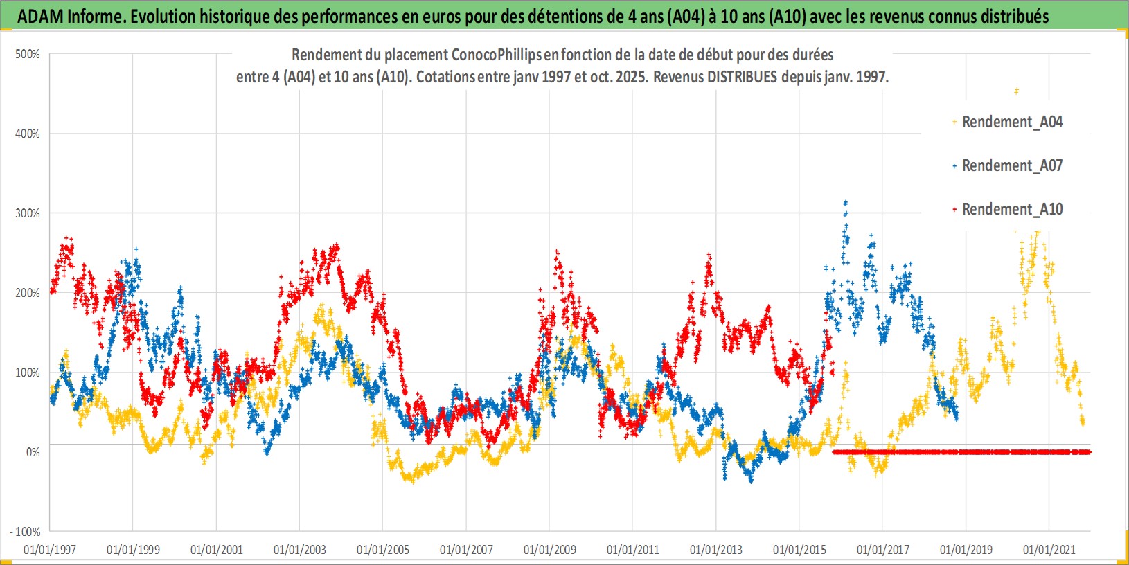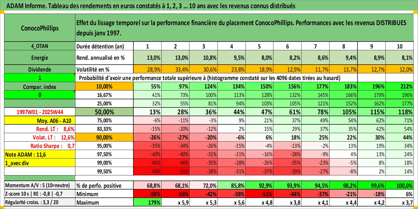 Site dédié aux investisseursPage dédiée sur site financeAnalyse des valorisations hebdomadaires de l'action ConocoPhillips. Cet actif est cote en USD. Les valorisations sont en contrevaleur EURO et couvrent les semaines 1997W01 a 2025W44. Les revenus de cet actif financier sont pris en compte depuis la semaine 1997W05. La note globale ESG de cet actif est estimee a 3.0 (apres rebasage entre 0 et 20).