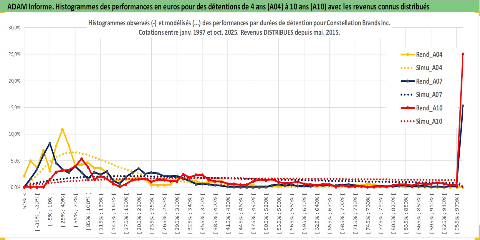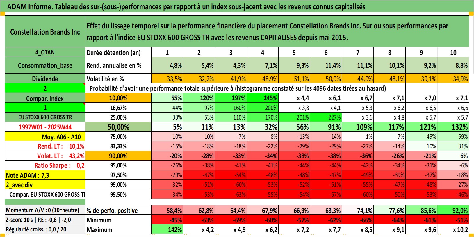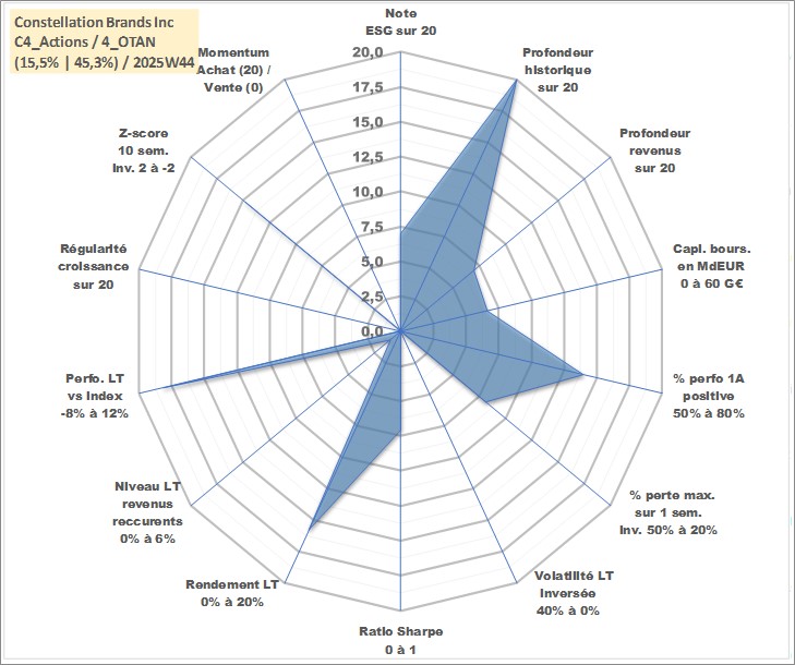 Site dédié aux investisseursPage dédiée sur site financeAnalyse des valorisations hebdomadaires de l'action Constellation Brands Inc. Cet actif est cote en USD. Les valorisations sont en contrevaleur EURO et couvrent les semaines 1997W01 a 2025W44. Les revenus de cet actif financier sont pris en compte depuis la semaine 2015W19. La note globale ESG de cet actif est estimee a 7.0 (apres rebasage entre 0 et 20).