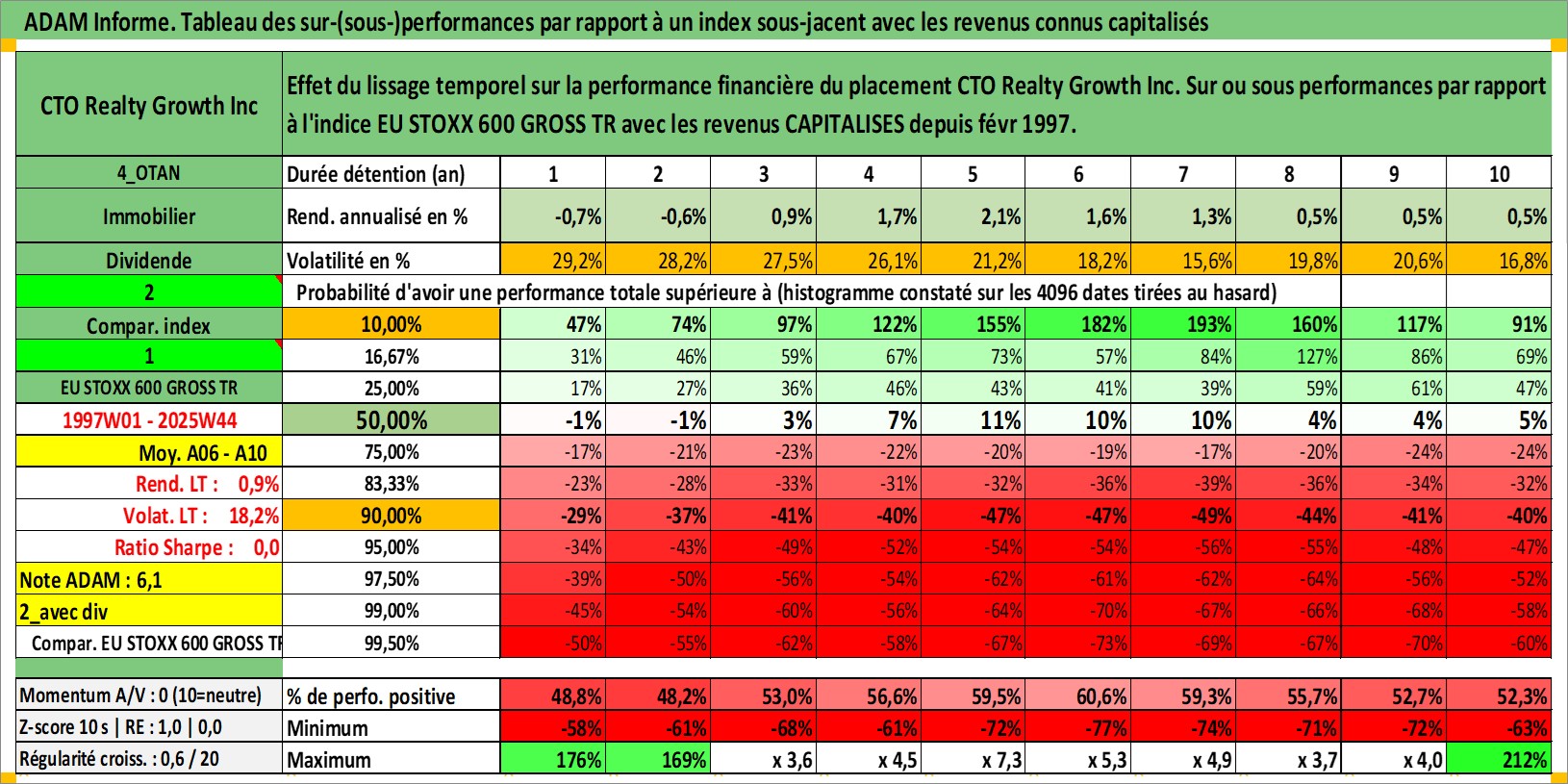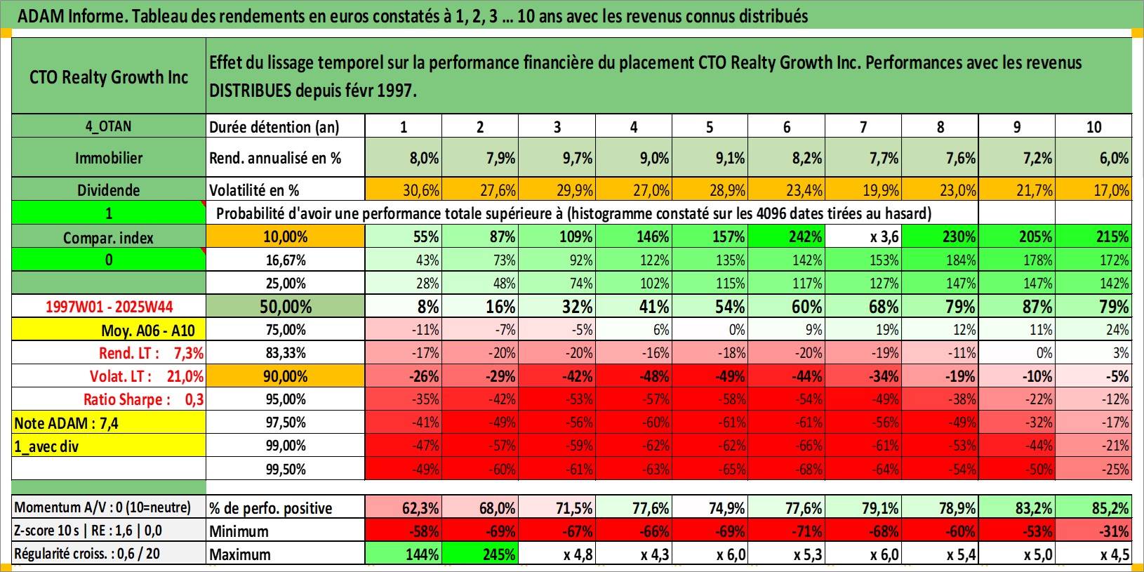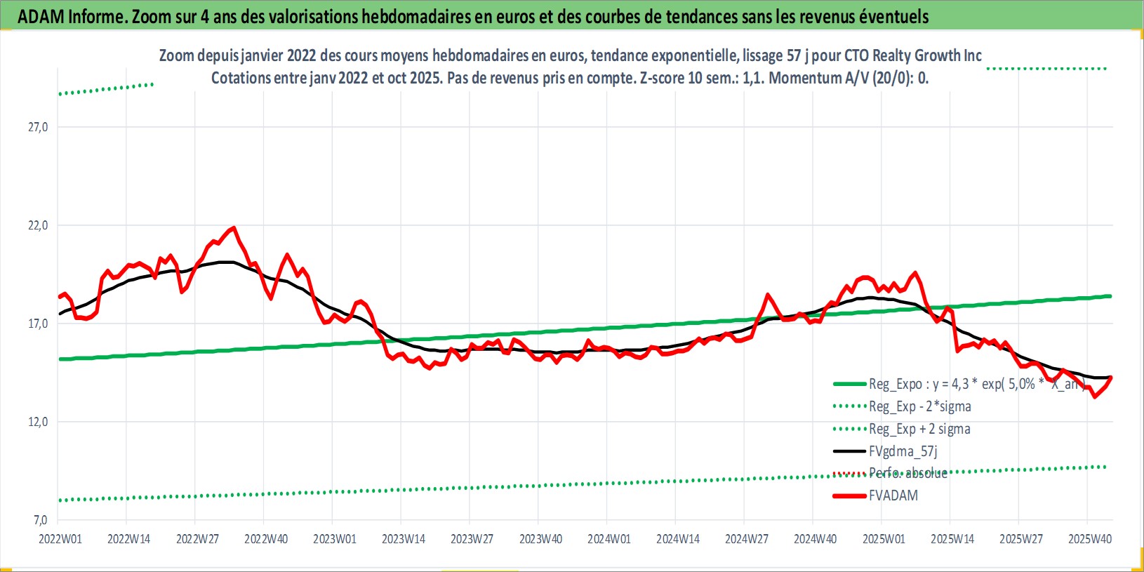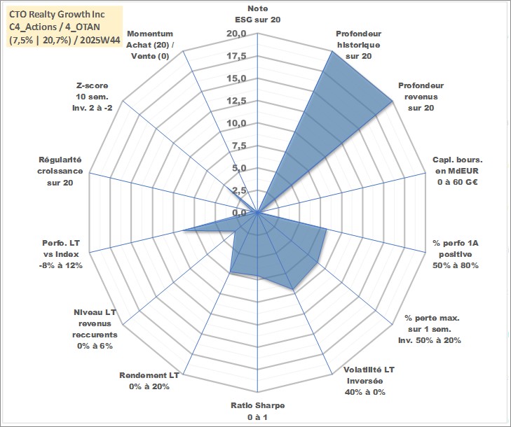 Site dédié aux investisseursPage dédiée sur site financeAnalyse des valorisations hebdomadaires de l'action CTO Realty Growth Inc. Cet actif est cote en USD. Les valorisations sont en contrevaleur EURO et couvrent les semaines 1997W01 a 2025W44. Les revenus de cet actif financier sont pris en compte depuis la semaine 1997W06. La note ESG de cet actif n'est pas connue.