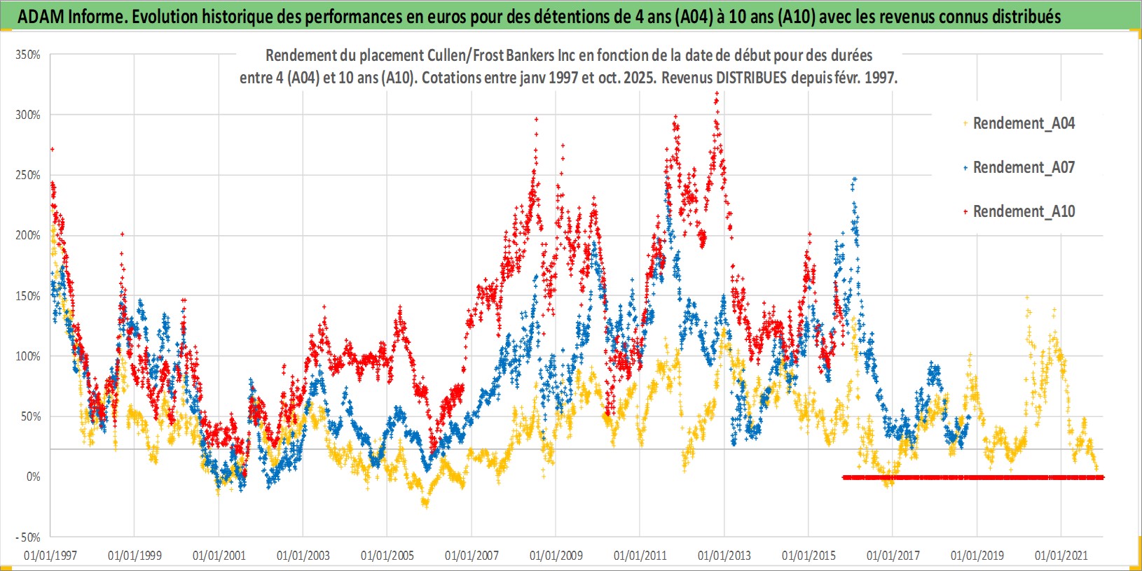 Site dédié aux investisseursPage dédiée sur site financeAnalyse des valorisations hebdomadaires de l'action Cullen/Frost Bankers Inc. Cet actif est cote en USD. Les valorisations sont en contrevaleur EURO et couvrent les semaines 1997W01 a 2025W44. Les revenus de cet actif financier sont pris en compte depuis la semaine 1997W09. La note globale ESG de cet actif est estimee a 5.0 (apres rebasage entre 0 et 20).