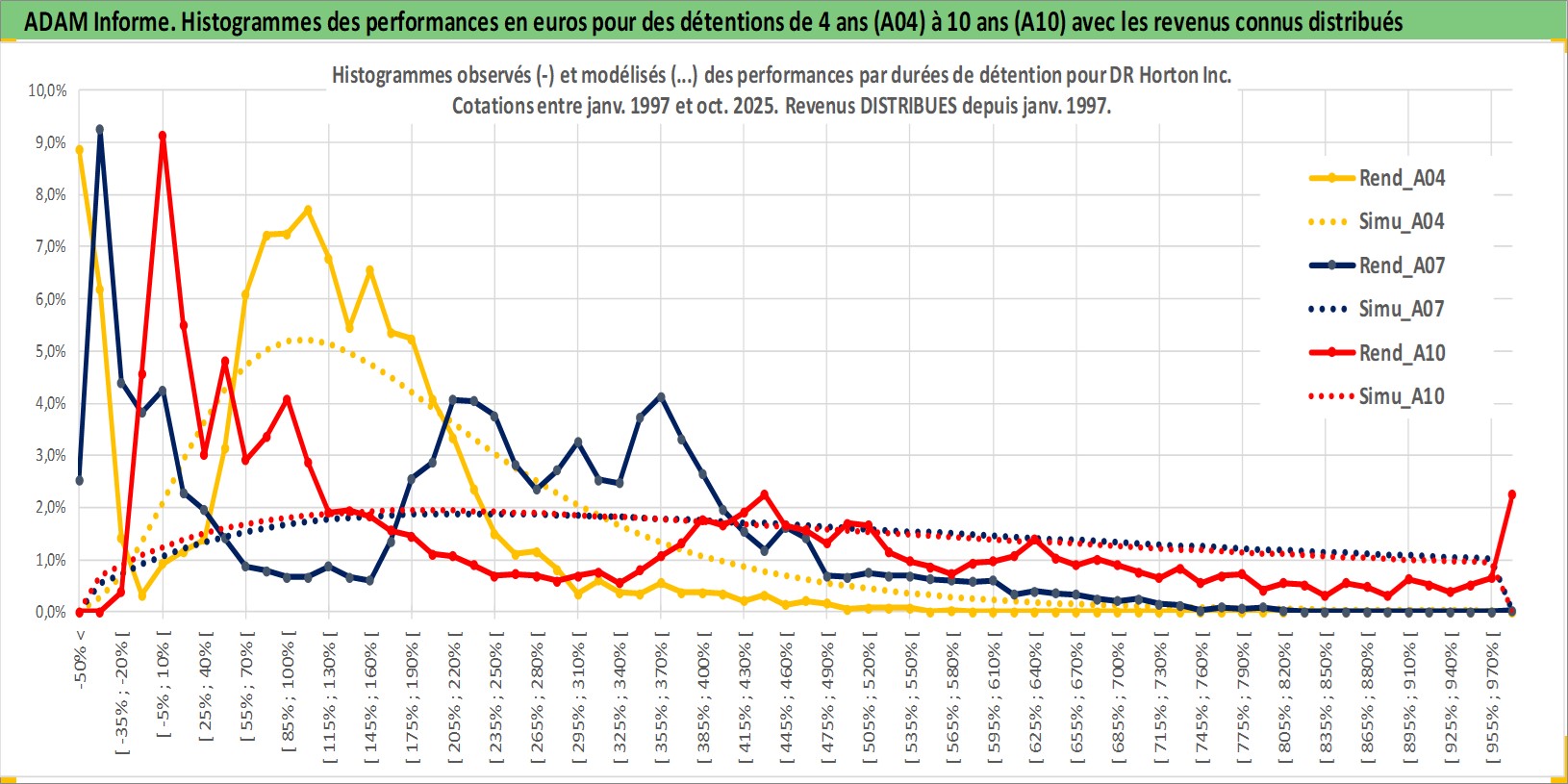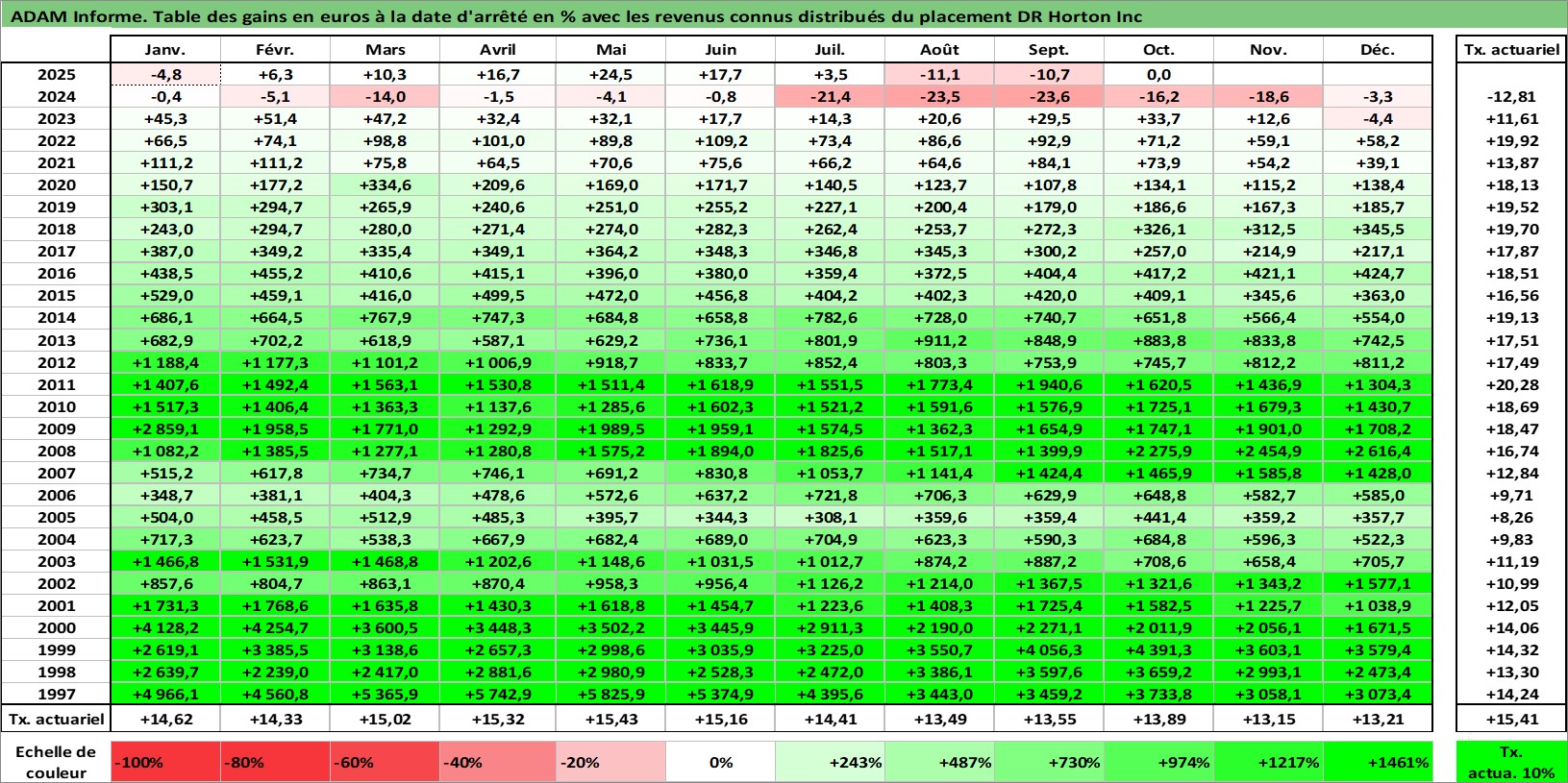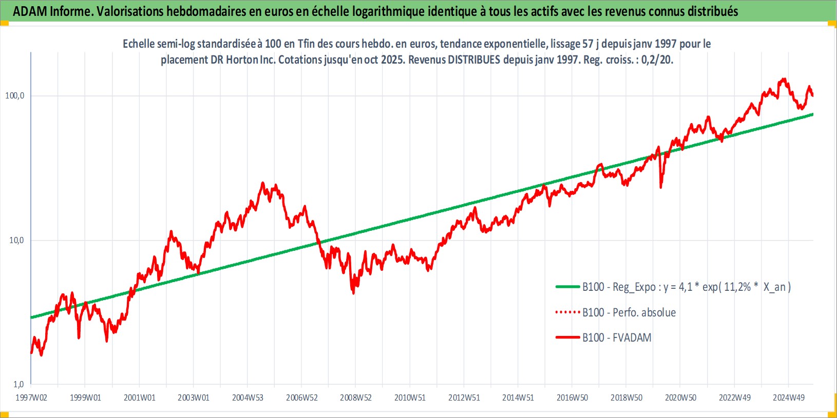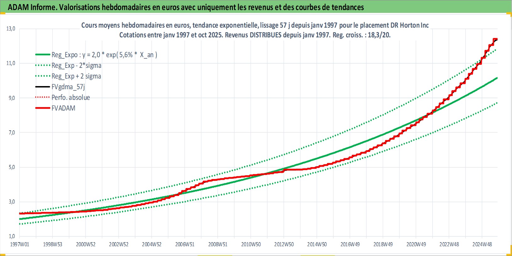Site dédié aux investisseursPage dédiée sur site financeAnalyse des valorisations hebdomadaires de l'action DR Horton Inc. Cet actif est cote en USD. Les valorisations sont en contrevaleur EURO et couvrent les semaines 1997W01 a 2025W44. Les revenus de cet actif financier sont pris en compte depuis la semaine 1997W05. La note globale ESG de cet actif est estimee a 9.0 (apres rebasage entre 0 et 20).