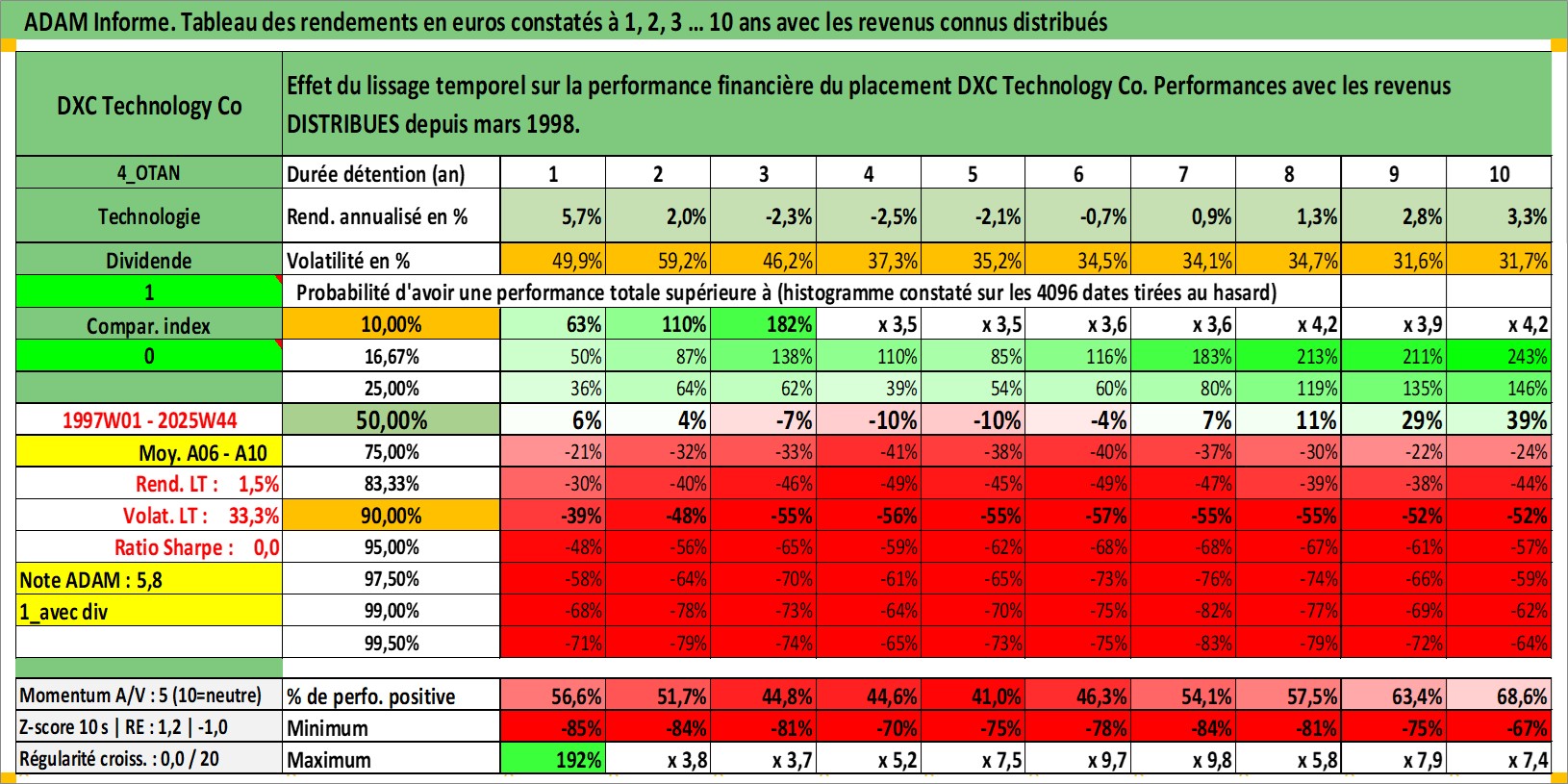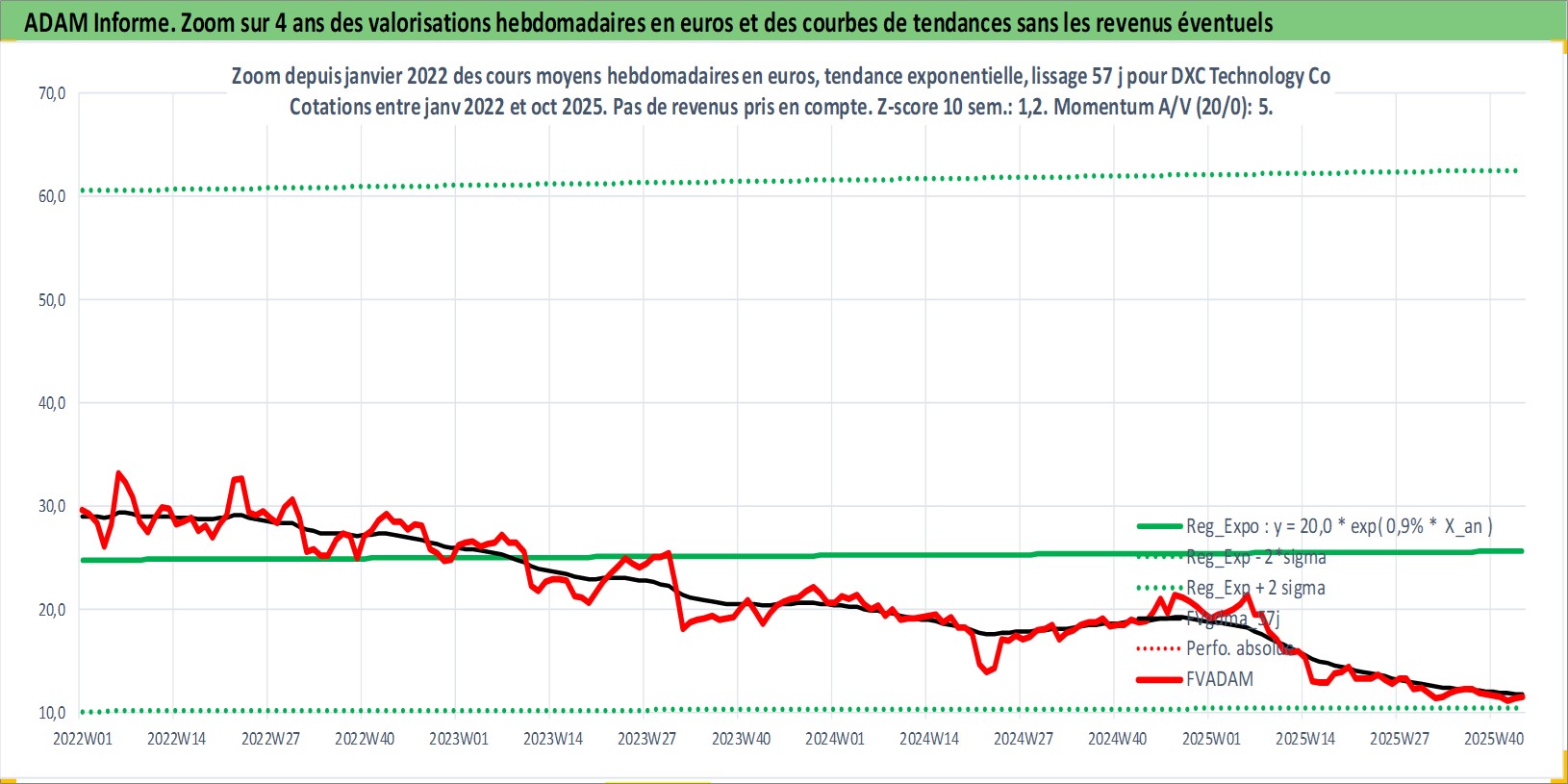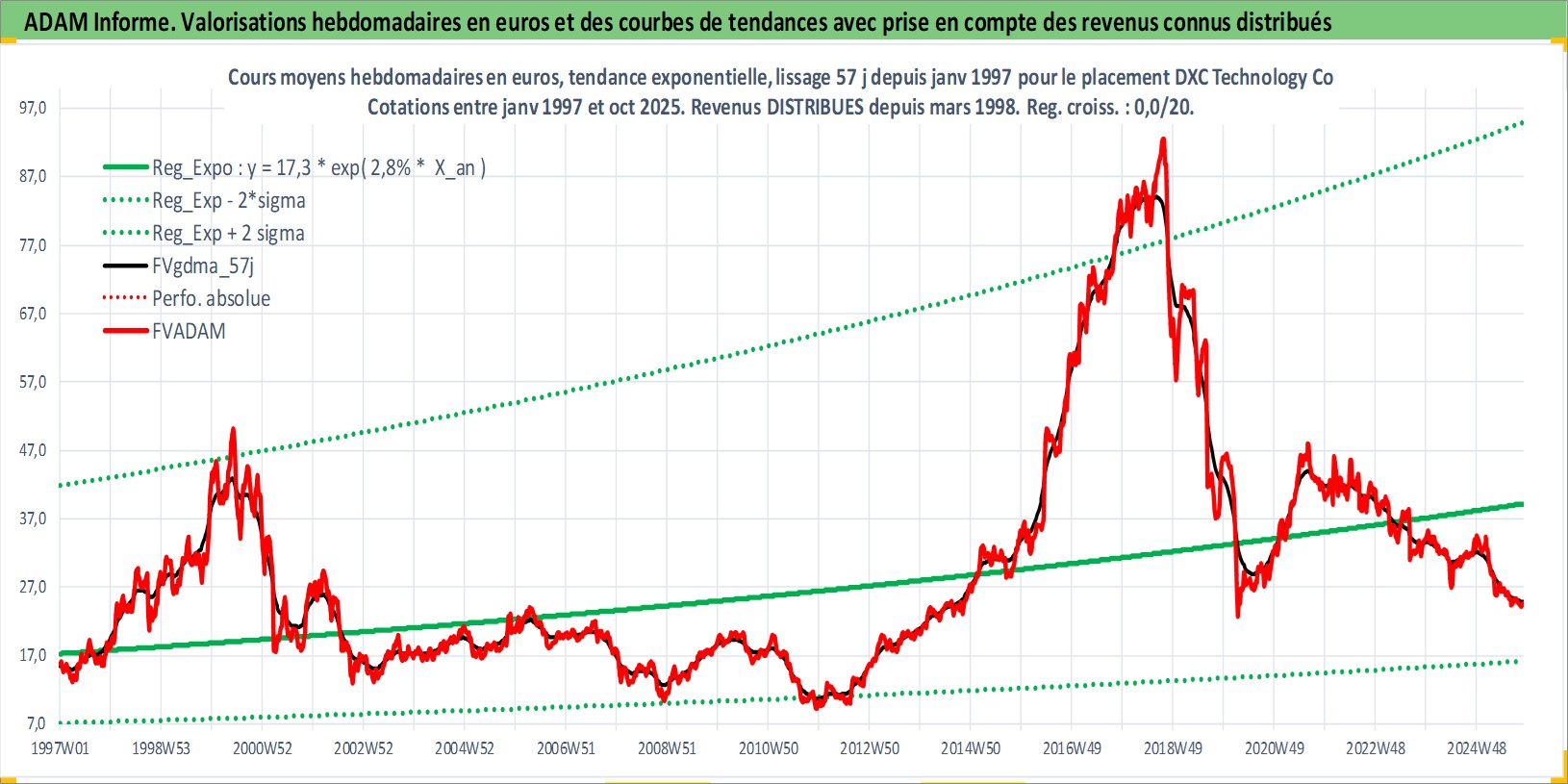 Site dédié aux investisseursPage dédiée sur site financeAnalyse des valorisations hebdomadaires de l'action DXC Technology Co. Cet actif est cote en USD. Les valorisations sont en contrevaleur EURO et couvrent les semaines 1997W01 a 2025W44. Les revenus de cet actif financier sont pris en compte depuis la semaine 1998W13. La note globale ESG de cet actif est estimee a 13.0 (apres rebasage entre 0 et 20).
