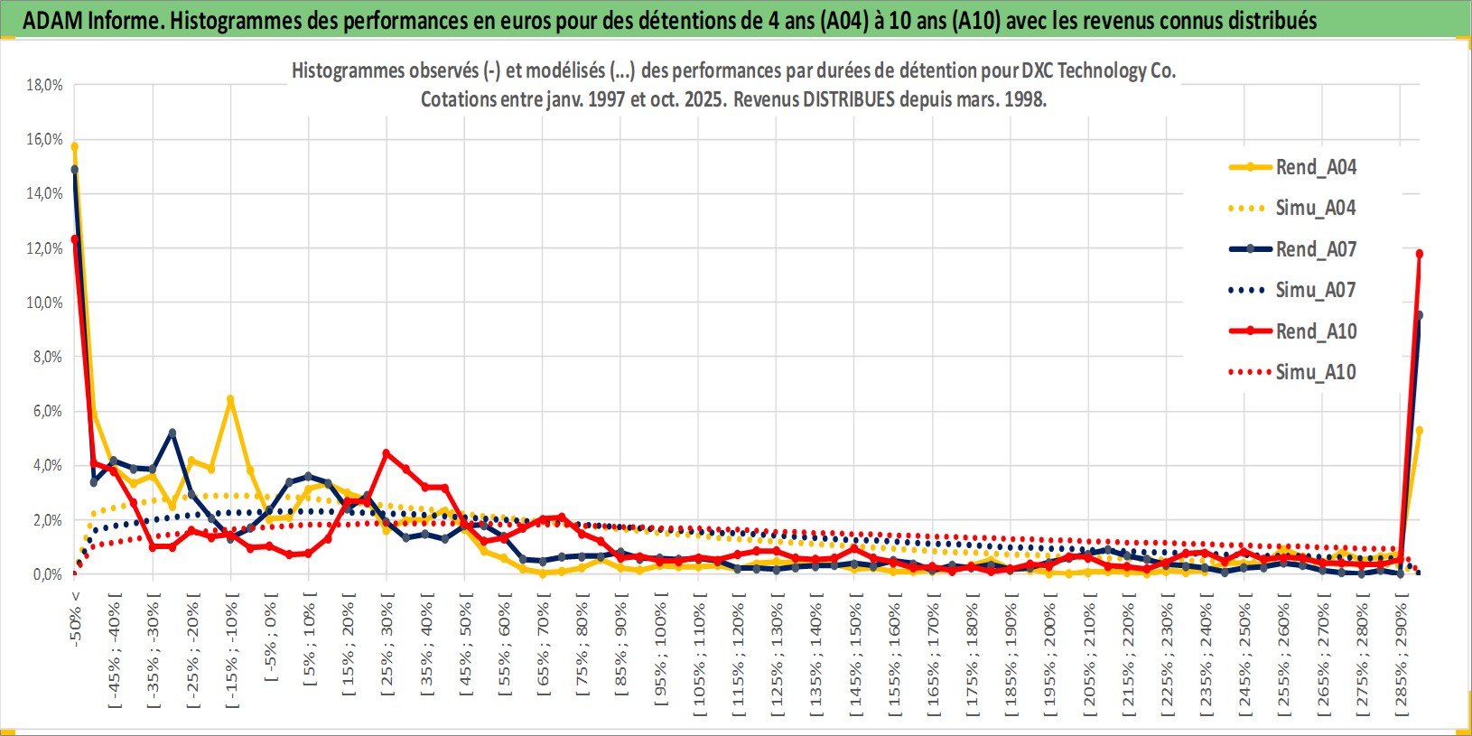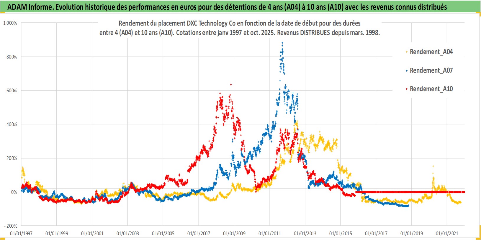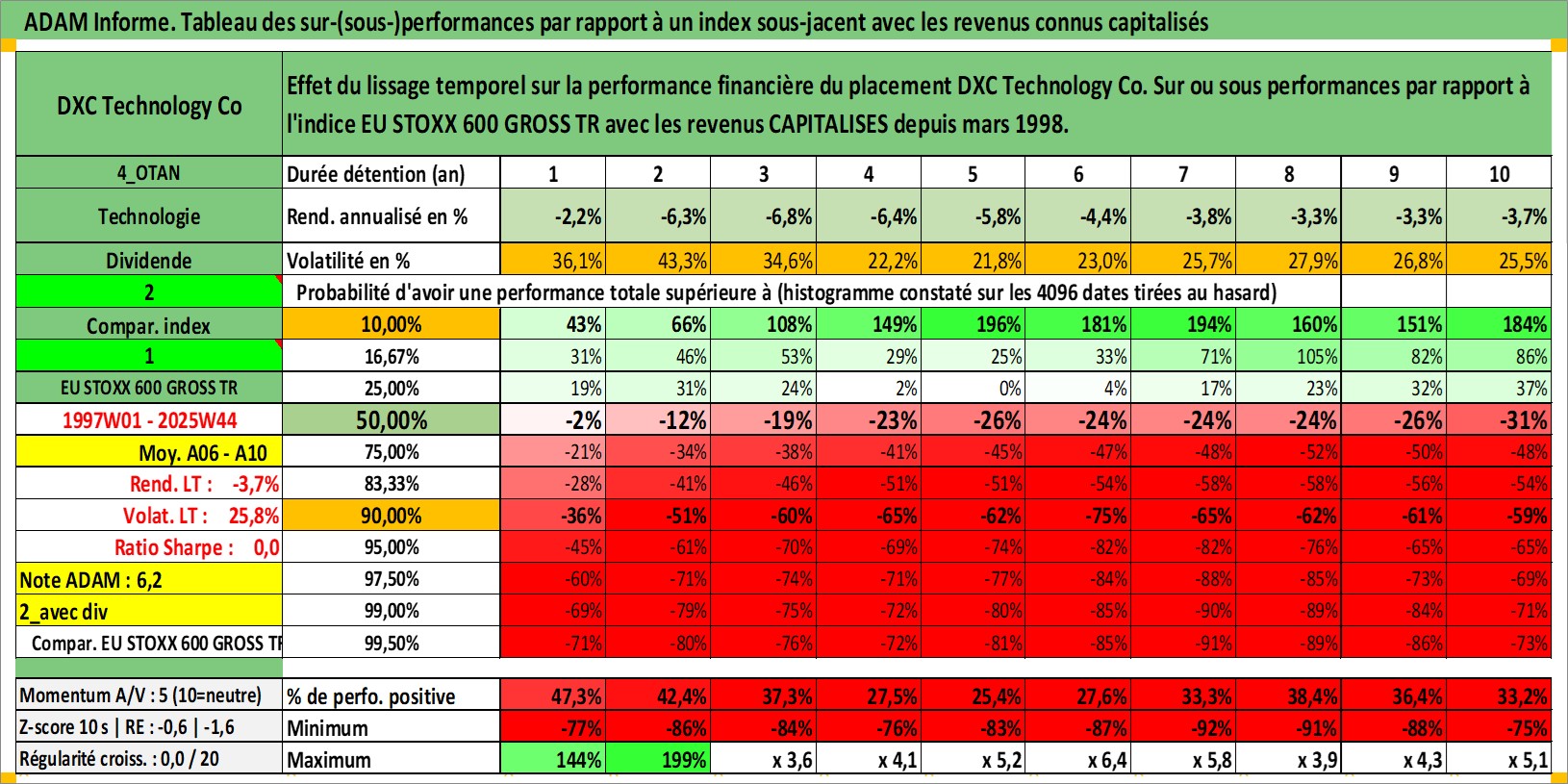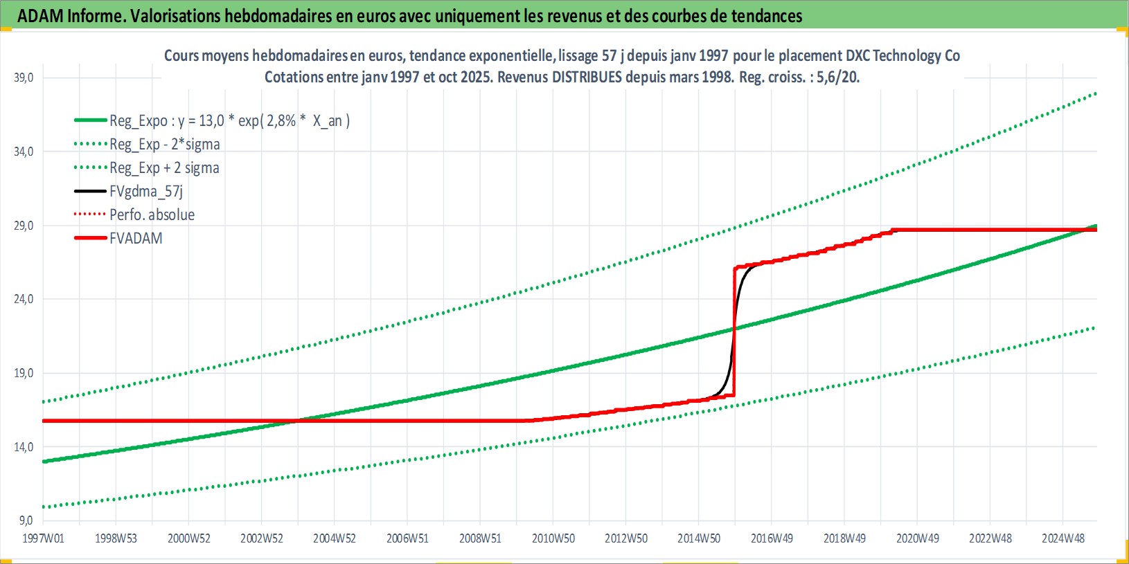 Site dédié aux investisseursPage dédiée sur site financeAnalyse des valorisations hebdomadaires de l'action DXC Technology Co. Cet actif est cote en USD. Les valorisations sont en contrevaleur EURO et couvrent les semaines 1997W01 a 2025W44. Les revenus de cet actif financier sont pris en compte depuis la semaine 1998W13. La note globale ESG de cet actif est estimee a 13.0 (apres rebasage entre 0 et 20).