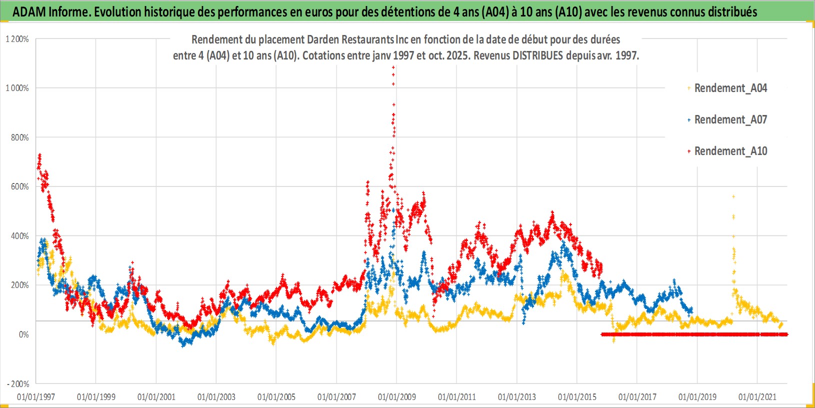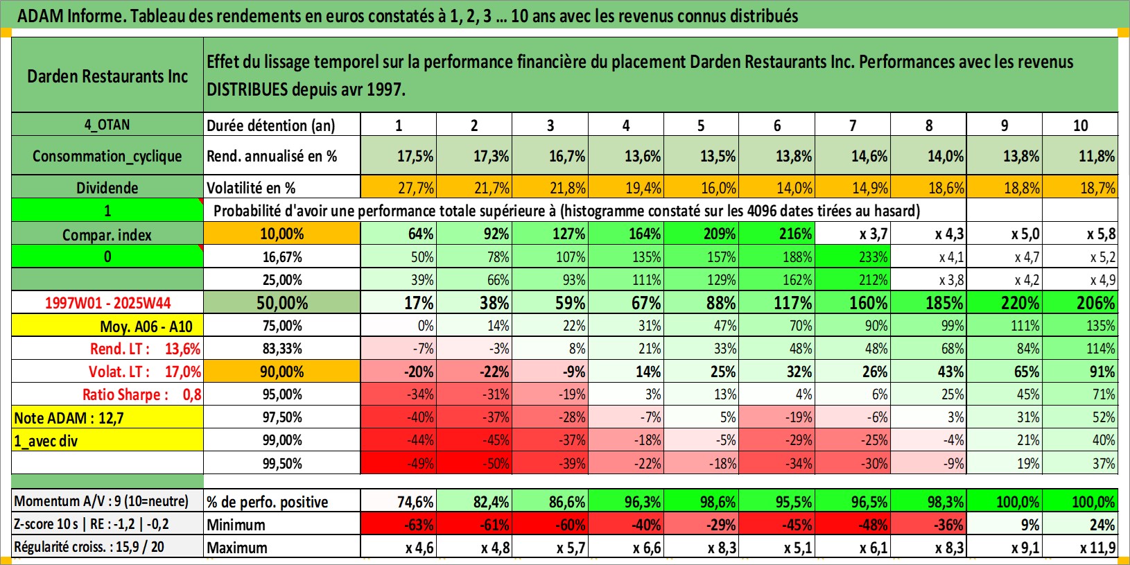 Site dédié aux investisseursPage dédiée sur site financeAnalyse des valorisations hebdomadaires de l'action Darden Restaurants Inc. Cet actif est cote en USD. Les valorisations sont en contrevaleur EURO et couvrent les semaines 1997W01 a 2025W44. Les revenus de cet actif financier sont pris en compte depuis la semaine 1997W15. La note globale ESG de cet actif est estimee a 6.0 (apres rebasage entre 0 et 20).