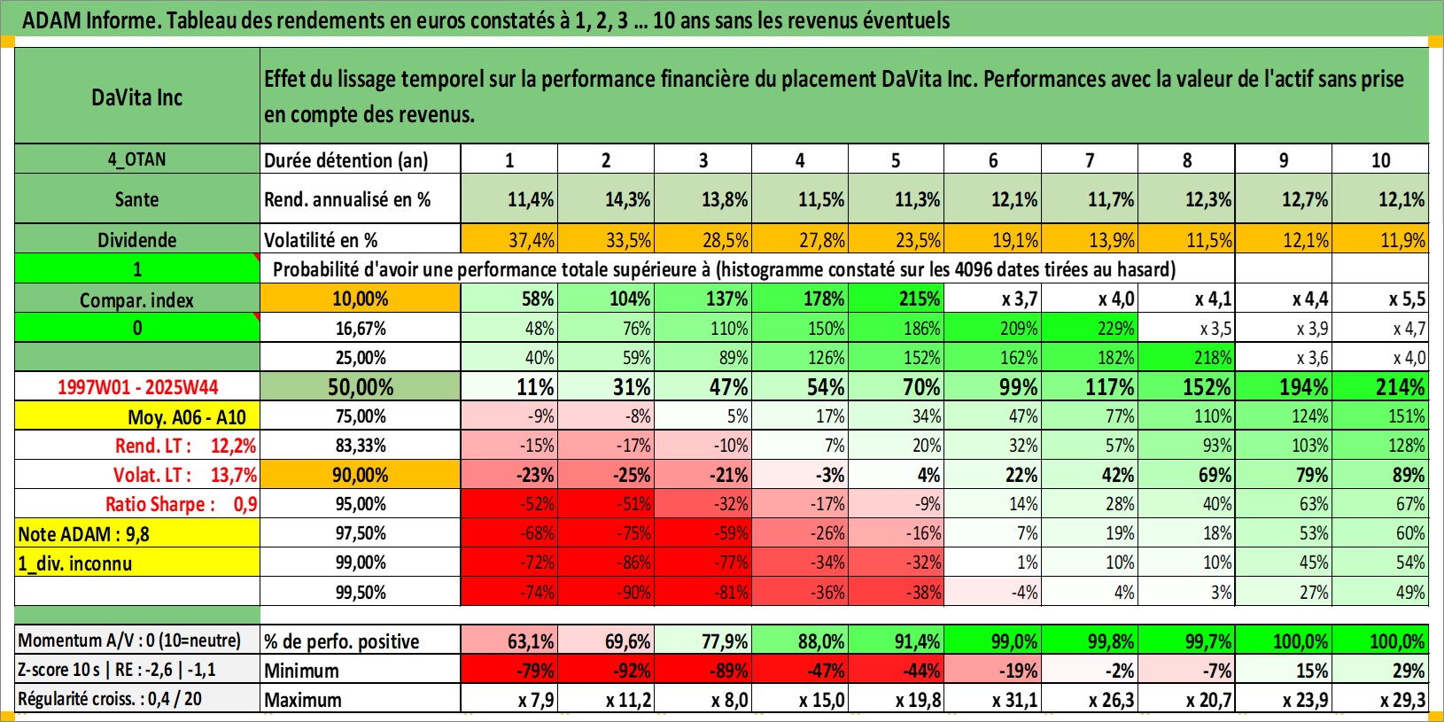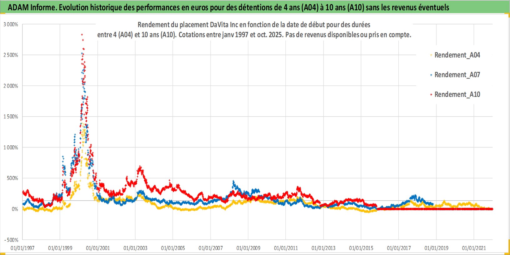 Site dédié aux investisseursPage dédiée sur site financeAnalyse des valorisations hebdomadaires de l'action DaVita Inc. Cet actif est cote en USD. Les valorisations sont en contrevaleur EURO et couvrent les semaines 1997W01 a 2025W44. Les revenus de cet actif financier ne sont pas connus car non existants ou non disponibles sur le site Yahoo Finance. La note globale ESG de cet actif est estimee a 9.0 (apres rebasage entre 0 et 20).