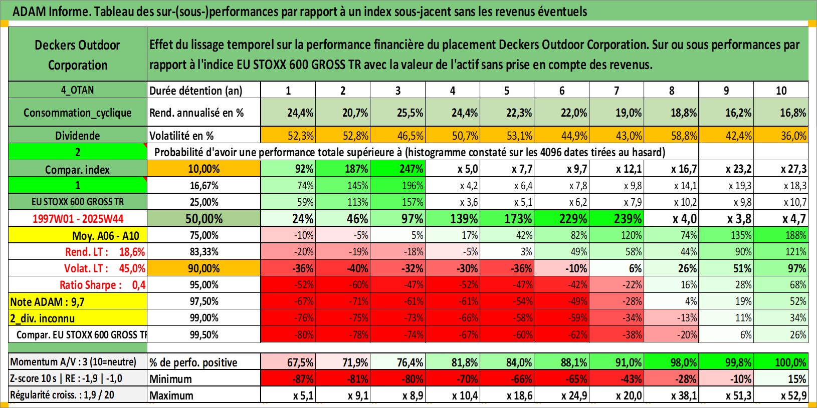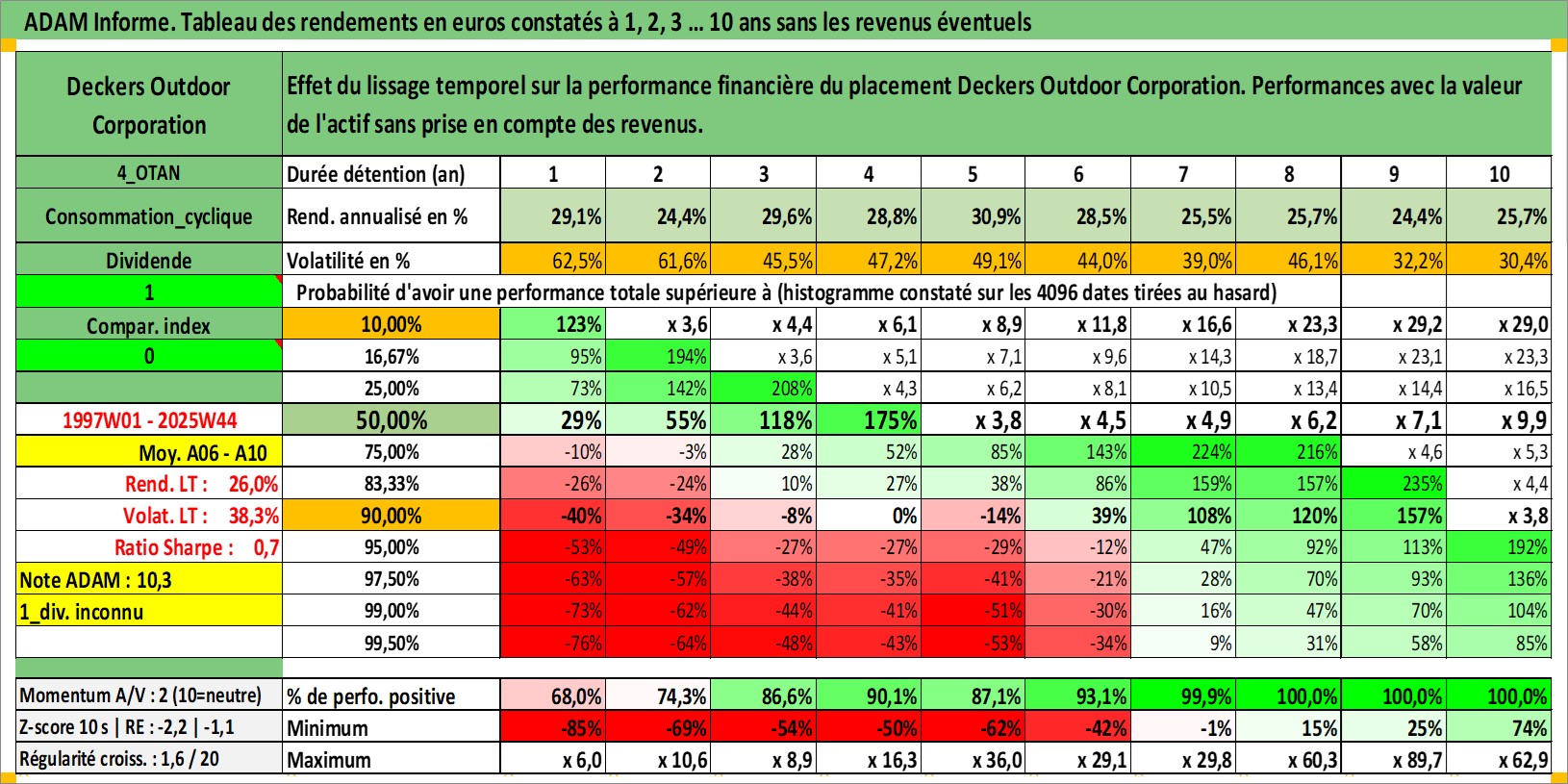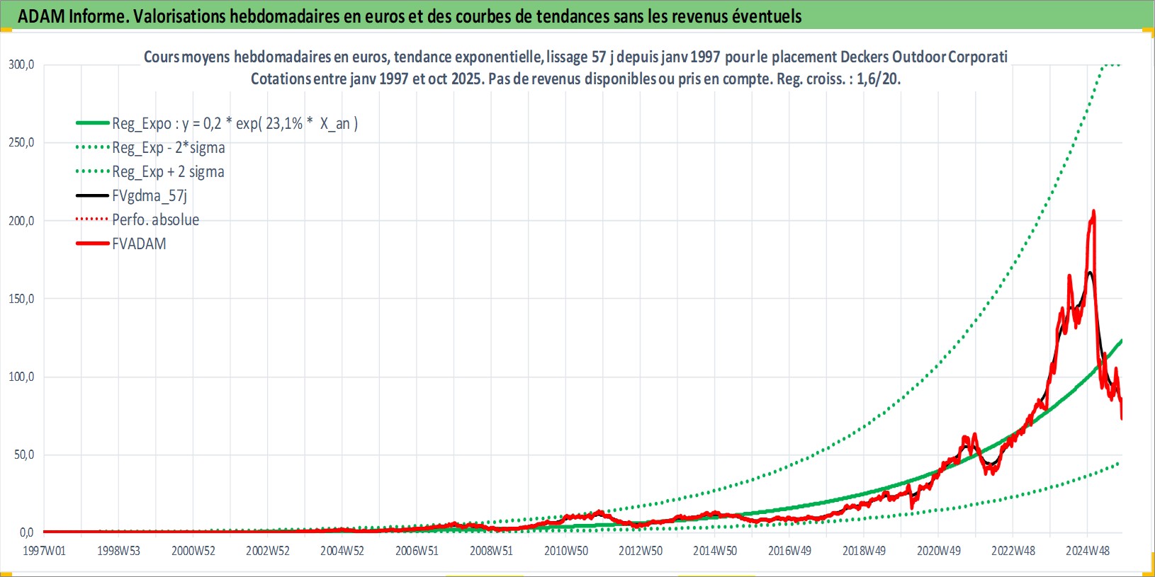 Site dédié aux investisseursPage dédiée sur site financeAnalyse des valorisations hebdomadaires de l'action Deckers Outdoor Corporation. Cet actif est cote en USD. Les valorisations sont en contrevaleur EURO et couvrent les semaines 1997W01 a 2025W44. Les revenus de cet actif financier ne sont pas connus car non existants ou non disponibles sur le site Yahoo Finance. La note ESG de cet actif n'est pas connue.