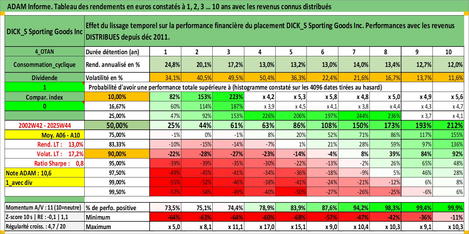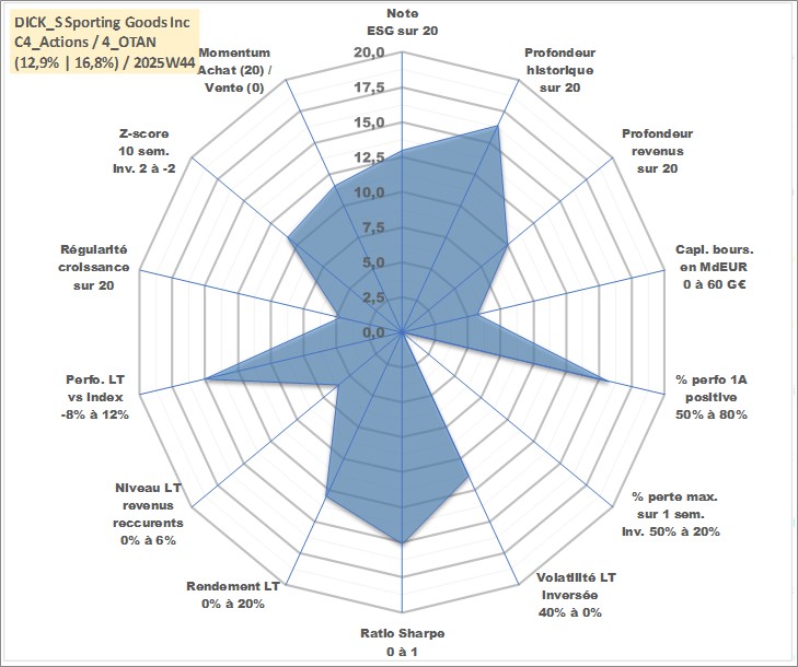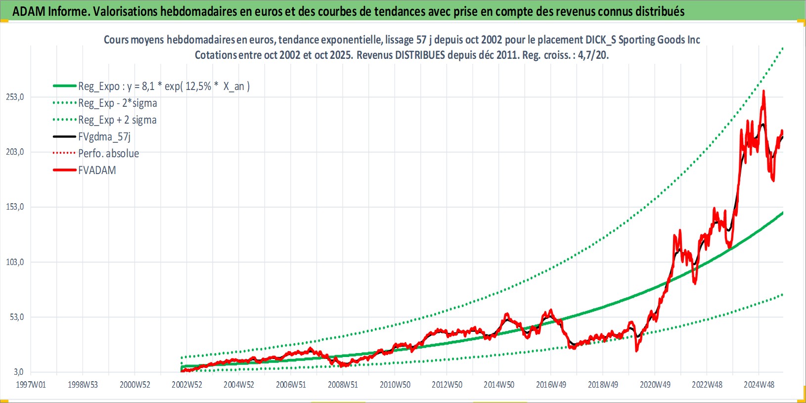 Site dédié aux investisseursPage dédiée sur site financeAnalyse des valorisations hebdomadaires de l'action DICK_S Sporting Goods Inc. Cet actif est cote en USD. Les valorisations sont en contrevaleur EURO et couvrent les semaines 2002W42 a 2025W44. Les revenus de cet actif financier sont pris en compte depuis la semaine 2011W49. La note globale ESG de cet actif est estimee a 13.0 (apres rebasage entre 0 et 20).