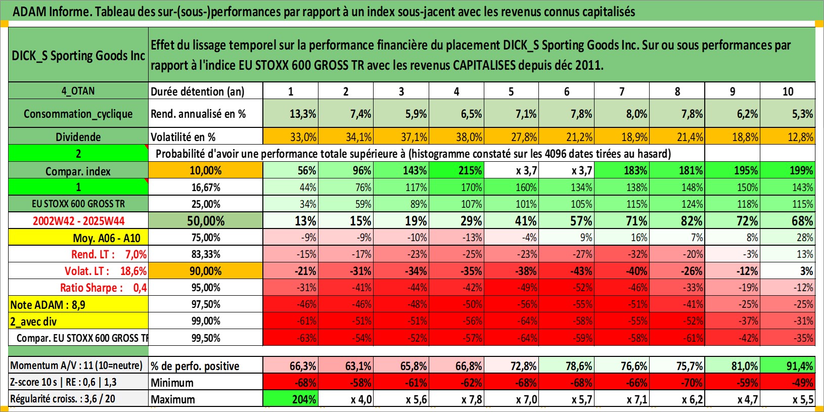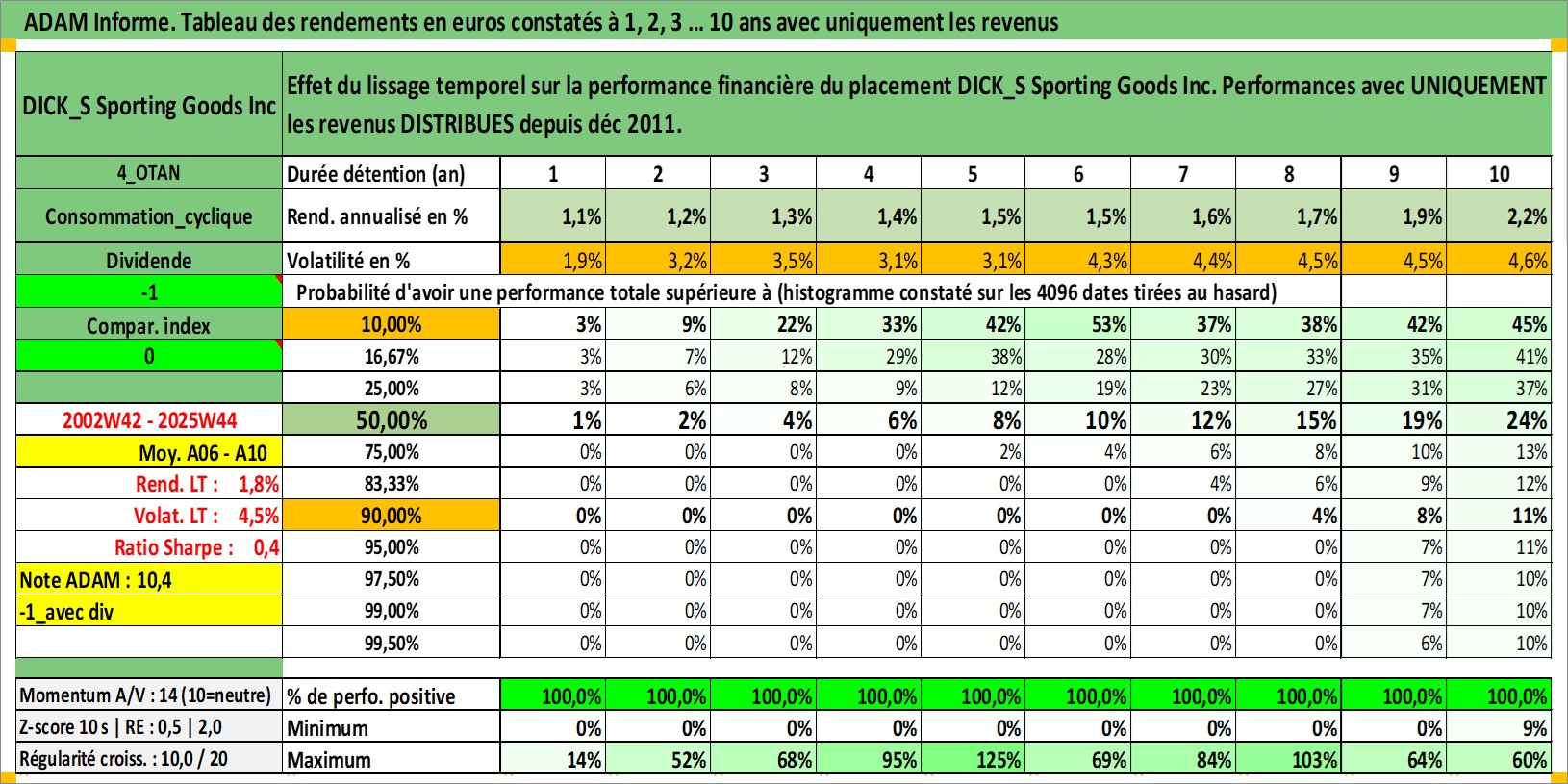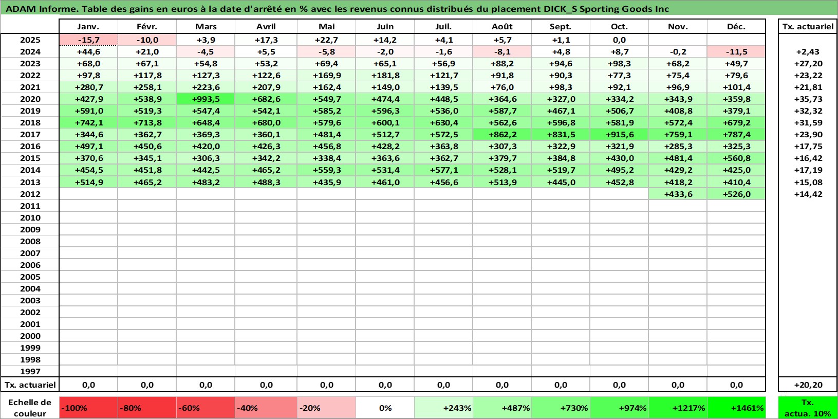 Site dédié aux investisseursPage dédiée sur site financeAnalyse des valorisations hebdomadaires de l'action DICK_S Sporting Goods Inc. Cet actif est cote en USD. Les valorisations sont en contrevaleur EURO et couvrent les semaines 2002W42 a 2025W44. Les revenus de cet actif financier sont pris en compte depuis la semaine 2011W49. La note globale ESG de cet actif est estimee a 13.0 (apres rebasage entre 0 et 20).