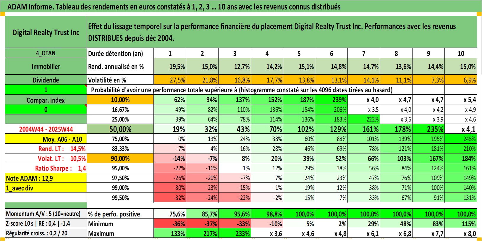 Site dédié aux investisseursPage dédiée sur site financeAnalyse des valorisations hebdomadaires de l'action Digital Realty Trust Inc. Cet actif est cote en USD. Les valorisations sont en contrevaleur EURO et couvrent les semaines 2004W44 a 2025W44. Les revenus de cet actif financier sont pris en compte depuis la semaine 2004W53. La note globale ESG de cet actif est estimee a 15.0 (apres rebasage entre 0 et 20).