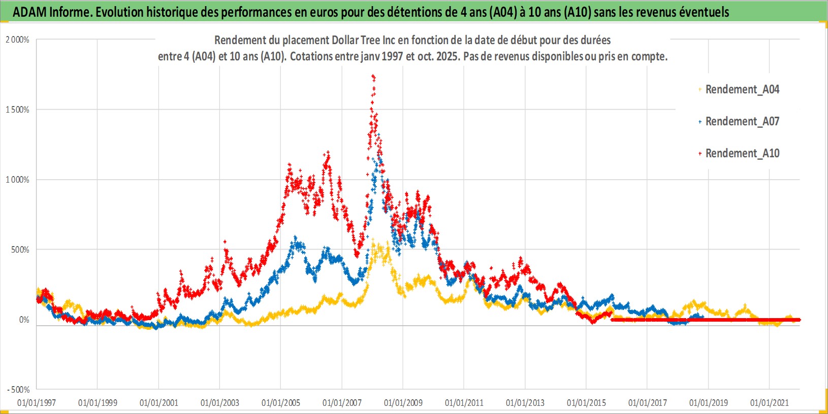 Site dédié aux investisseursPage dédiée sur site financeAnalyse des valorisations hebdomadaires de l'action Dollar Tree Inc. Cet actif est cote en USD. Les valorisations sont en contrevaleur EURO et couvrent les semaines 1997W01 a 2025W44. Les revenus de cet actif financier ne sont pas connus car non existants ou non disponibles sur le site Yahoo Finance. La note globale ESG de cet actif est estimee a 13.0 (apres rebasage entre 0 et 20).