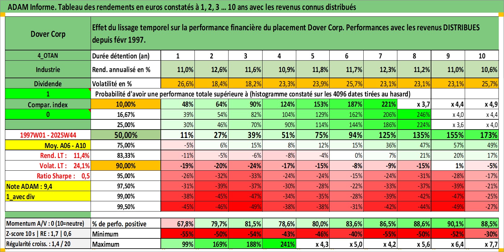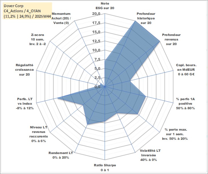 Site dédié aux investisseursPage dédiée sur site financeAnalyse des valorisations hebdomadaires de l'action Dover Corp. Cet actif est cote en USD. Les valorisations sont en contrevaleur EURO et couvrent les semaines 1997W01 a 2025W44. Les revenus de cet actif financier sont pris en compte depuis la semaine 1997W09. La note globale ESG de cet actif est estimee a 7.0 (apres rebasage entre 0 et 20).