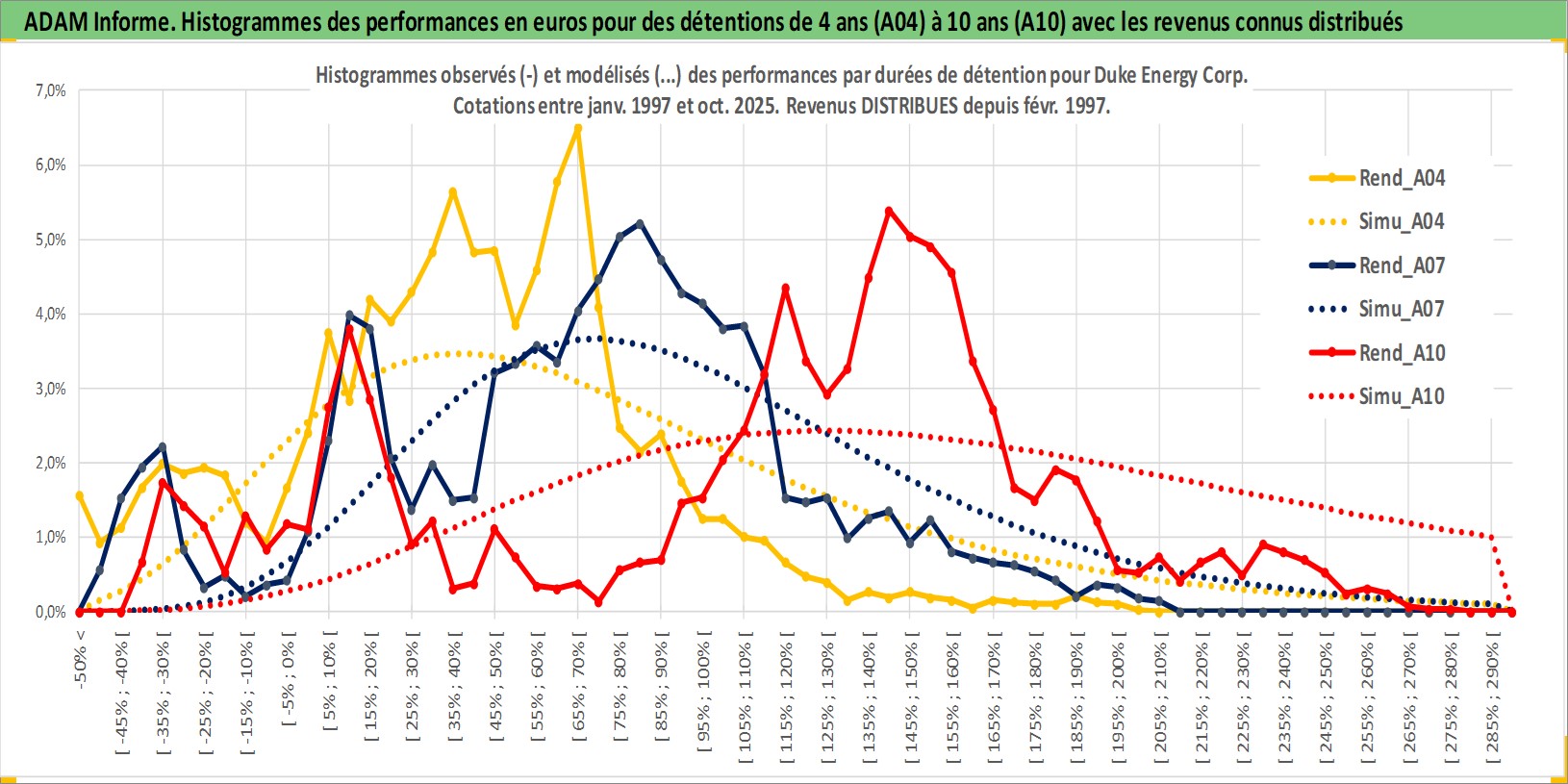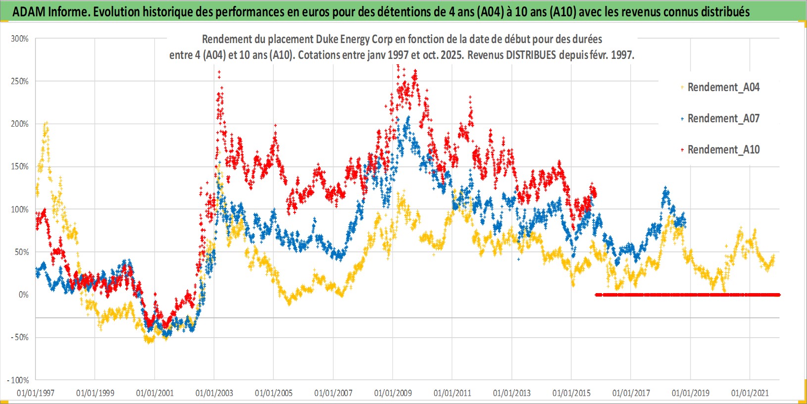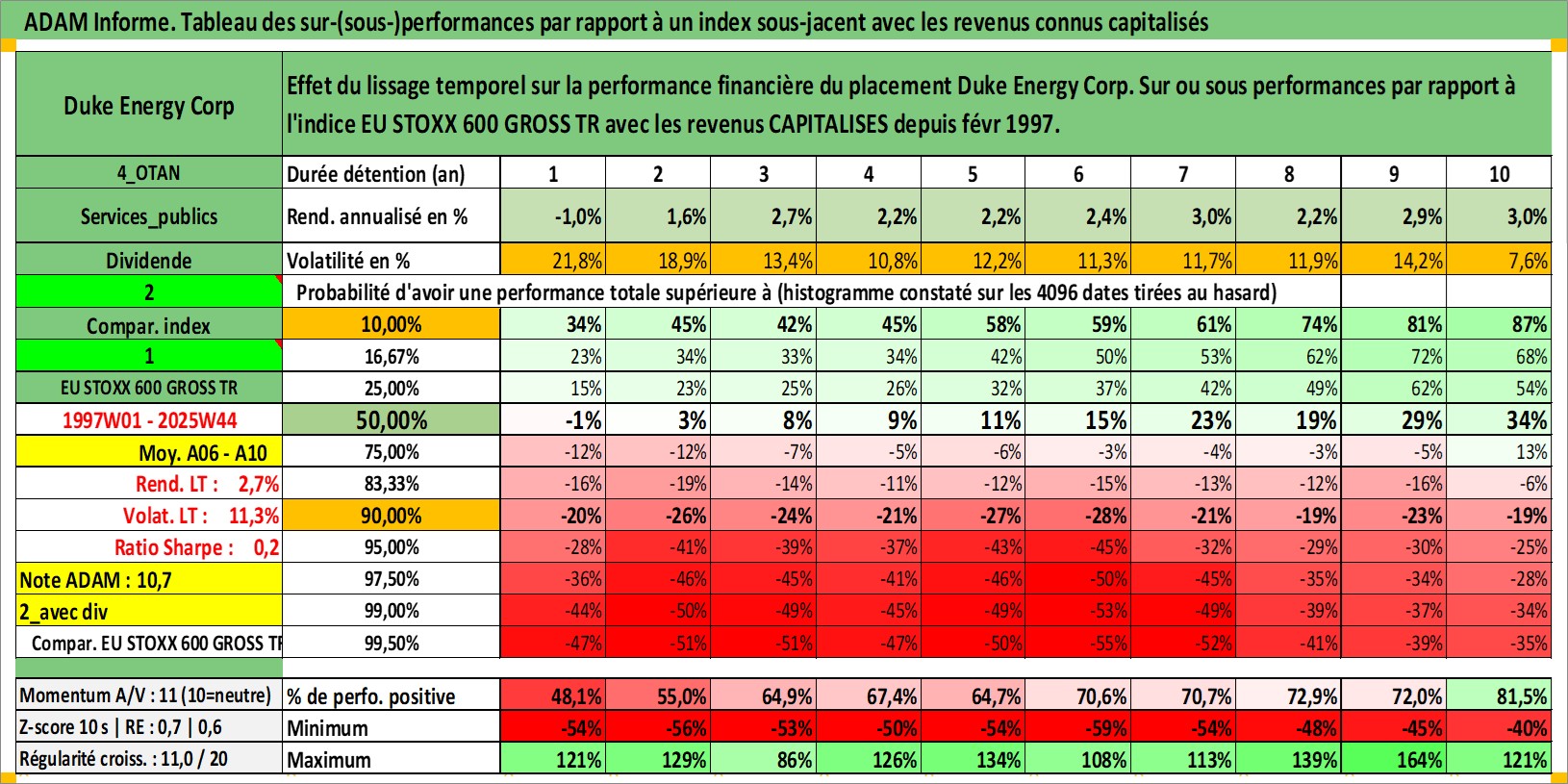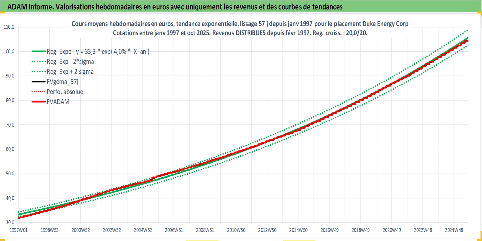 Site dédié aux investisseursPage dédiée sur site financeAnalyse des valorisations hebdomadaires de l'action Duke Energy Corp. Cet actif est cote en USD. Les valorisations sont en contrevaleur EURO et couvrent les semaines 1997W01 a 2025W44. Les revenus de cet actif financier sont pris en compte depuis la semaine 1997W07. La note globale ESG de cet actif est estimee a 6.0 (apres rebasage entre 0 et 20).