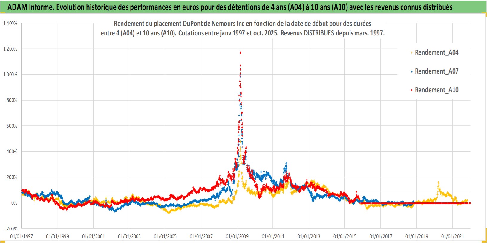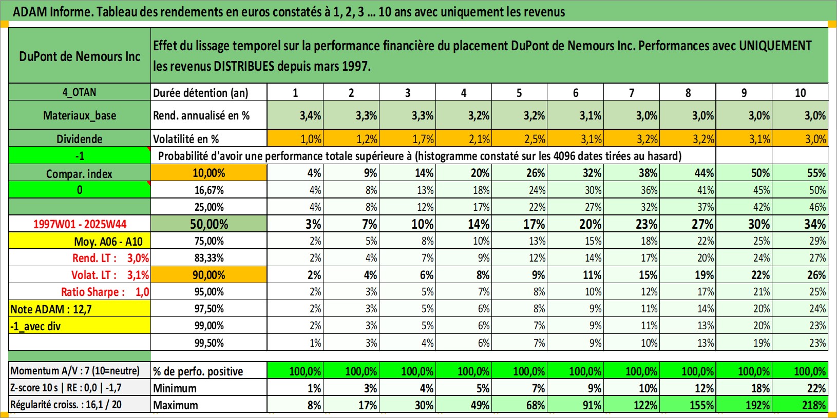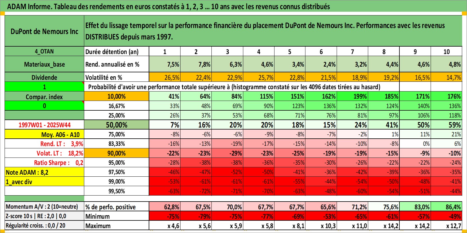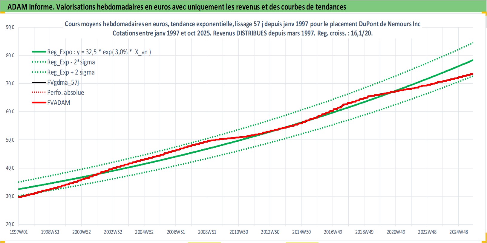 Site dédié aux investisseursPage dédiée sur site financeAnalyse des valorisations hebdomadaires de l'action DuPont de Nemours Inc. Cet actif est cote en USD. Les valorisations sont en contrevaleur EURO et couvrent les semaines 1997W01 a 2025W44. Les revenus de cet actif financier sont pris en compte depuis la semaine 1997W13. La note globale ESG de cet actif est estimee a 6.0 (apres rebasage entre 0 et 20).