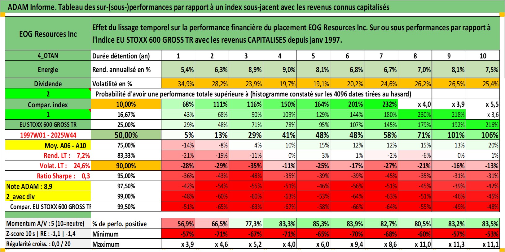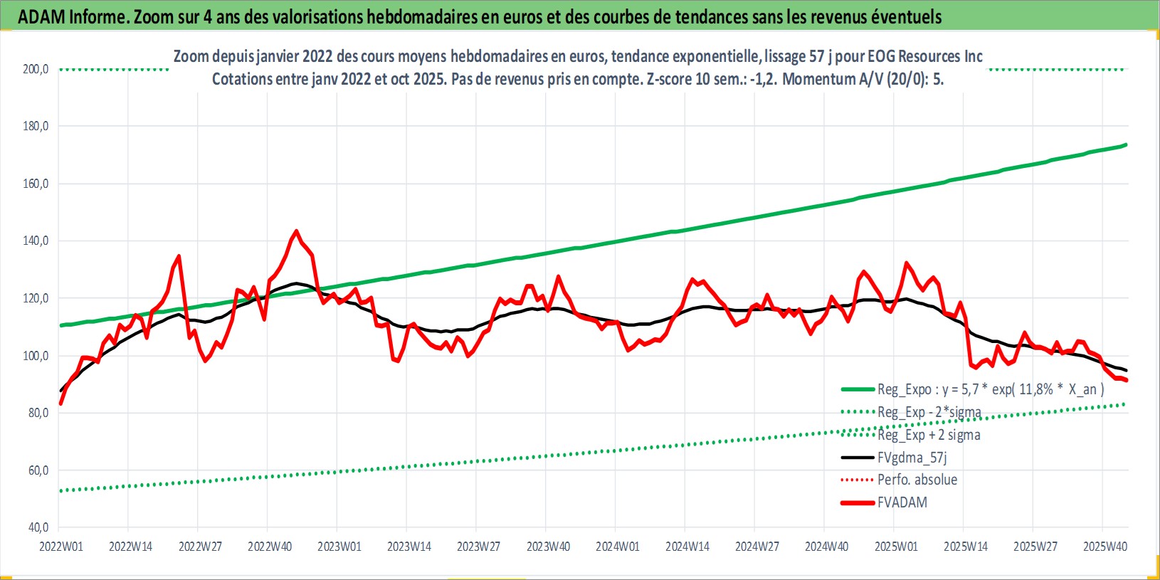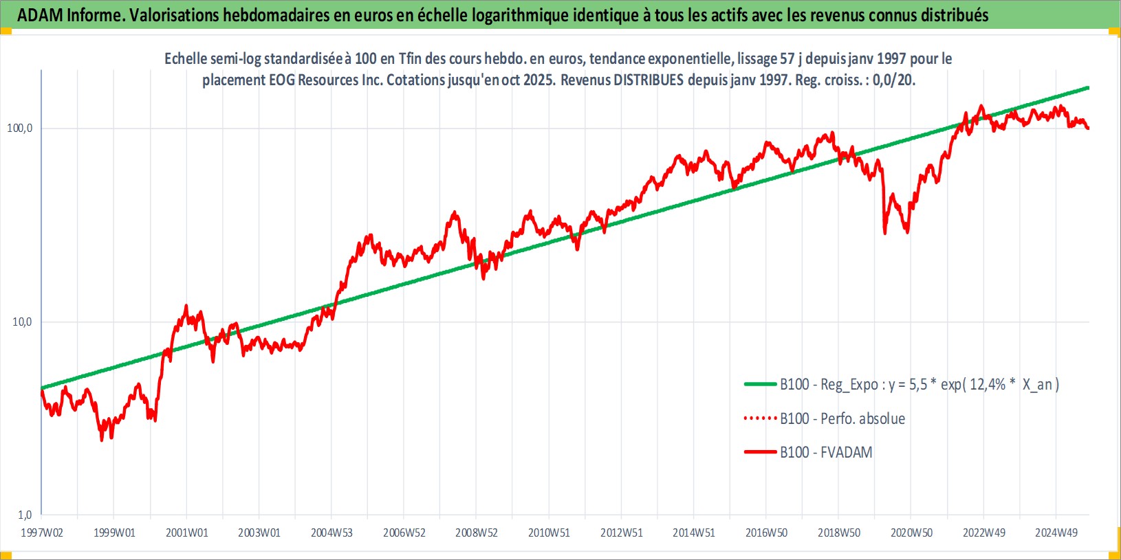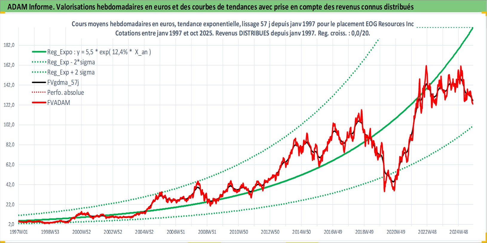 Site dédié aux investisseursPage dédiée sur site financeAnalyse des valorisations hebdomadaires de l'action EOG Resources Inc. Cet actif est cote en USD. Les valorisations sont en contrevaleur EURO et couvrent les semaines 1997W01 a 2025W44. Les revenus de cet actif financier sont pris en compte depuis la semaine 1997W03. La note globale ESG de cet actif est estimee a 3.0 (apres rebasage entre 0 et 20).