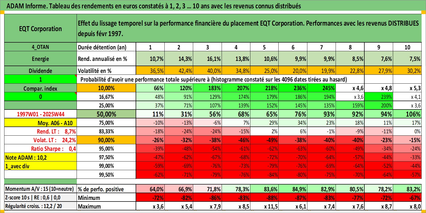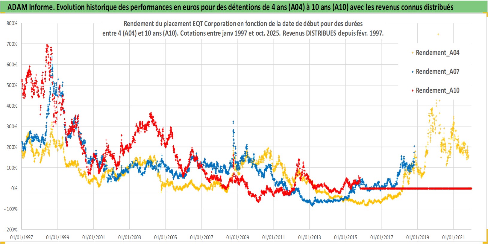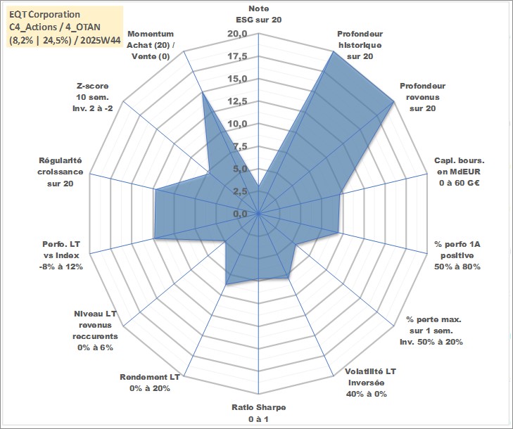 Site dédié aux investisseursPage dédiée sur site financeAnalyse des valorisations hebdomadaires de l'action EQT Corporation. Cet actif est cote en USD. Les valorisations sont en contrevaleur EURO et couvrent les semaines 1997W01 a 2025W44. Les revenus de cet actif financier sont pris en compte depuis la semaine 1997W07. La note globale ESG de cet actif est estimee a 3.0 (apres rebasage entre 0 et 20).