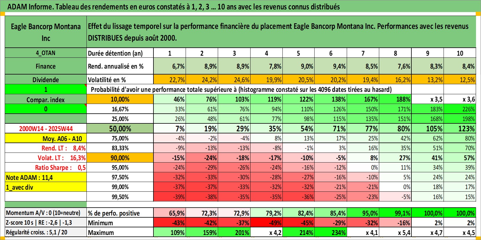 Site dédié aux investisseursPage dédiée sur site financeAnalyse des valorisations hebdomadaires de l'action Eagle Bancorp Montana Inc. Cet actif est cote en USD. Les valorisations sont en contrevaleur EURO et couvrent les semaines 2000W14 a 2025W44. Les revenus de cet actif financier sont pris en compte depuis la semaine 2000W31. La note ESG de cet actif n'est pas connue.