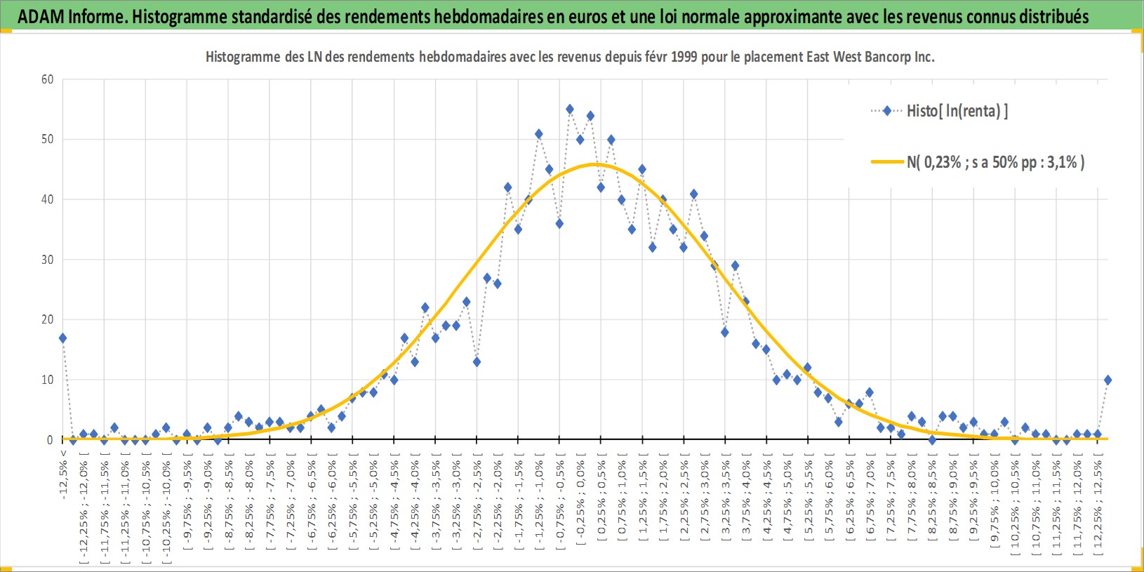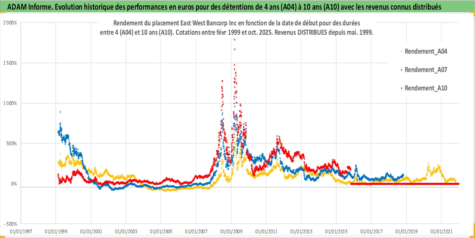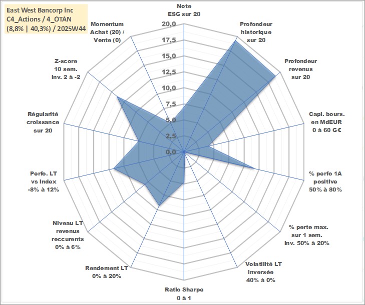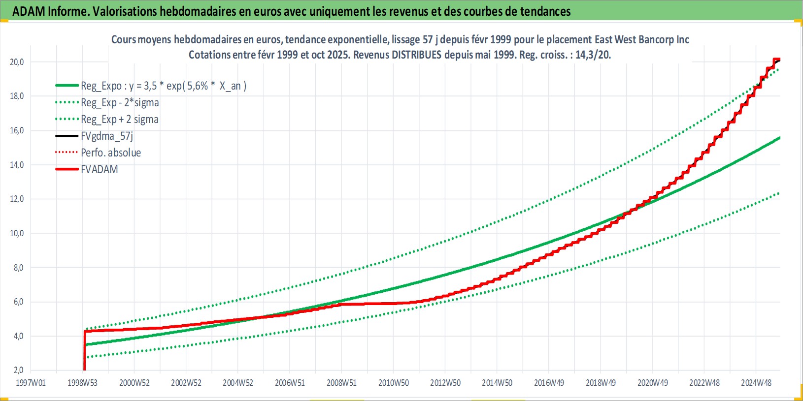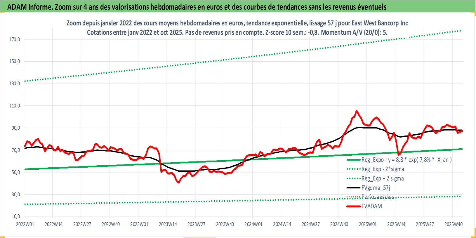 Site dédié aux investisseursPage dédiée sur site financeAnalyse des valorisations hebdomadaires de l'action East West Bancorp Inc. Cet actif est cote en USD. Les valorisations sont en contrevaleur EURO et couvrent les semaines 1999W05 a 2025W44. Les revenus de cet actif financier sont pris en compte depuis la semaine 1999W18. La note globale ESG de cet actif est estimee a 7.0 (apres rebasage entre 0 et 20).