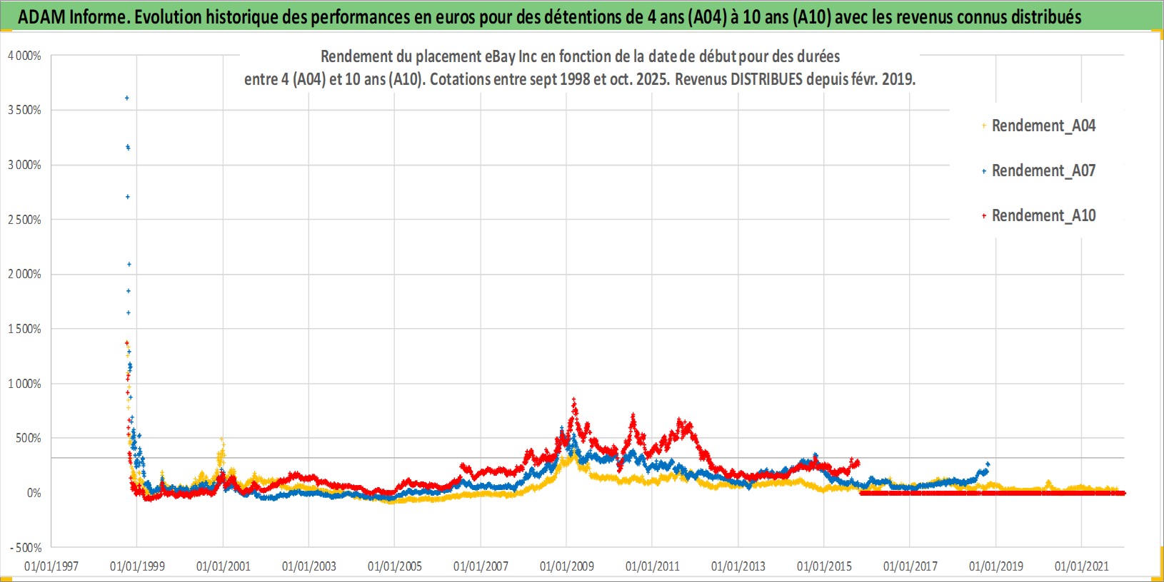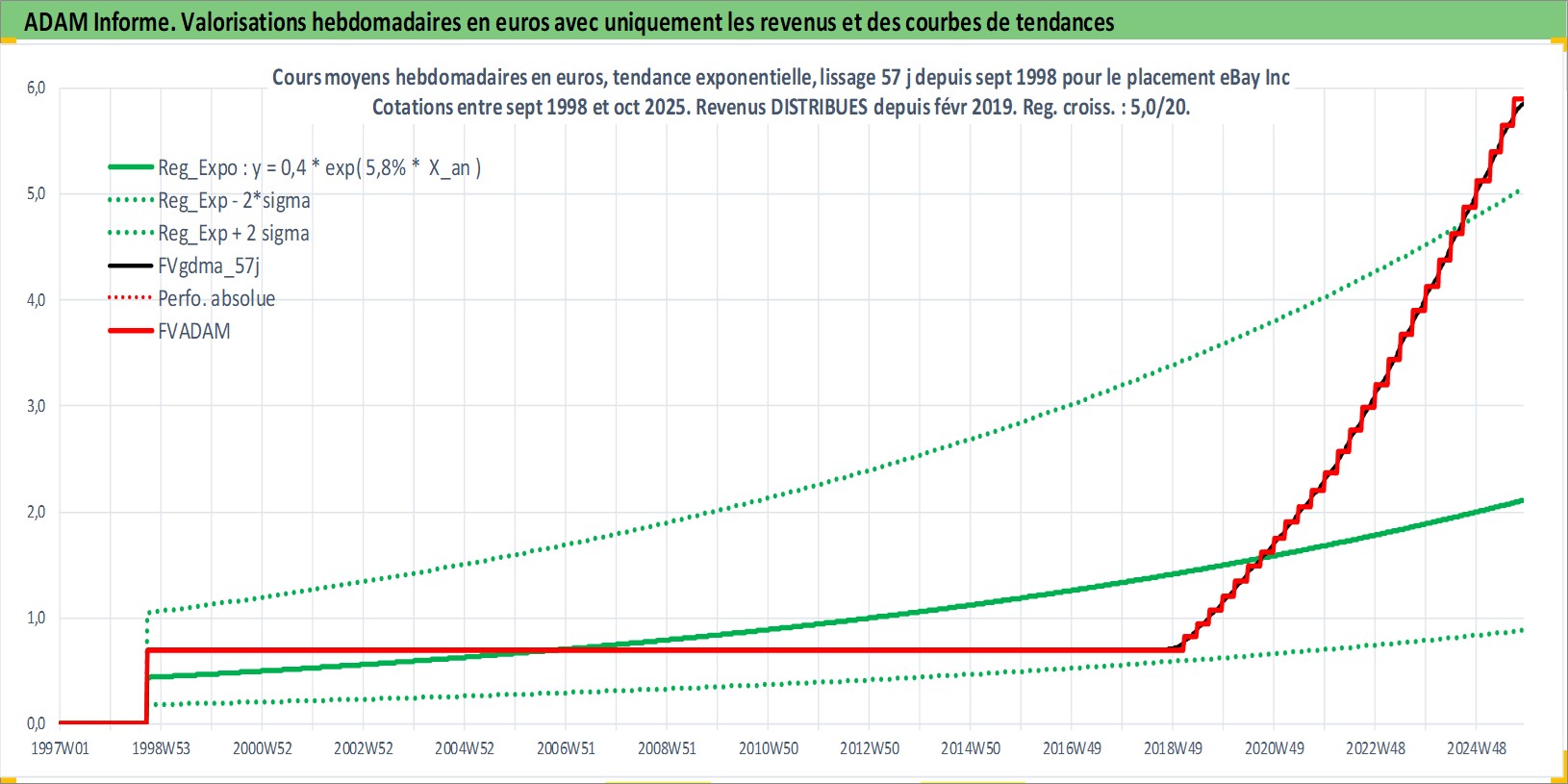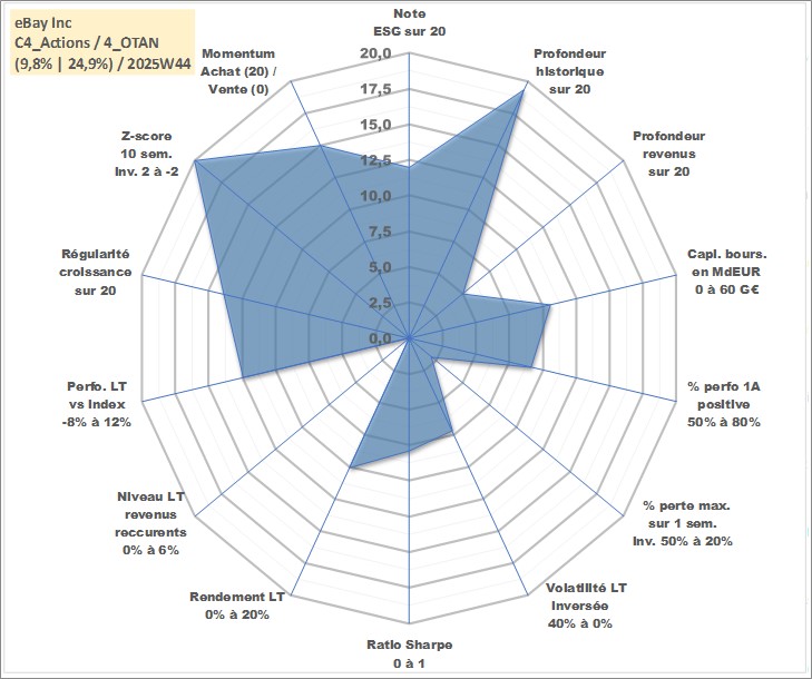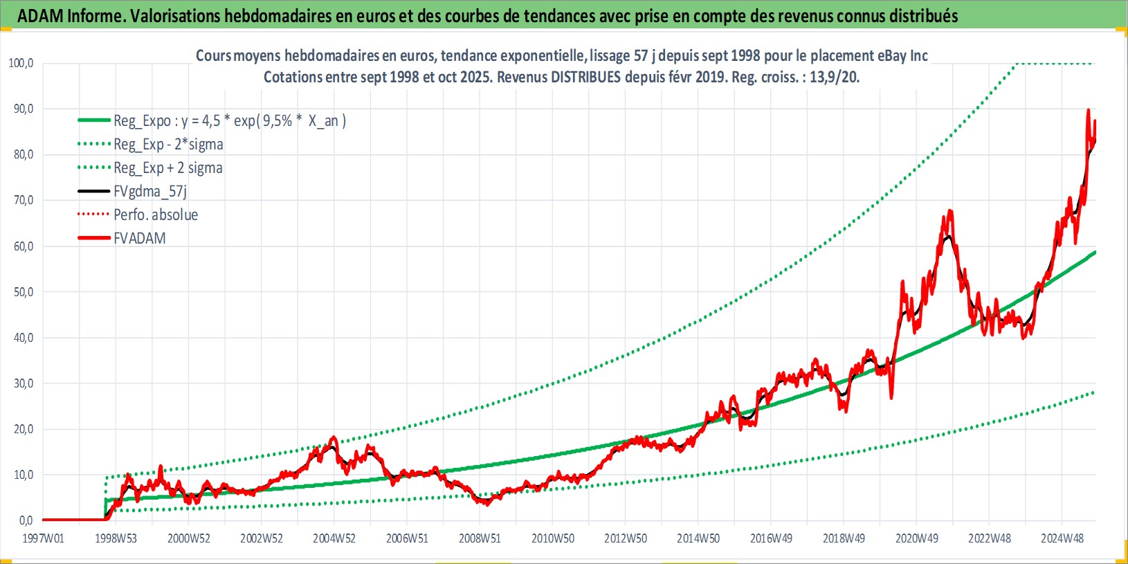 Site dédié aux investisseursPage dédiée sur site financeAnalyse des valorisations hebdomadaires de l'action eBay Inc. Cet actif est cote en USD. Les valorisations sont en contrevaleur EURO et couvrent les semaines 1998W39 a 2025W44. Les revenus de cet actif financier sont pris en compte depuis la semaine 2019W09. La note globale ESG de cet actif est estimee a 12.0 (apres rebasage entre 0 et 20).