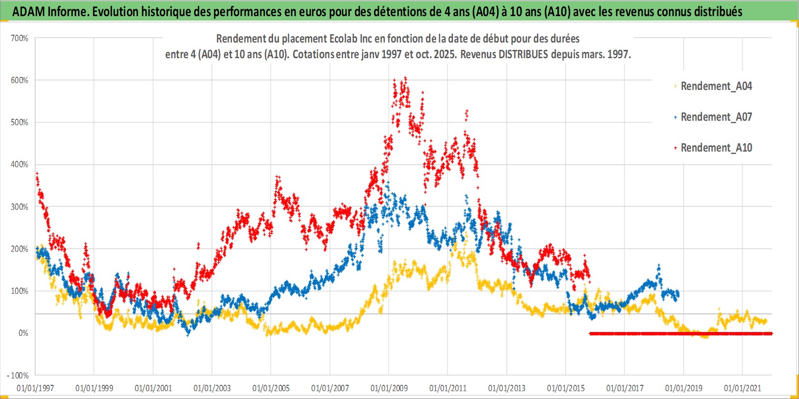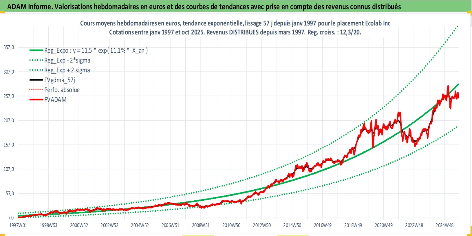 Site dédié aux investisseursPage dédiée sur site financeAnalyse des valorisations hebdomadaires de l'action Ecolab Inc. Cet actif est cote en USD. Les valorisations sont en contrevaleur EURO et couvrent les semaines 1997W01 a 2025W44. Les revenus de cet actif financier sont pris en compte depuis la semaine 1997W11. La note globale ESG de cet actif est estimee a 8.0 (apres rebasage entre 0 et 20).