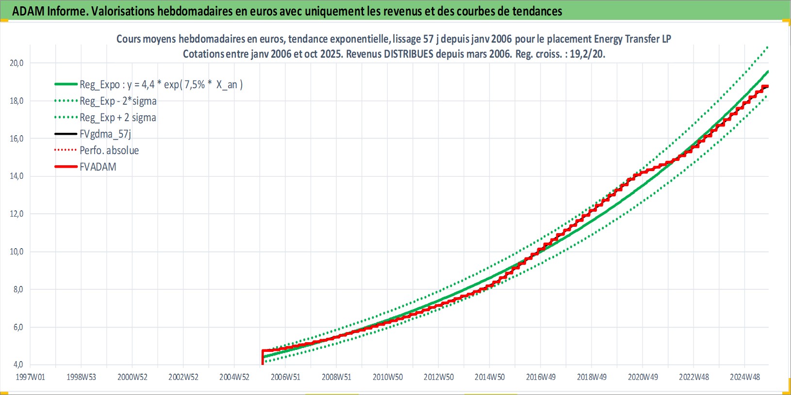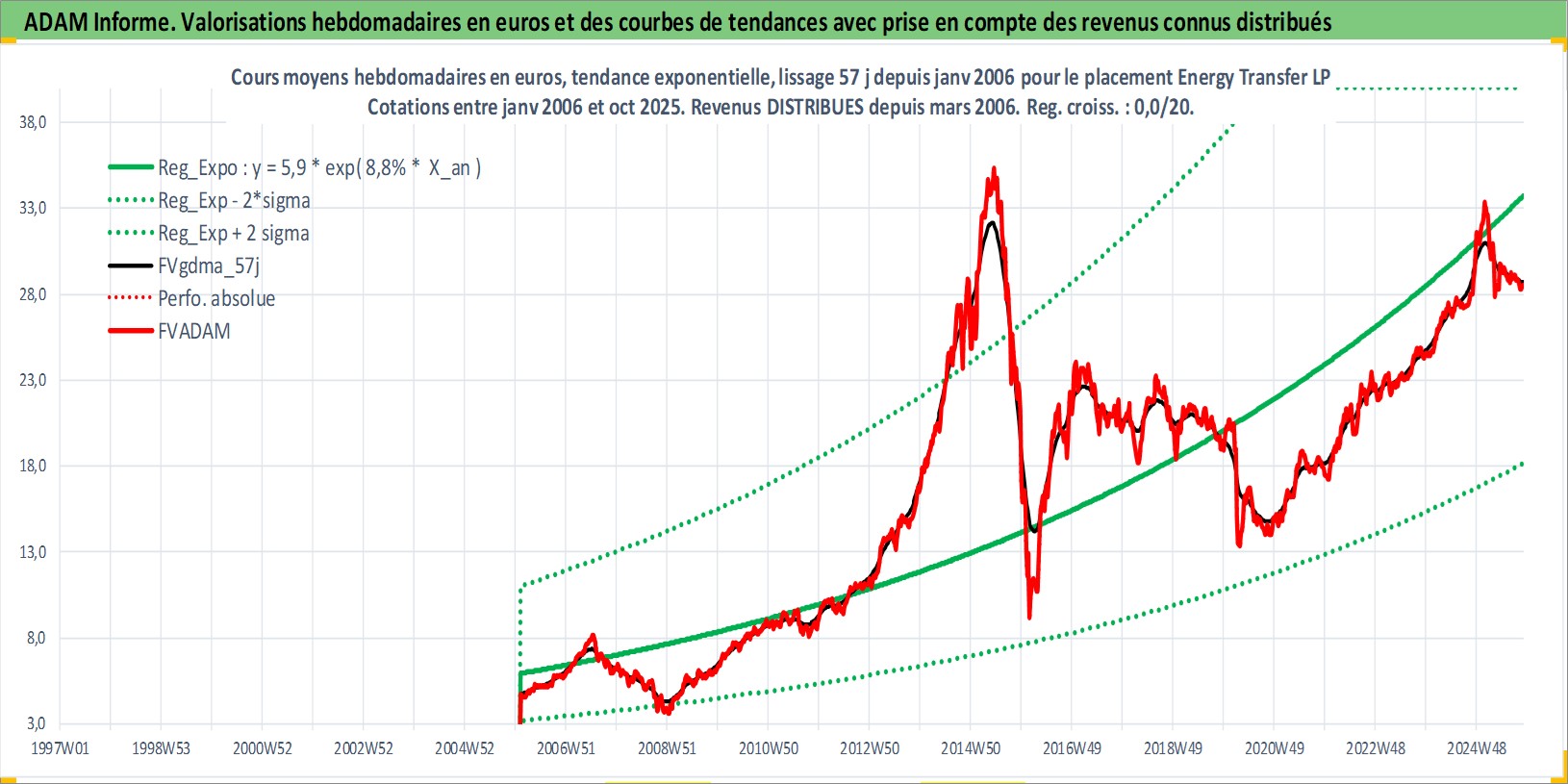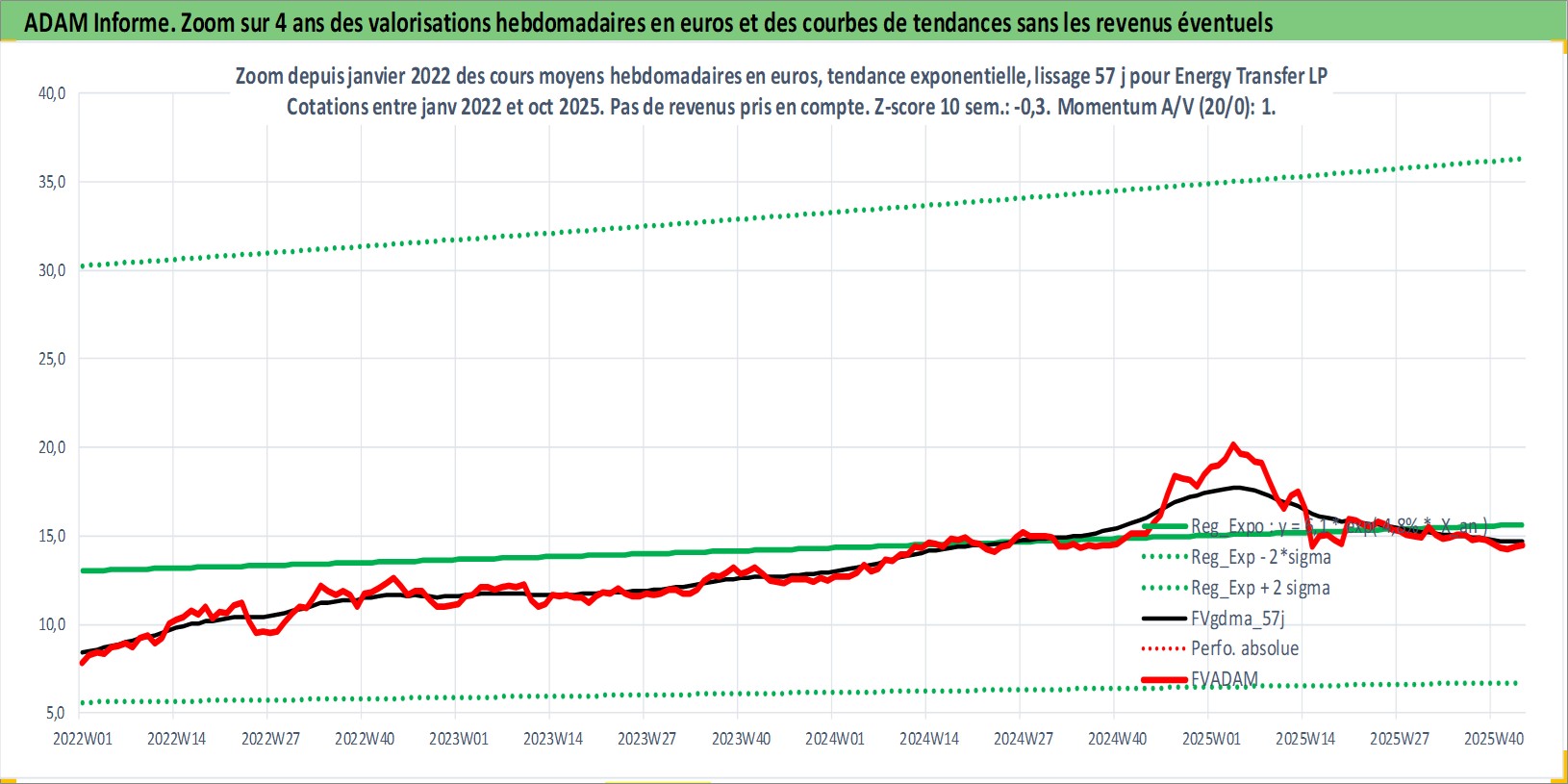 Site dédié aux investisseursPage dédiée sur site financeAnalyse des valorisations hebdomadaires de l'action Energy Transfer LP. Cet actif est cote en USD. Les valorisations sont en contrevaleur EURO et couvrent les semaines 2006W05 a 2025W44. Les revenus de cet actif financier sont pris en compte depuis la semaine 2006W13. La note ESG de cet actif n'est pas connue.