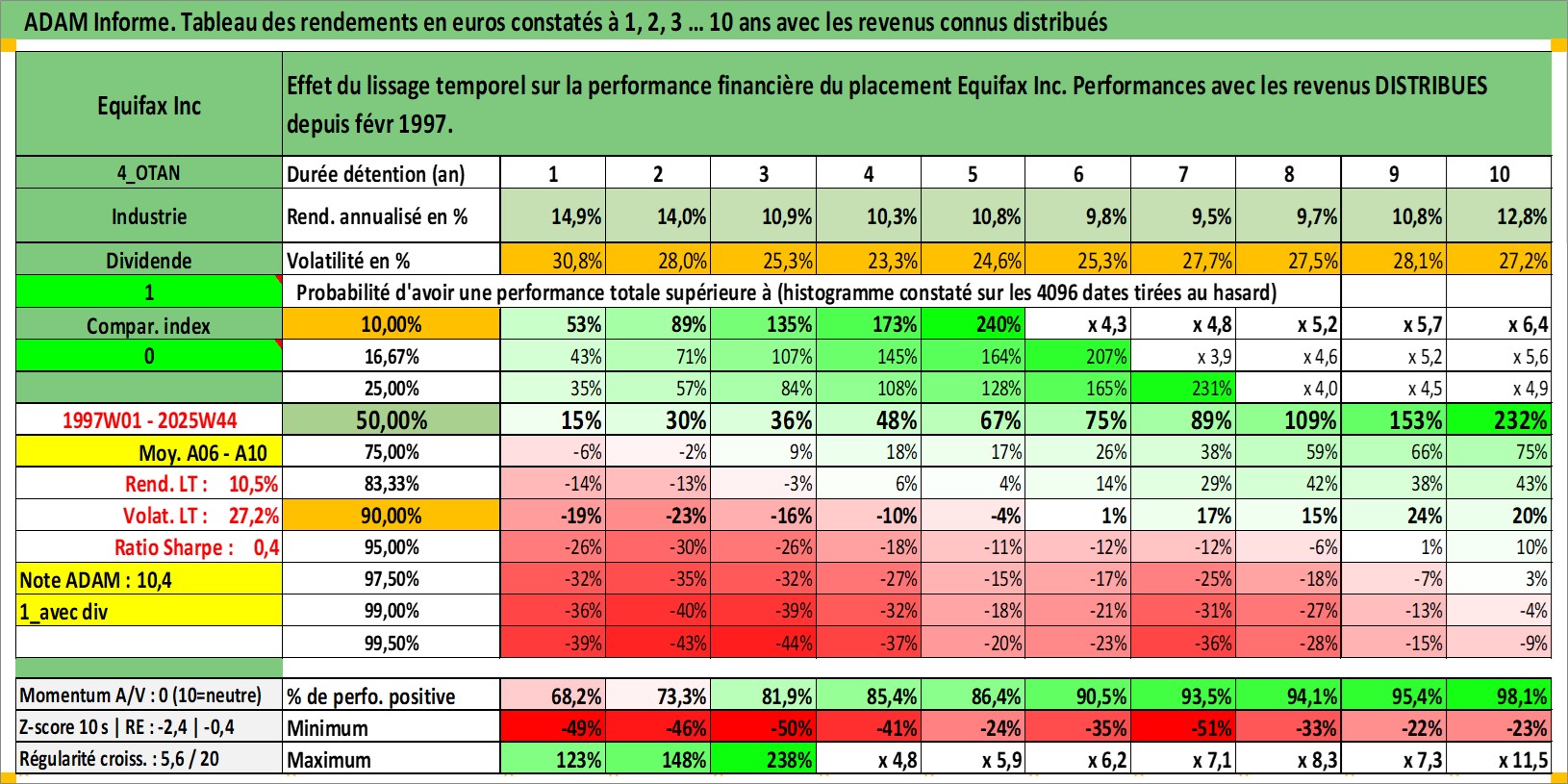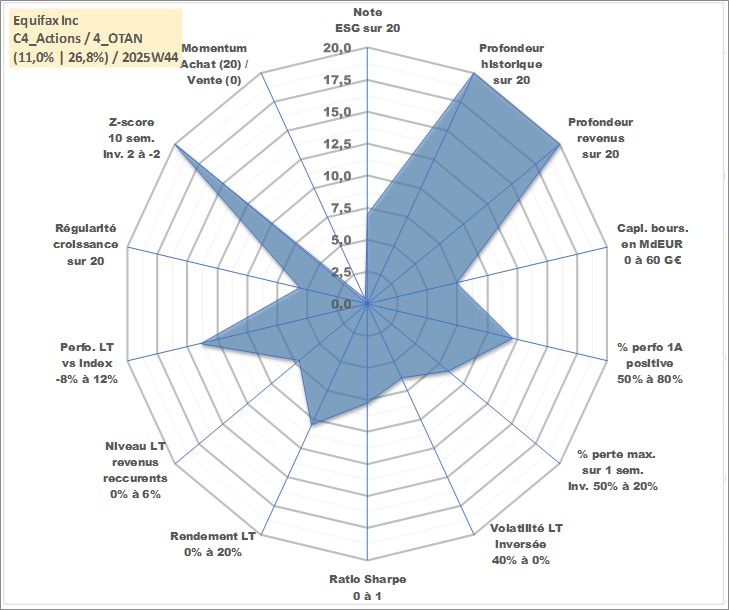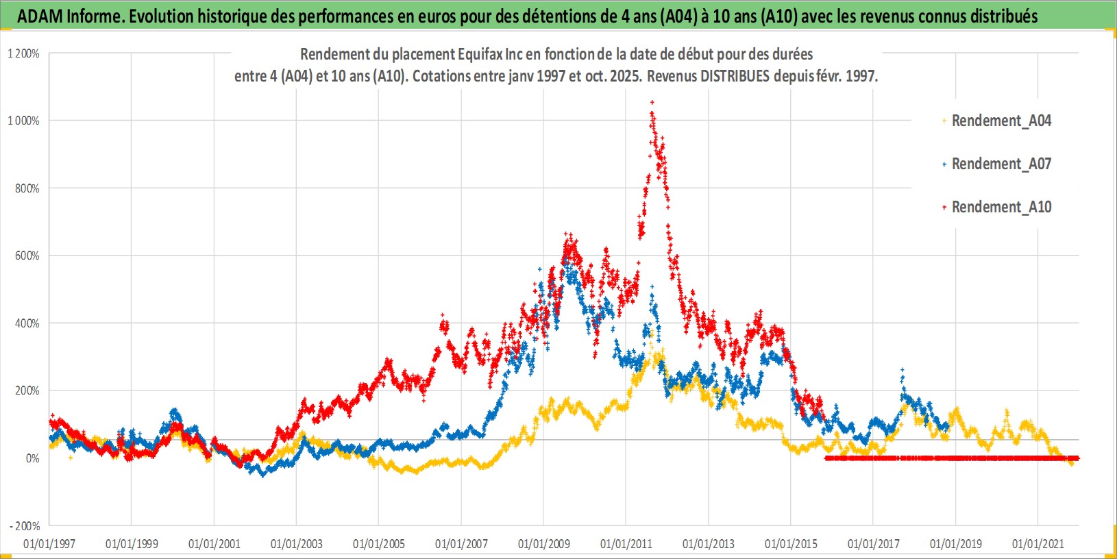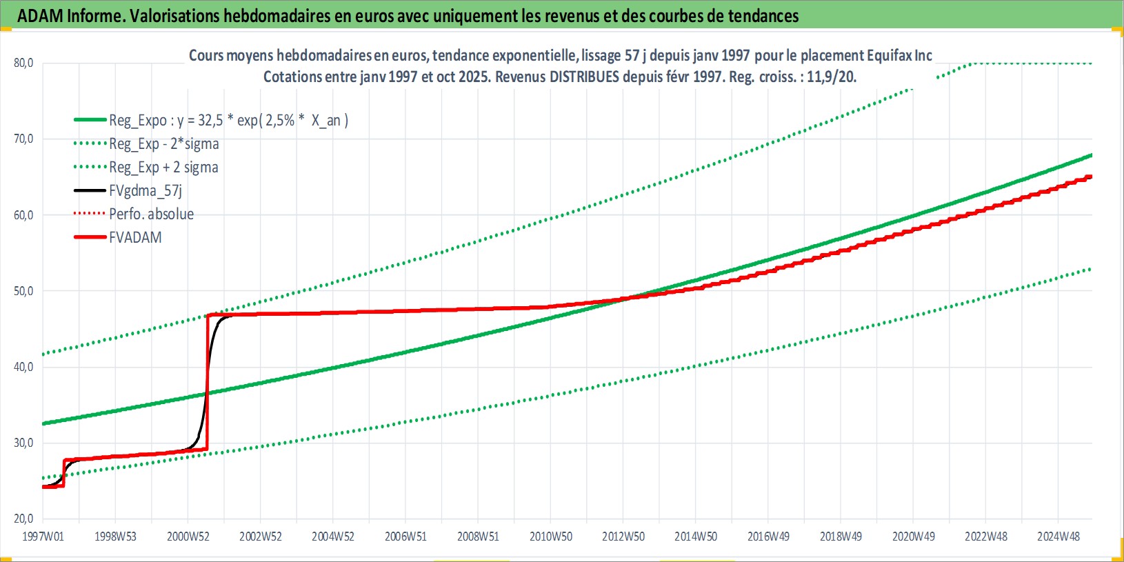 Site dédié aux investisseursPage dédiée sur site financeAnalyse des valorisations hebdomadaires de l'action Equifax Inc. Cet actif est cote en USD. Les valorisations sont en contrevaleur EURO et couvrent les semaines 1997W01 a 2025W44. Les revenus de cet actif financier sont pris en compte depuis la semaine 1997W08. La note globale ESG de cet actif est estimee a 7.0 (apres rebasage entre 0 et 20).