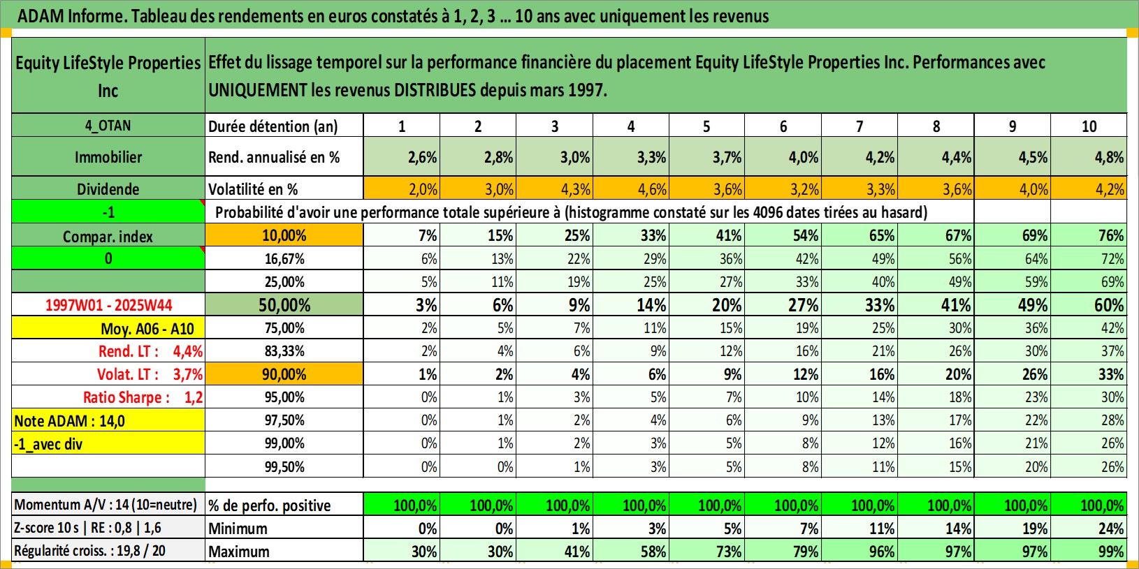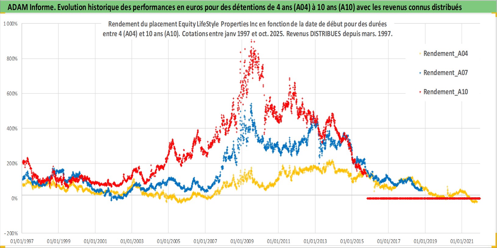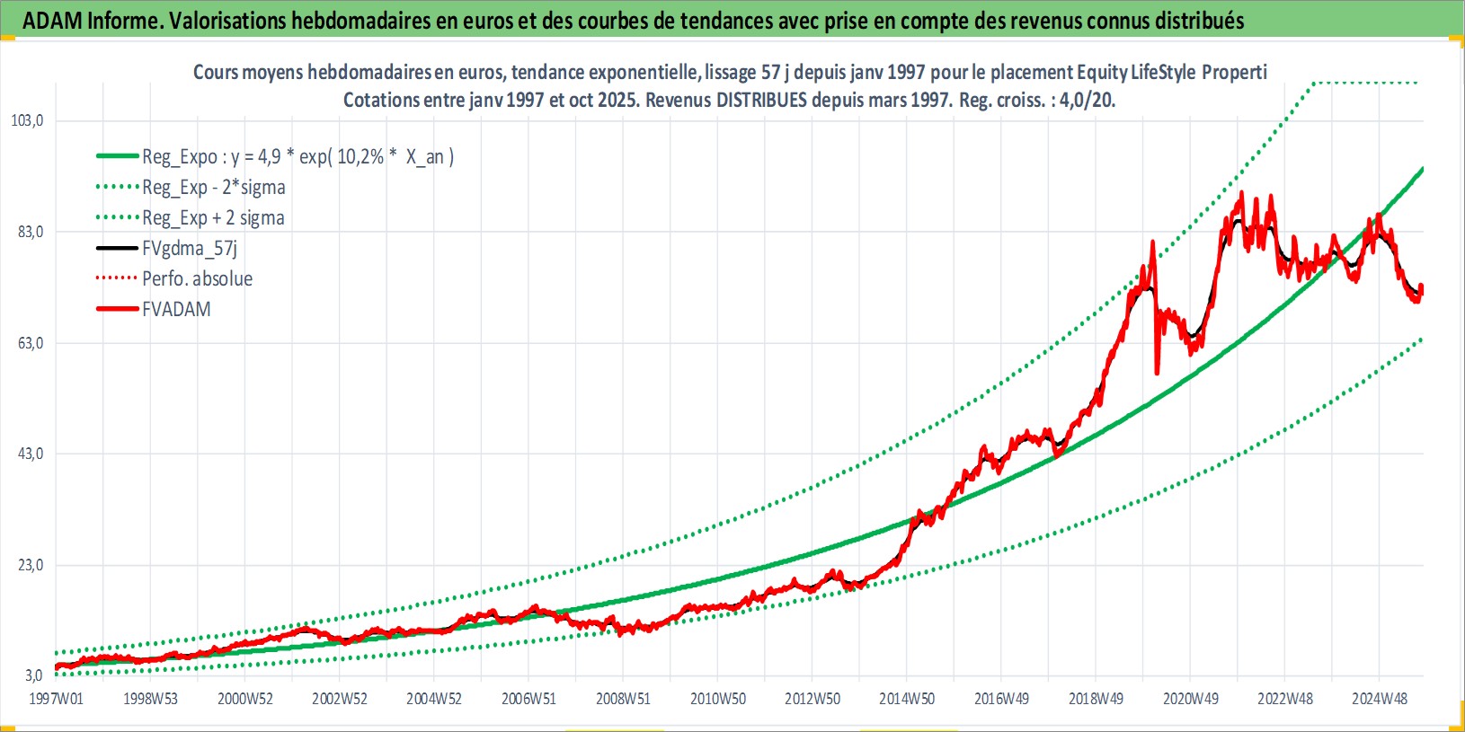 Site dédié aux investisseursPage dédiée sur site financeAnalyse des valorisations hebdomadaires de l'action Equity LifeStyle Properties Inc. Cet actif est cote en USD. Les valorisations sont en contrevaleur EURO et couvrent les semaines 1997W01 a 2025W44. Les revenus de cet actif financier sont pris en compte depuis la semaine 1997W13. La note ESG de cet actif n'est pas connue.