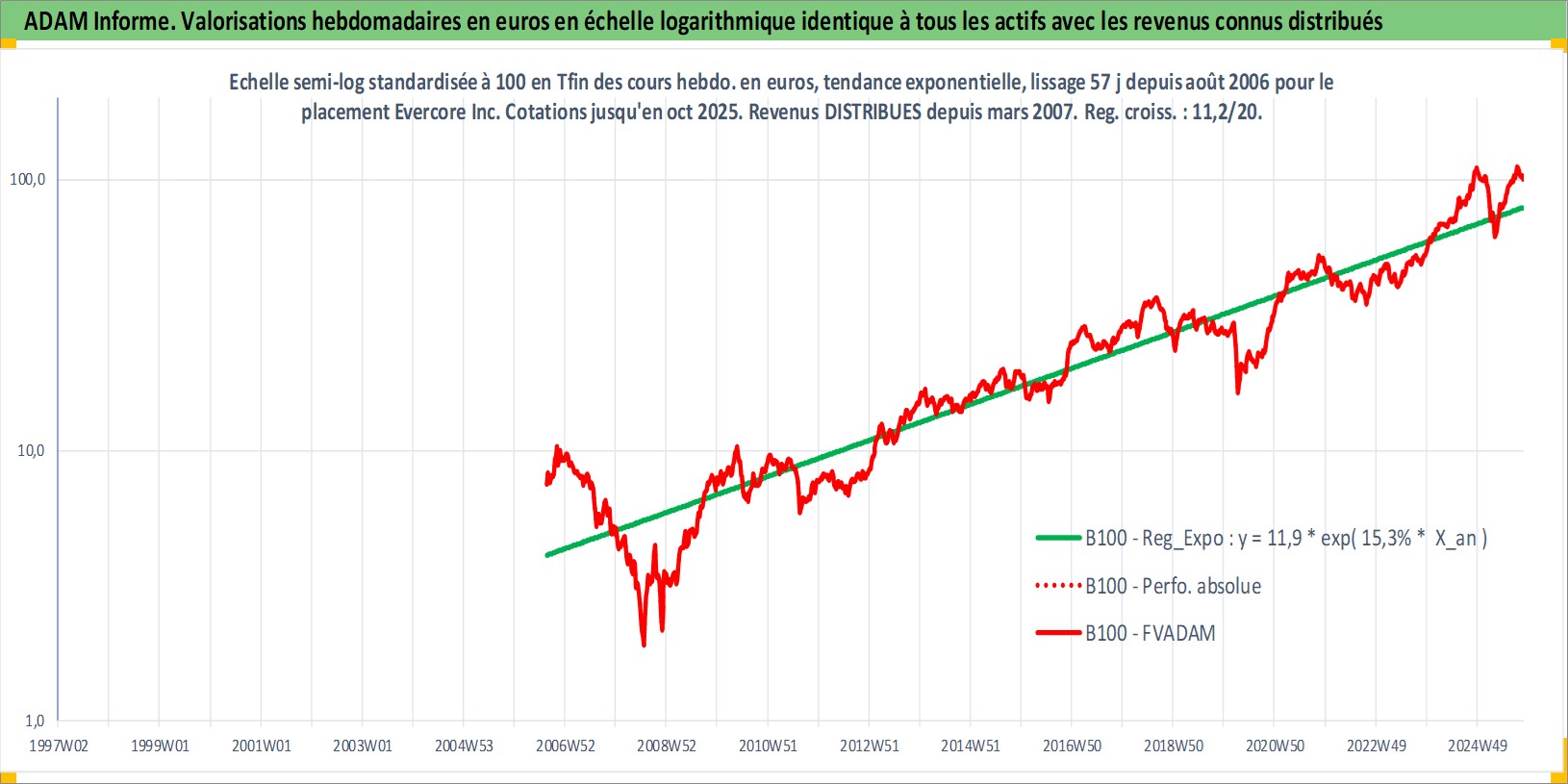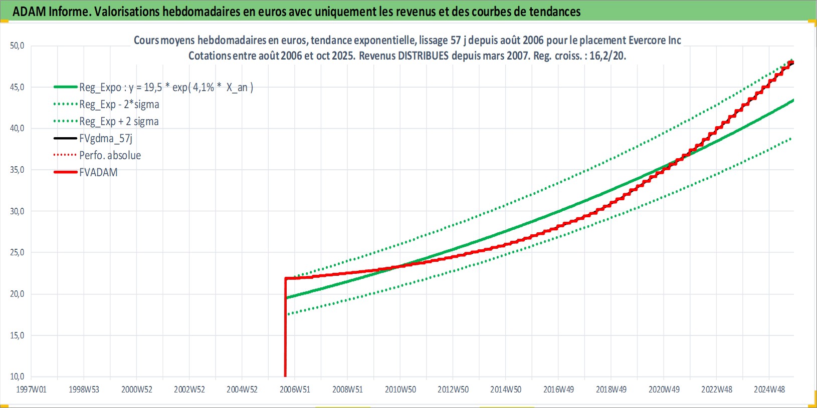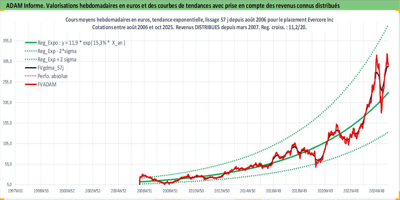 Site dédié aux investisseursPage dédiée sur site financeAnalyse des valorisations hebdomadaires de l'action Evercore Inc. Cet actif est cote en USD. Les valorisations sont en contrevaleur EURO et couvrent les semaines 2006W33 a 2025W44. Les revenus de cet actif financier sont pris en compte depuis la semaine 2007W10. La note ESG de cet actif n'est pas connue.