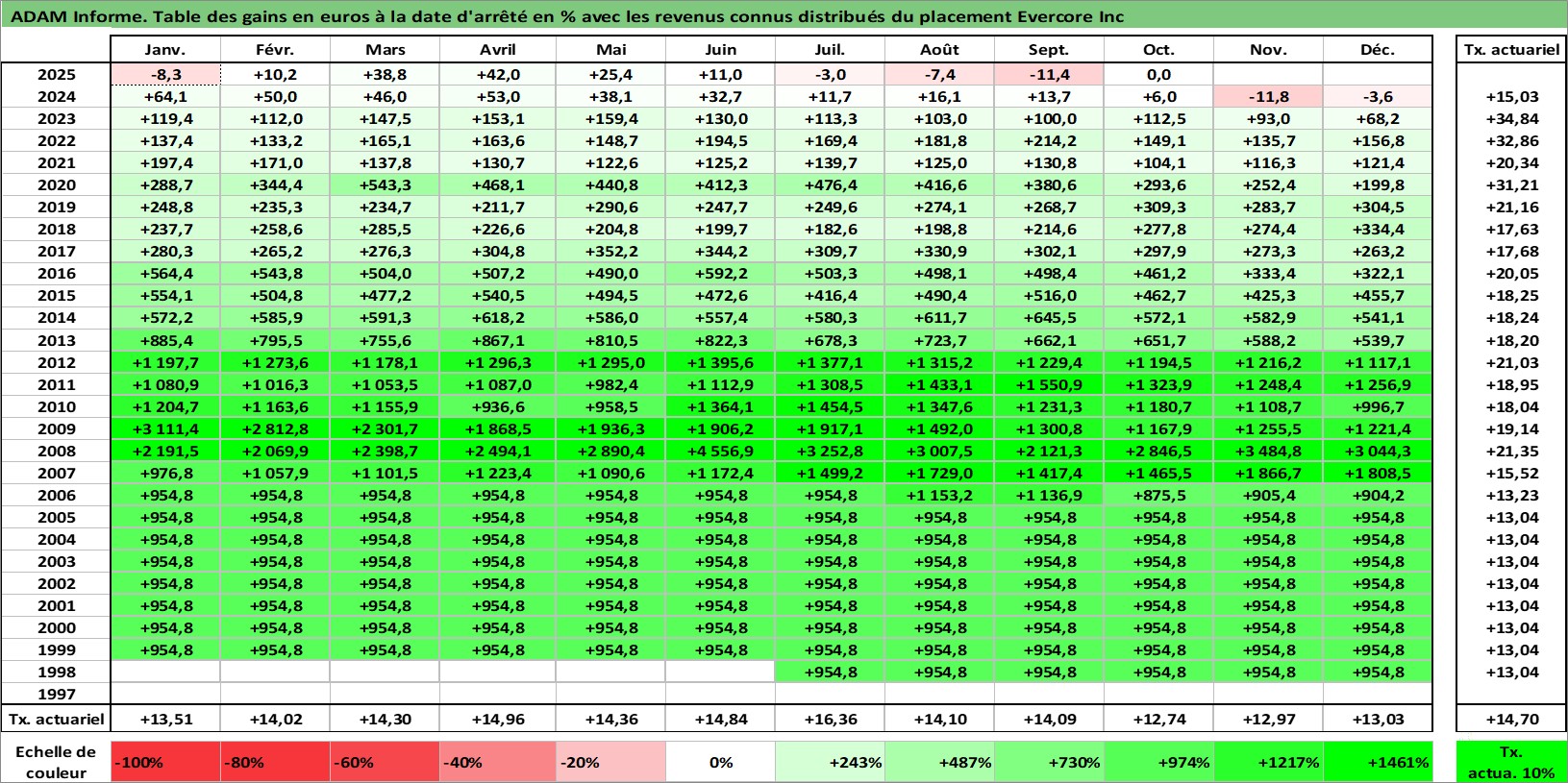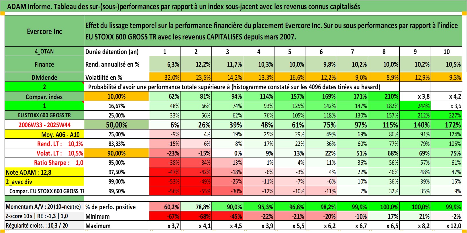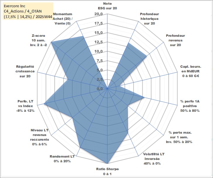 Site dédié aux investisseursPage dédiée sur site financeAnalyse des valorisations hebdomadaires de l'action Evercore Inc. Cet actif est cote en USD. Les valorisations sont en contrevaleur EURO et couvrent les semaines 2006W33 a 2025W44. Les revenus de cet actif financier sont pris en compte depuis la semaine 2007W10. La note ESG de cet actif n'est pas connue.