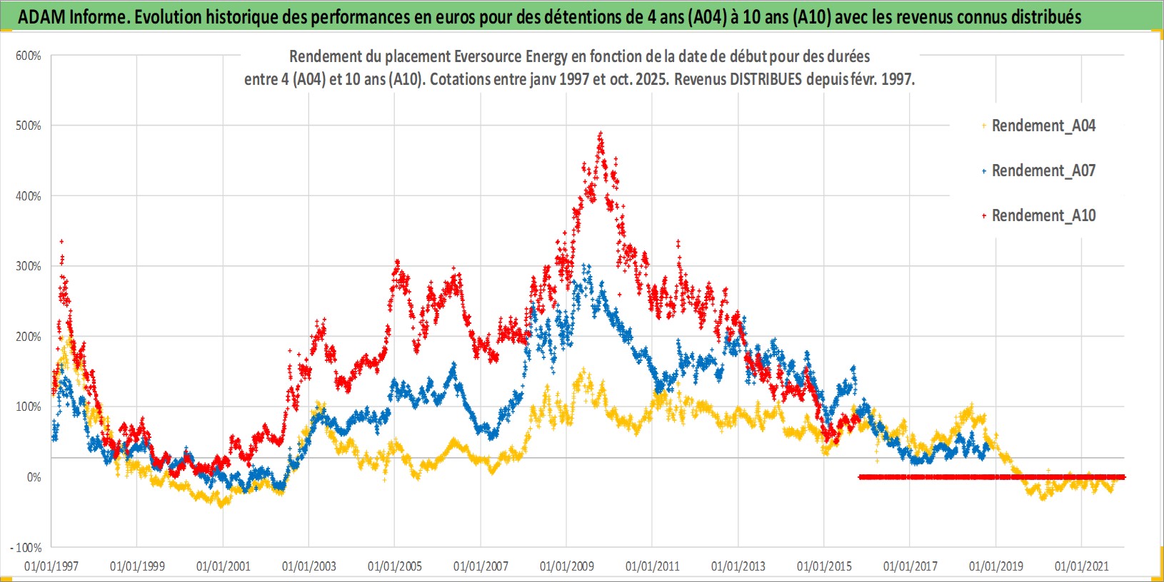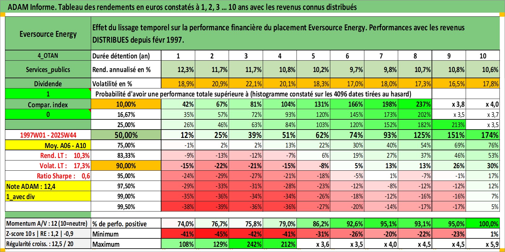Site dédié aux investisseursPage dédiée sur site financeAnalyse des valorisations hebdomadaires de l'action Eversource Energy. Cet actif est cote en USD. Les valorisations sont en contrevaleur EURO et couvrent les semaines 1997W01 a 2025W44. Les revenus de cet actif financier sont pris en compte depuis la semaine 1997W09. La note globale ESG de cet actif est estimee a 11.0 (apres rebasage entre 0 et 20).