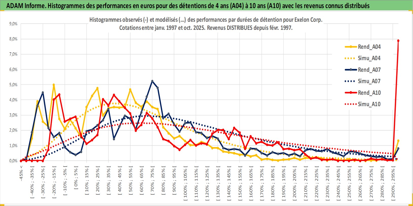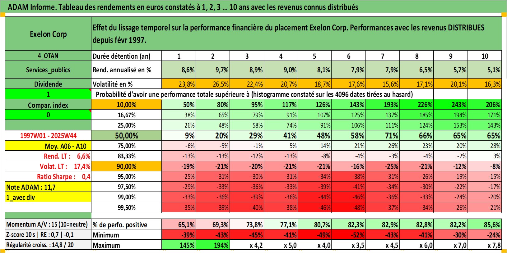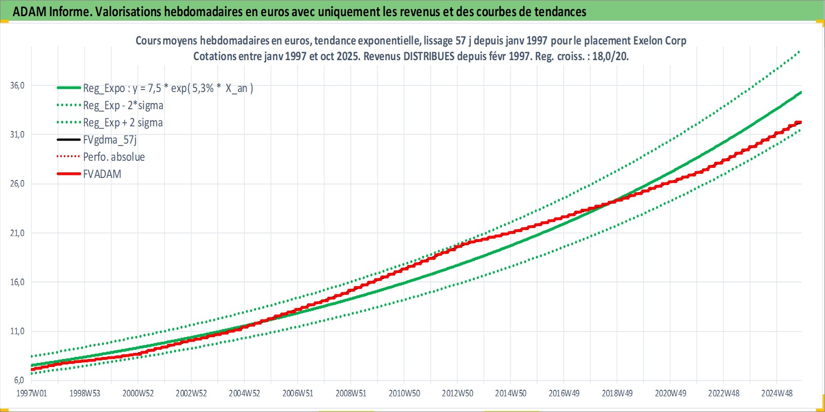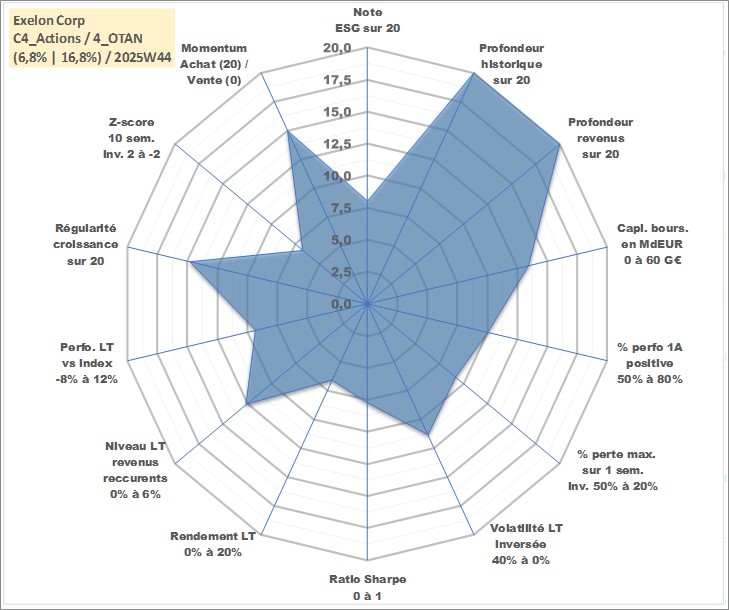 Site dédié aux investisseursPage dédiée sur site financeAnalyse des valorisations hebdomadaires de l'action Exelon Corp. Cet actif est cote en USD. Les valorisations sont en contrevaleur EURO et couvrent les semaines 1997W01 a 2025W44. Les revenus de cet actif financier sont pris en compte depuis la semaine 1997W08. La note globale ESG de cet actif est estimee a 8.0 (apres rebasage entre 0 et 20).