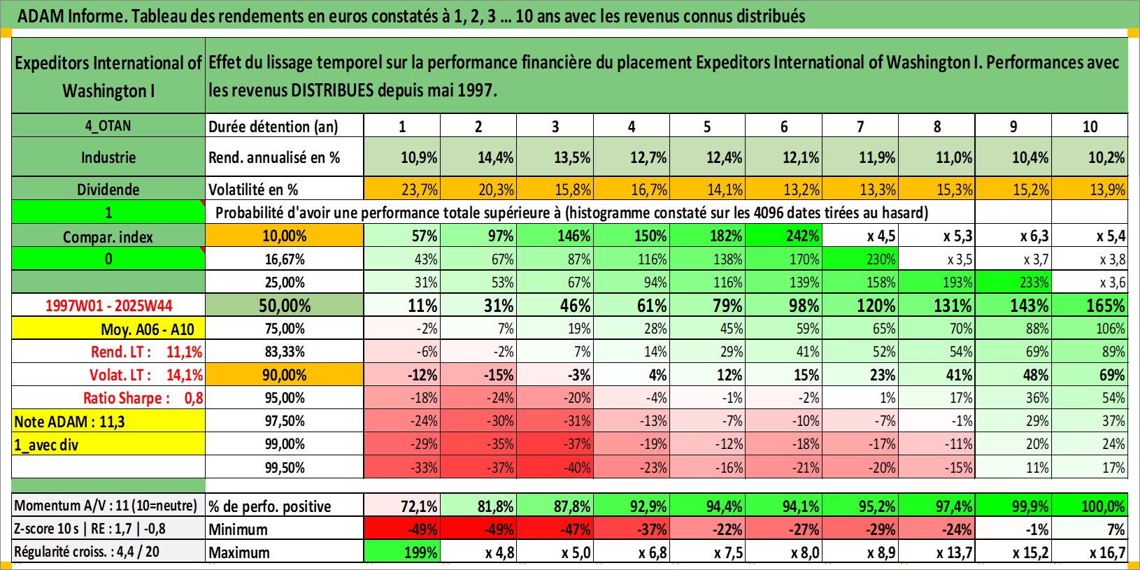 Site dédié aux investisseursPage dédiée sur site financeAnalyse des valorisations hebdomadaires de l'action Expeditors International of Washington I. Cet actif est cote en USD. Les valorisations sont en contrevaleur EURO et couvrent les semaines 1997W01 a 2025W44. Les revenus de cet actif financier sont pris en compte depuis la semaine 1997W22. La note globale ESG de cet actif est estimee a 13.0 (apres rebasage entre 0 et 20).