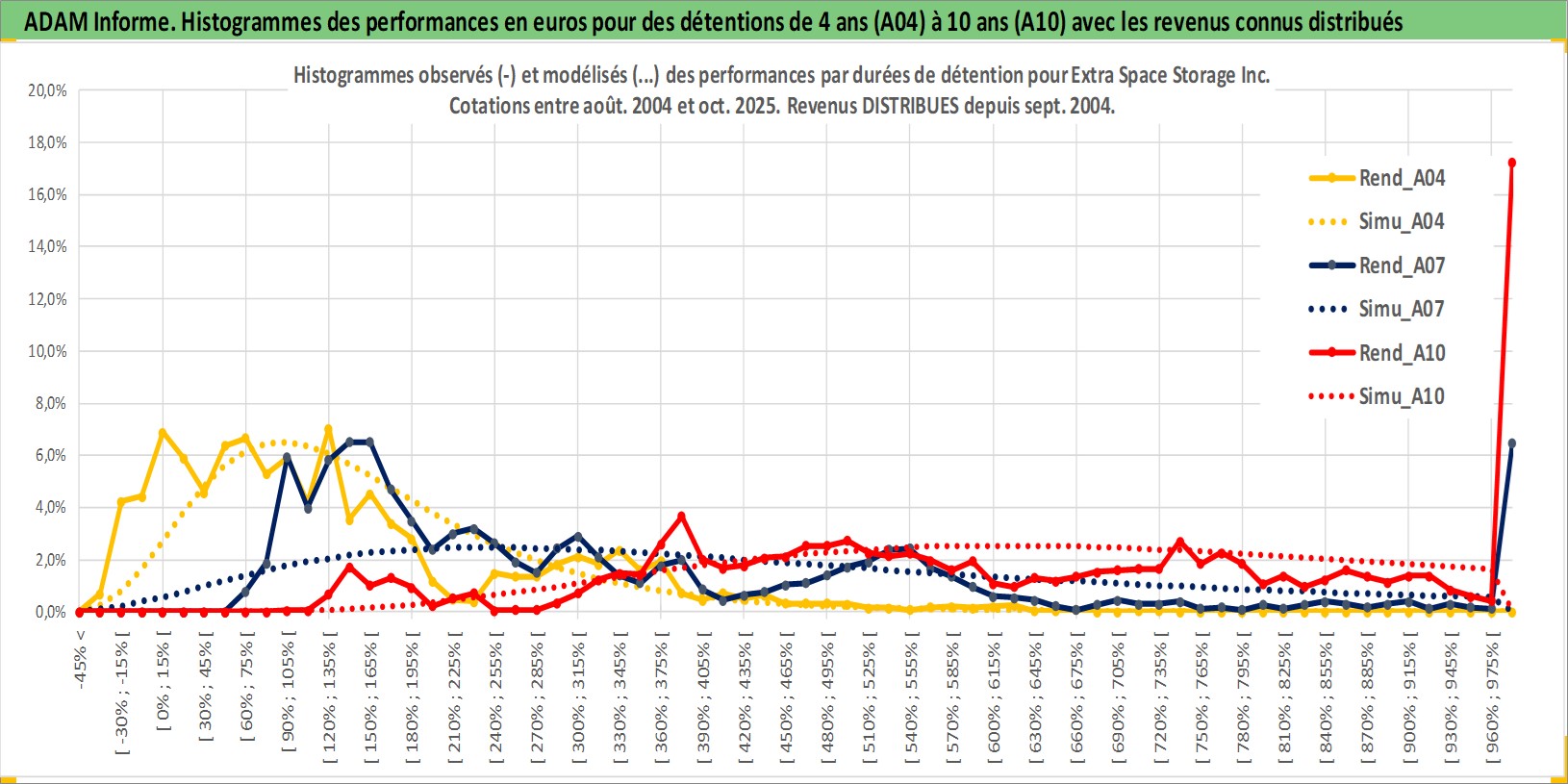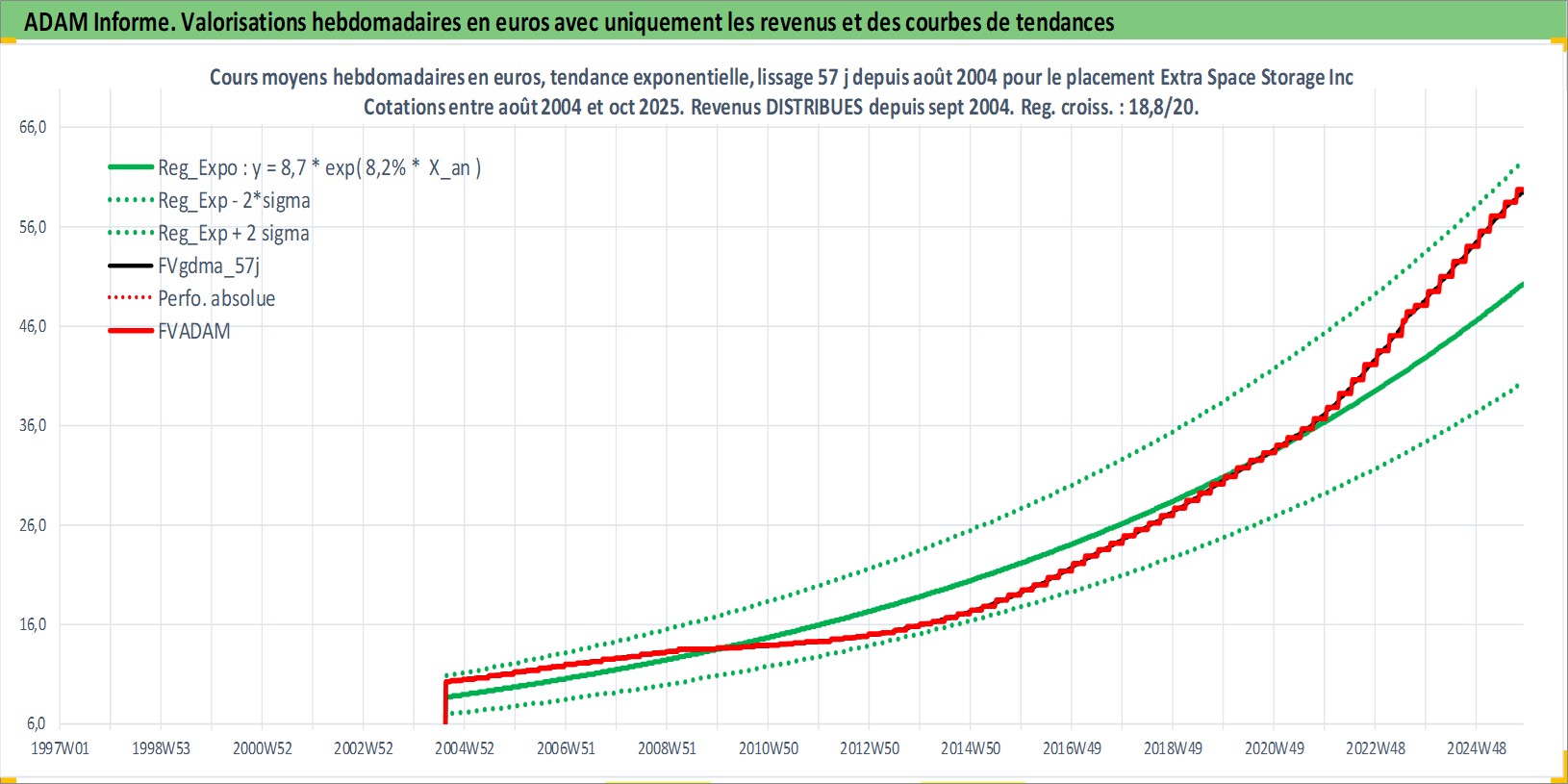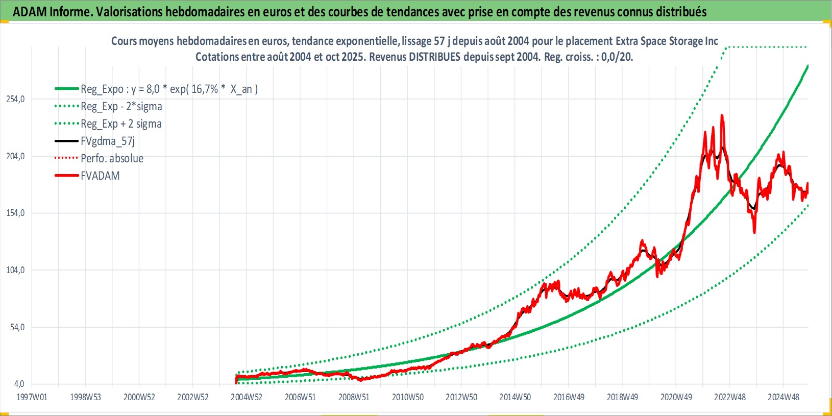 Site dédié aux investisseursPage dédiée sur site financeAnalyse des valorisations hebdomadaires de l'action Extra Space Storage Inc. Cet actif est cote en USD. Les valorisations sont en contrevaleur EURO et couvrent les semaines 2004W33 a 2025W44. Les revenus de cet actif financier sont pris en compte depuis la semaine 2004W38. La note globale ESG de cet actif est estimee a 14.0 (apres rebasage entre 0 et 20).