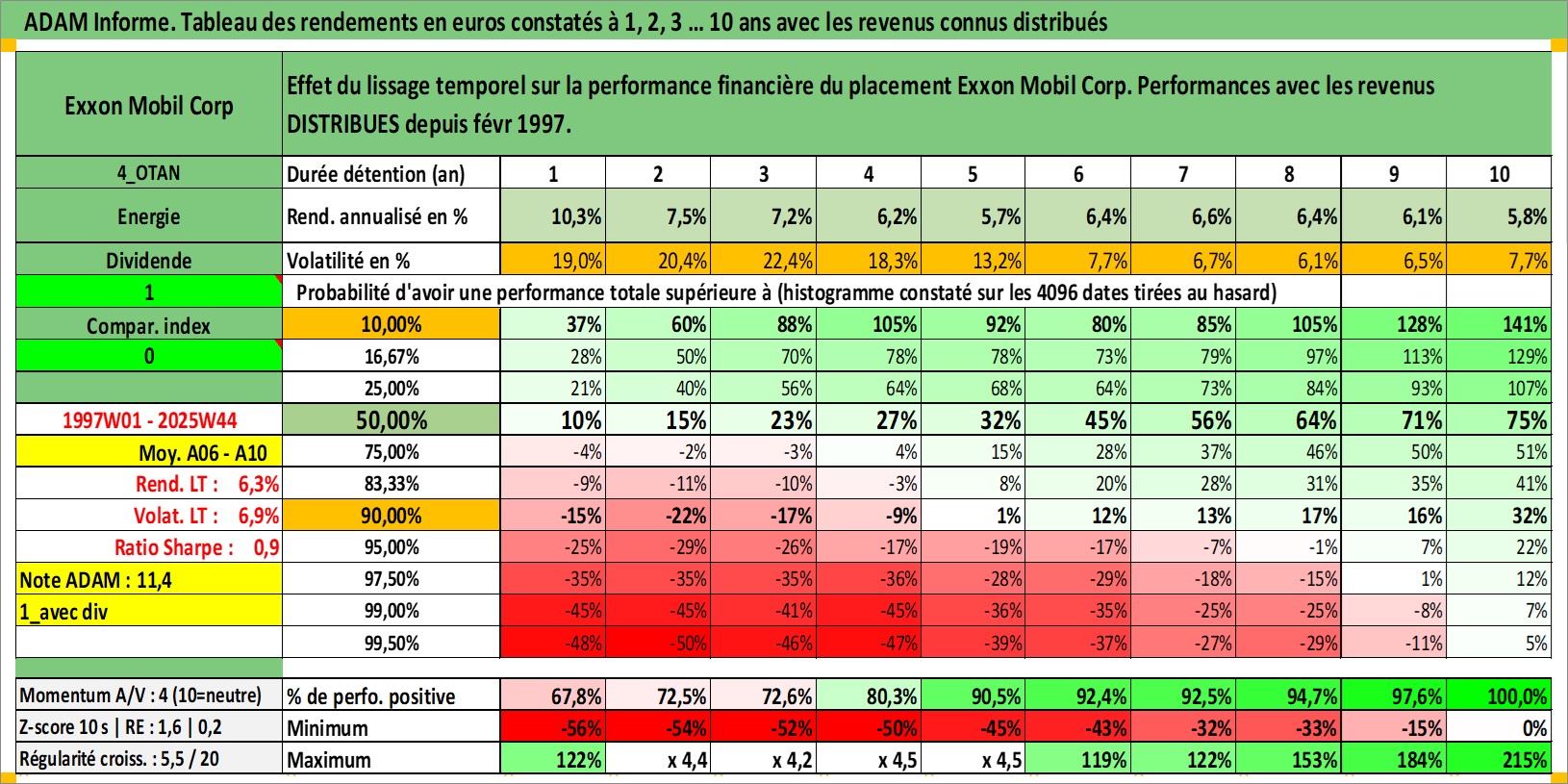 Site dédié aux investisseursPage dédiée sur site financeAnalyse des valorisations hebdomadaires de l'action Exxon Mobil Corp. Cet actif est cote en USD. Les valorisations sont en contrevaleur EURO et couvrent les semaines 1997W01 a 2025W44. Les revenus de cet actif financier sont pris en compte depuis la semaine 1997W06. La note globale ESG de cet actif est estimee a 3.0 (apres rebasage entre 0 et 20).