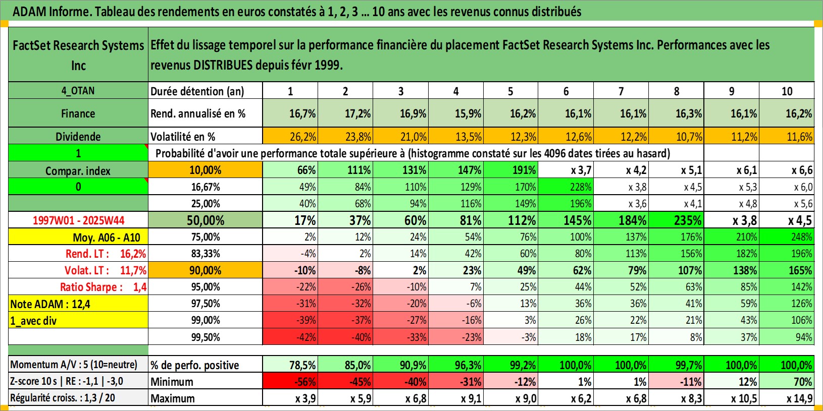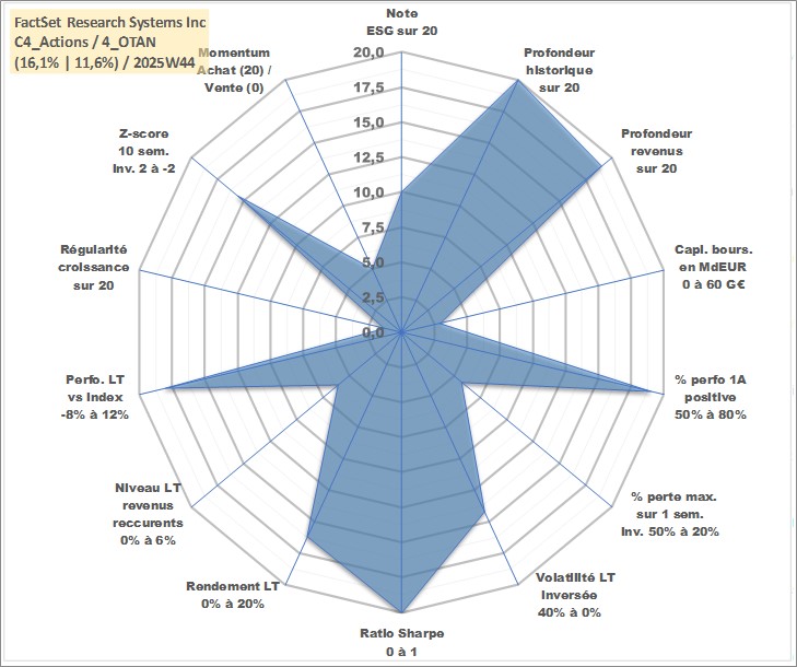 Site dédié aux investisseursPage dédiée sur site financeAnalyse des valorisations hebdomadaires de l'action FactSet Research Systems Inc. Cet actif est cote en USD. Les valorisations sont en contrevaleur EURO et couvrent les semaines 1997W01 a 2025W44. Les revenus de cet actif financier sont pris en compte depuis la semaine 1999W08. La note globale ESG de cet actif est estimee a 10.0 (apres rebasage entre 0 et 20).