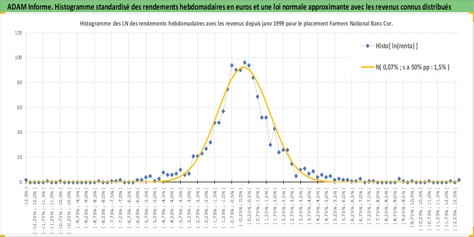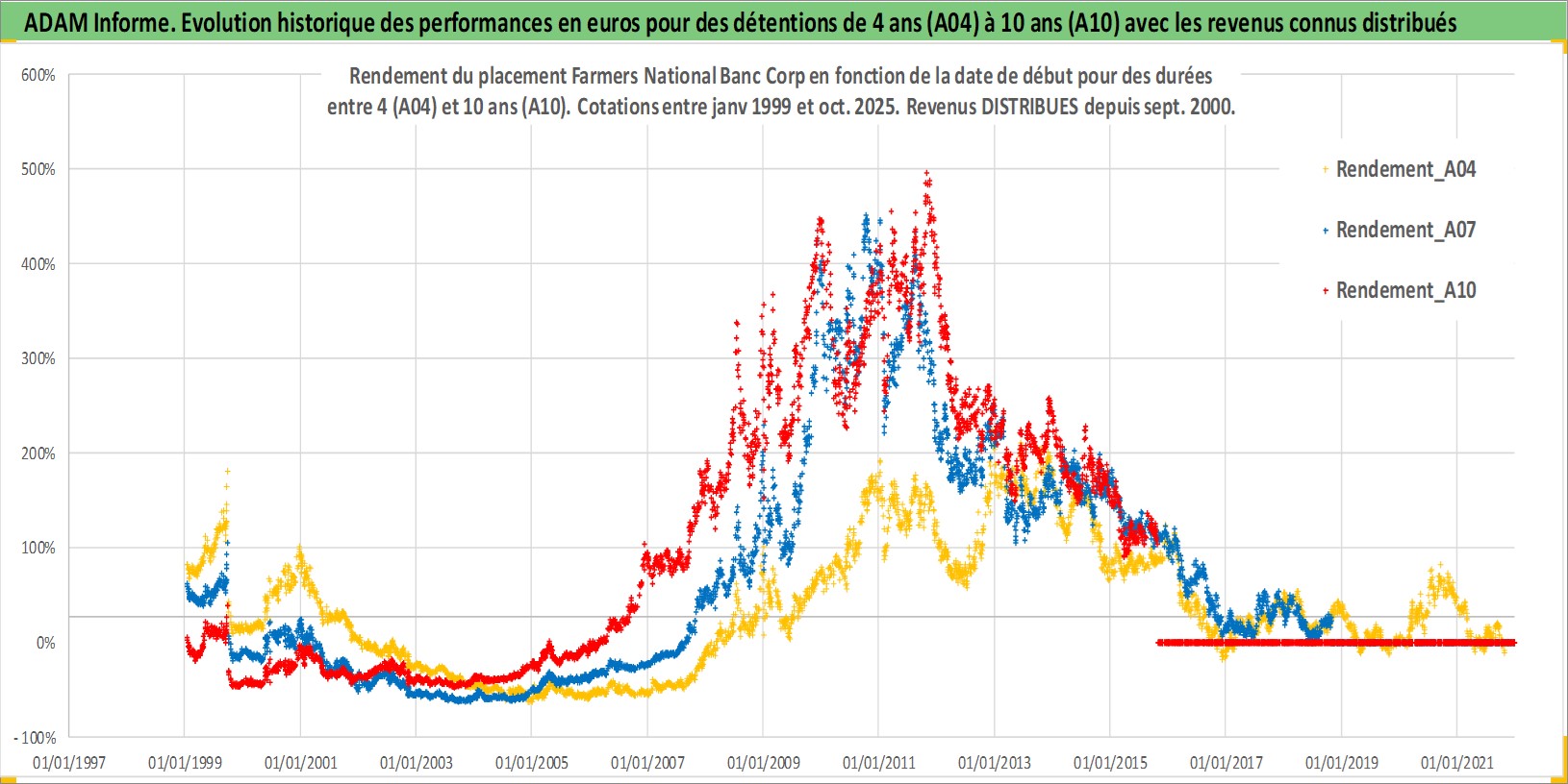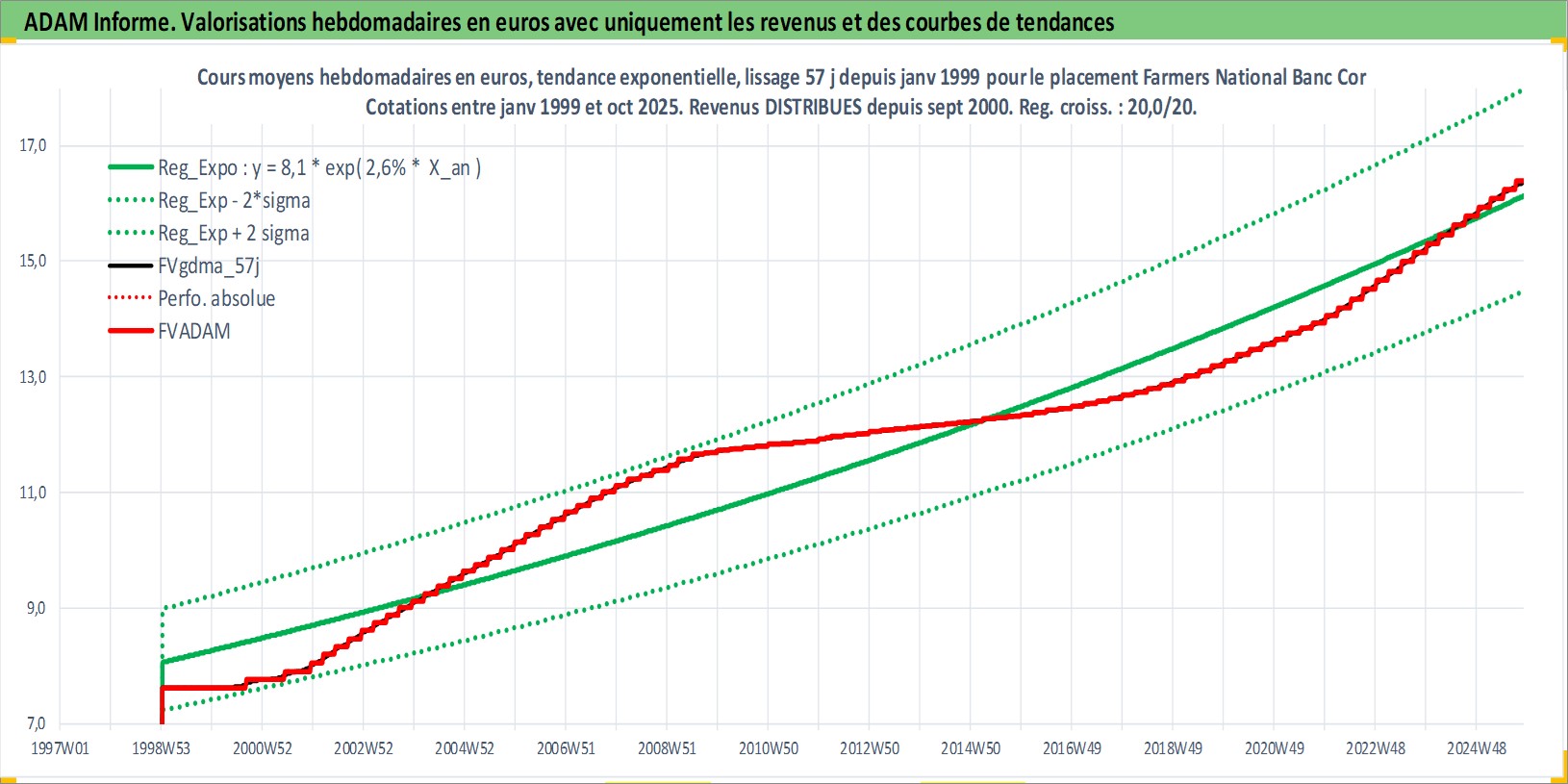 Site dédié aux investisseursPage dédiée sur site financeAnalyse des valorisations hebdomadaires de l'action Farmers National Banc Corp. Cet actif est cote en USD. Les valorisations sont en contrevaleur EURO et couvrent les semaines 1999W01 a 2025W44. Les revenus de cet actif financier sont pris en compte depuis la semaine 2000W36. La note ESG de cet actif n'est pas connue.