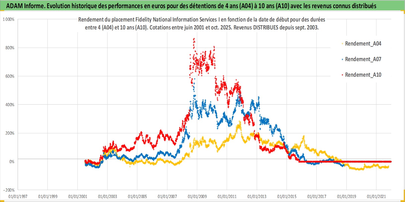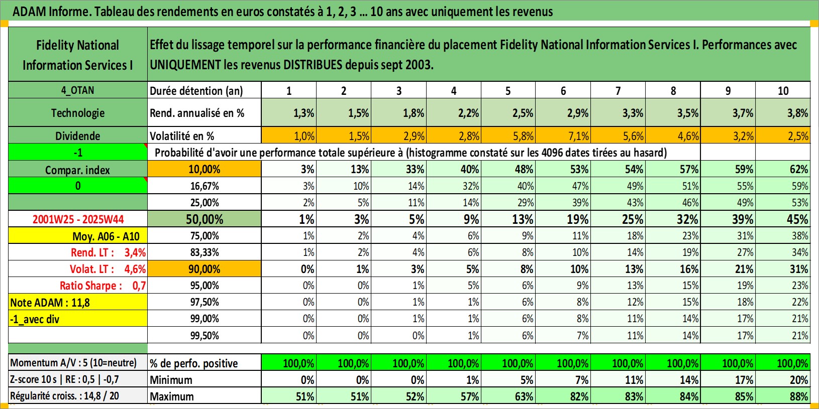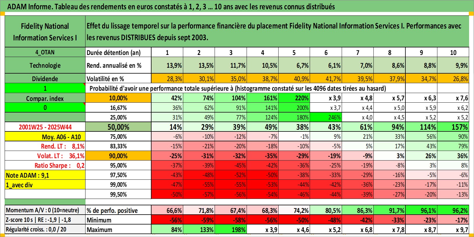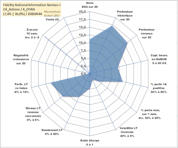 Site dédié aux investisseursPage dédiée sur site financeAnalyse des valorisations hebdomadaires de l'action Fidelity National Information Services I. Cet actif est cote en USD. Les valorisations sont en contrevaleur EURO et couvrent les semaines 2001W25 a 2025W44. Les revenus de cet actif financier sont pris en compte depuis la semaine 2003W40. La note globale ESG de cet actif est estimee a 11.0 (apres rebasage entre 0 et 20).