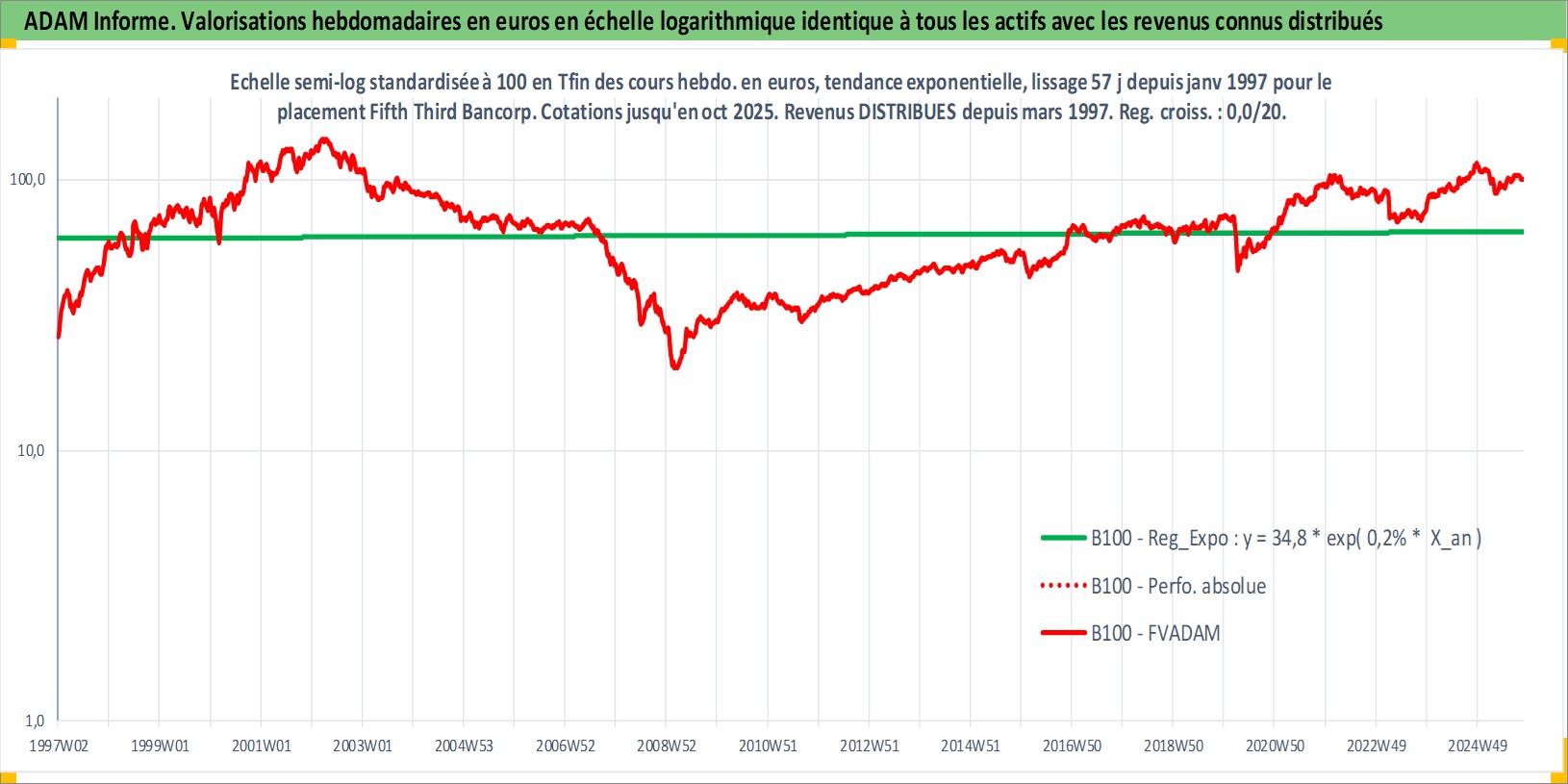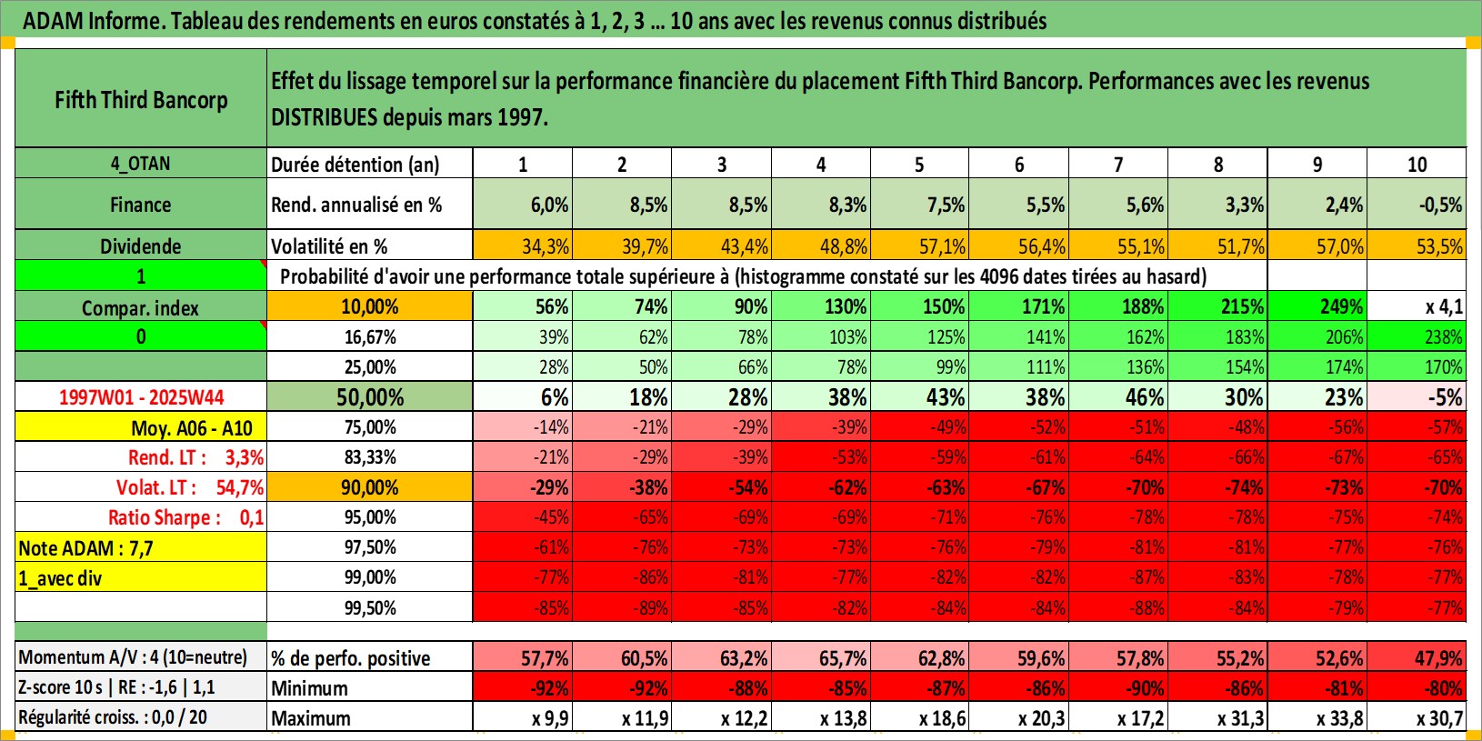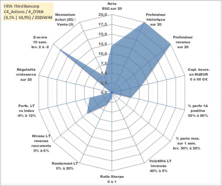 Site dédié aux investisseursPage dédiée sur site financeAnalyse des valorisations hebdomadaires de l'action Fifth Third Bancorp. Cet actif est cote en USD. Les valorisations sont en contrevaleur EURO et couvrent les semaines 1997W01 a 2025W44. Les revenus de cet actif financier sont pris en compte depuis la semaine 1997W13. La note globale ESG de cet actif est estimee a 12.0 (apres rebasage entre 0 et 20).