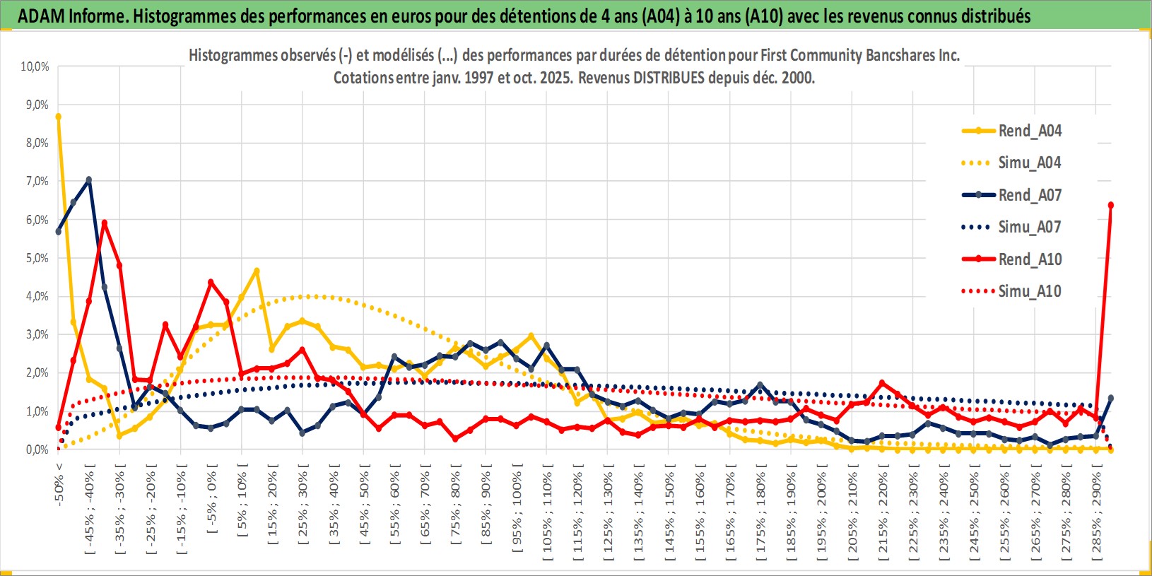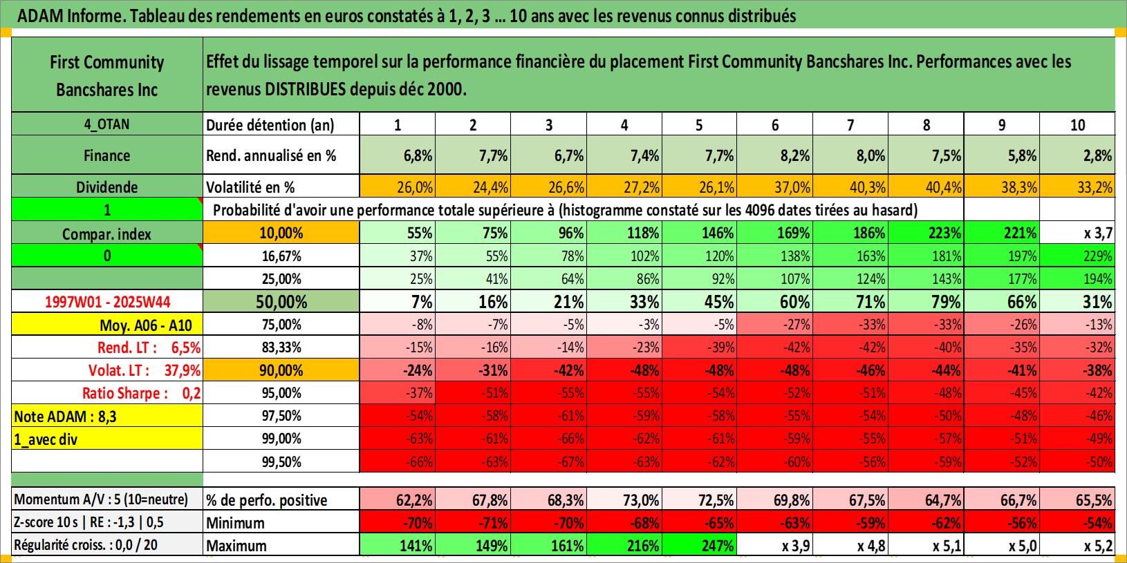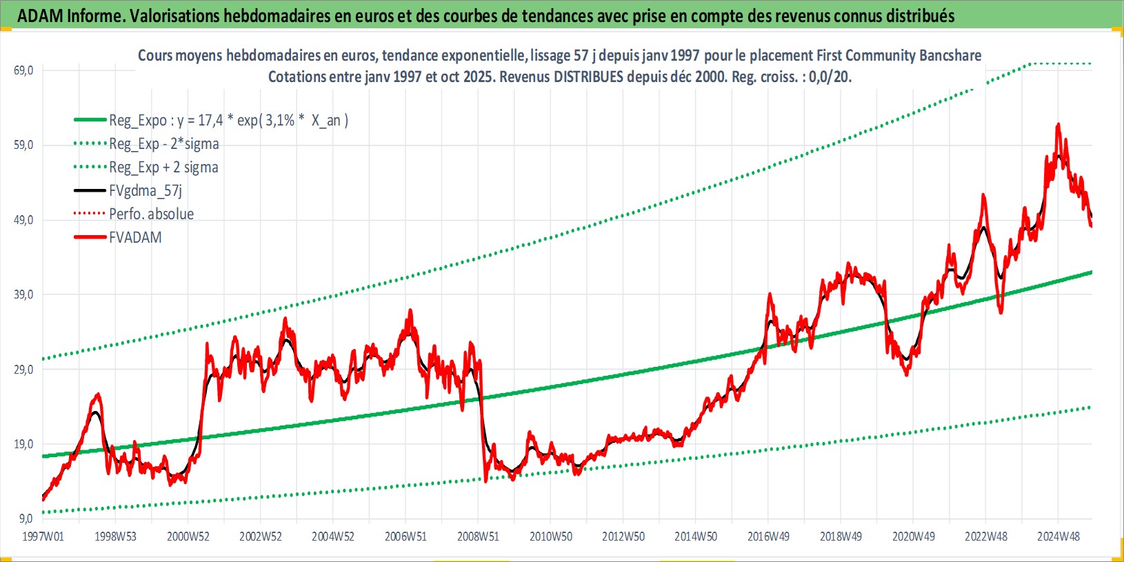 Site dédié aux investisseursPage dédiée sur site financeAnalyse des valorisations hebdomadaires de l'action First Community Bancshares Inc. Cet actif est cote en USD. Les valorisations sont en contrevaleur EURO et couvrent les semaines 1997W01 a 2025W44. Les revenus de cet actif financier sont pris en compte depuis la semaine 2000W50. La note ESG de cet actif n'est pas connue.