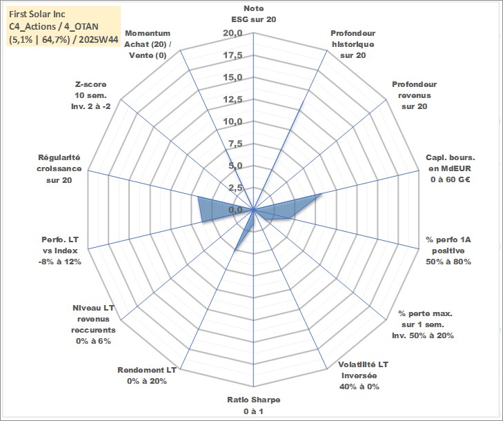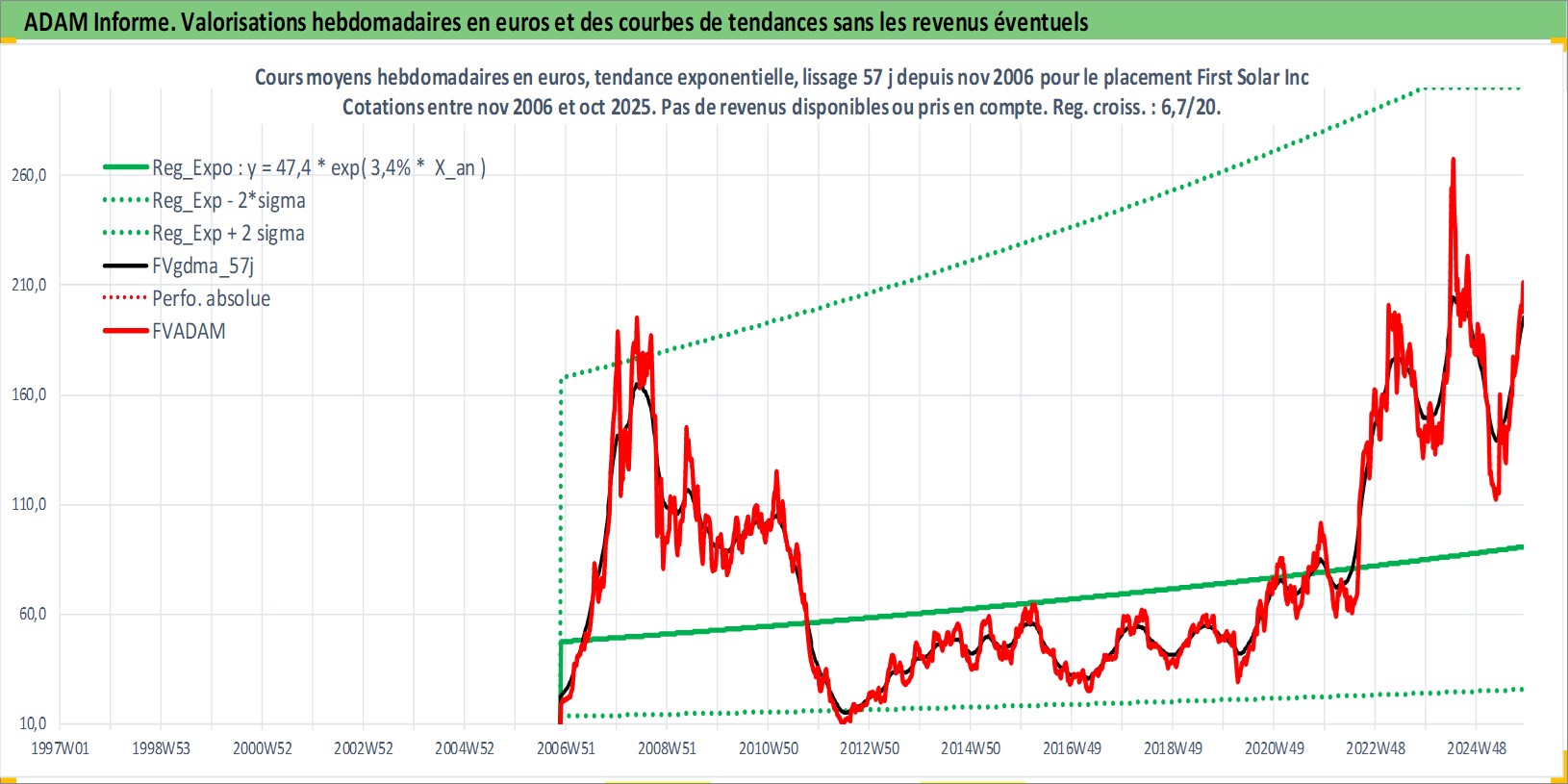 Site dédié aux investisseursPage dédiée sur site financeAnalyse des valorisations hebdomadaires de l'action First Solar Inc. Cet actif est cote en USD. Les valorisations sont en contrevaleur EURO et couvrent les semaines 2006W46 a 2025W44. Les revenus de cet actif financier ne sont pas connus car non existants ou non disponibles sur le site Yahoo Finance. La note ESG de cet actif n'est pas connue.