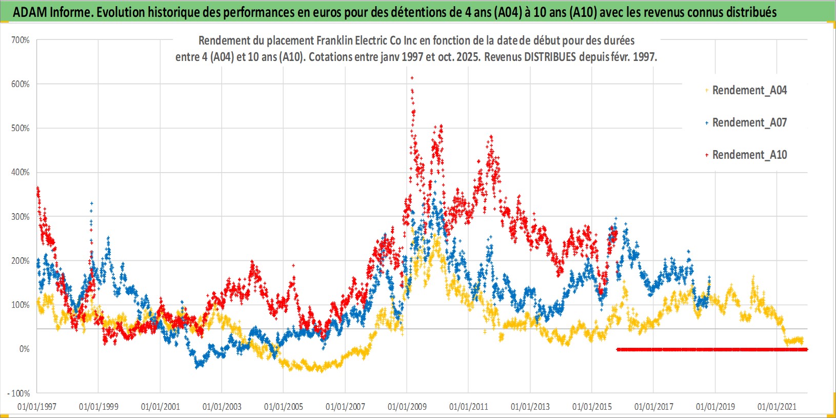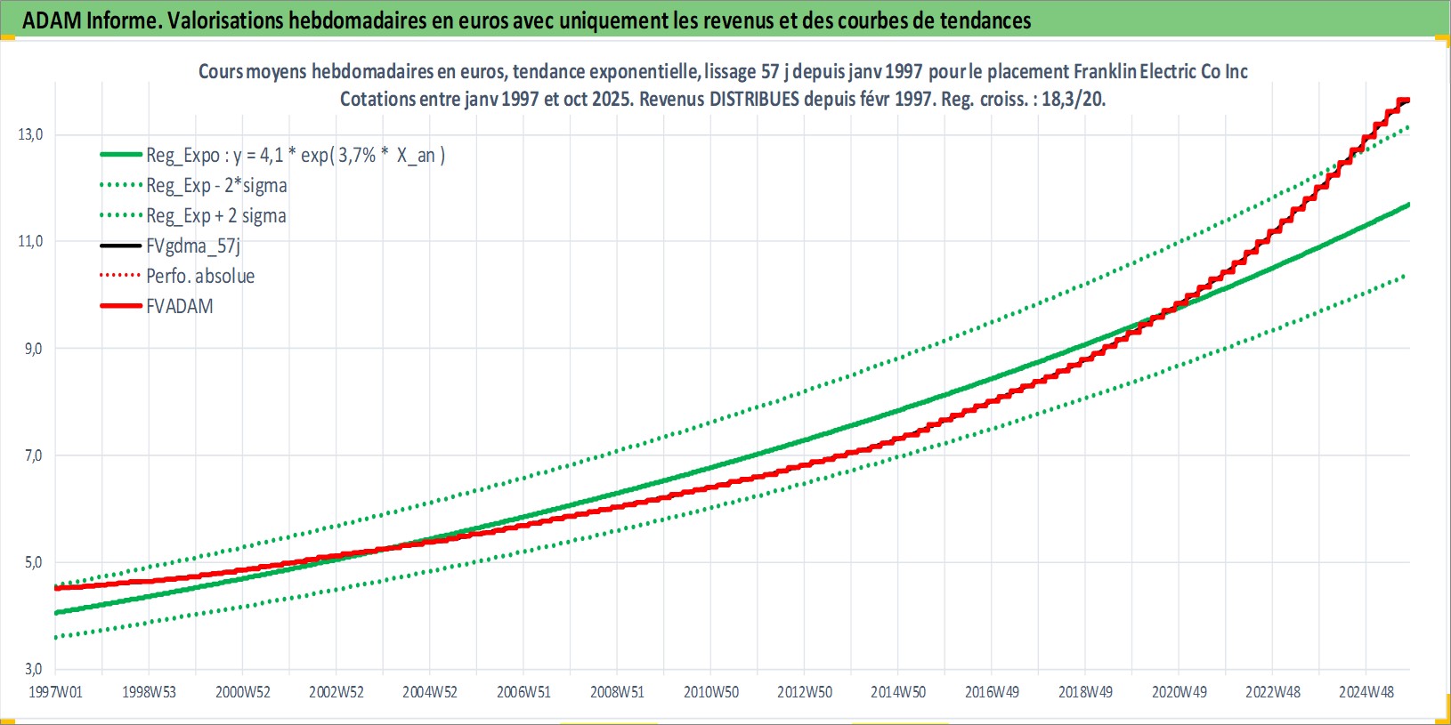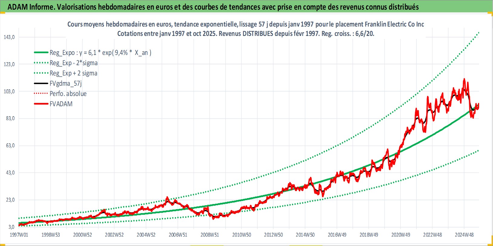 Site dédié aux investisseursPage dédiée sur site financeAnalyse des valorisations hebdomadaires de l'action Franklin Electric Co Inc. Cet actif est cote en USD. Les valorisations sont en contrevaleur EURO et couvrent les semaines 1997W01 a 2025W44. Les revenus de cet actif financier sont pris en compte depuis la semaine 1997W07. La note ESG de cet actif n'est pas connue.