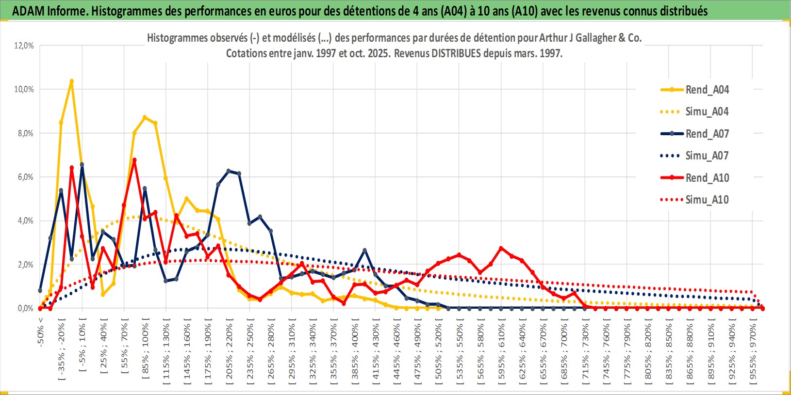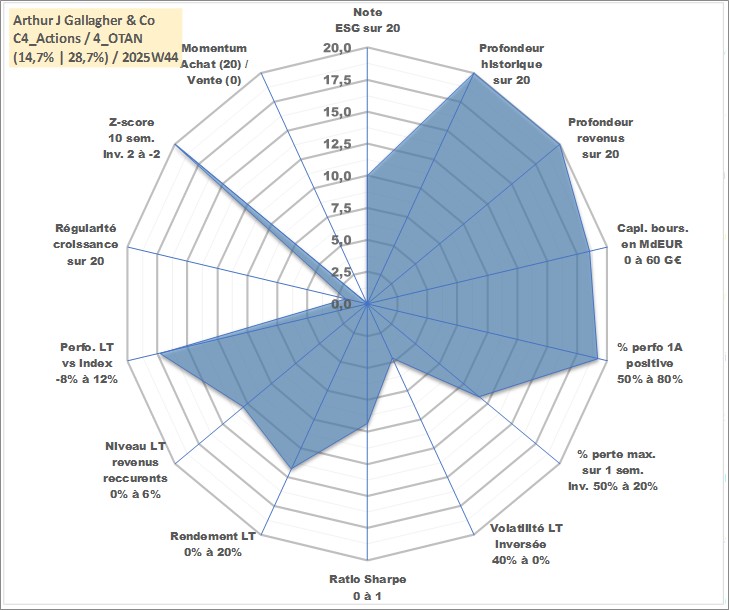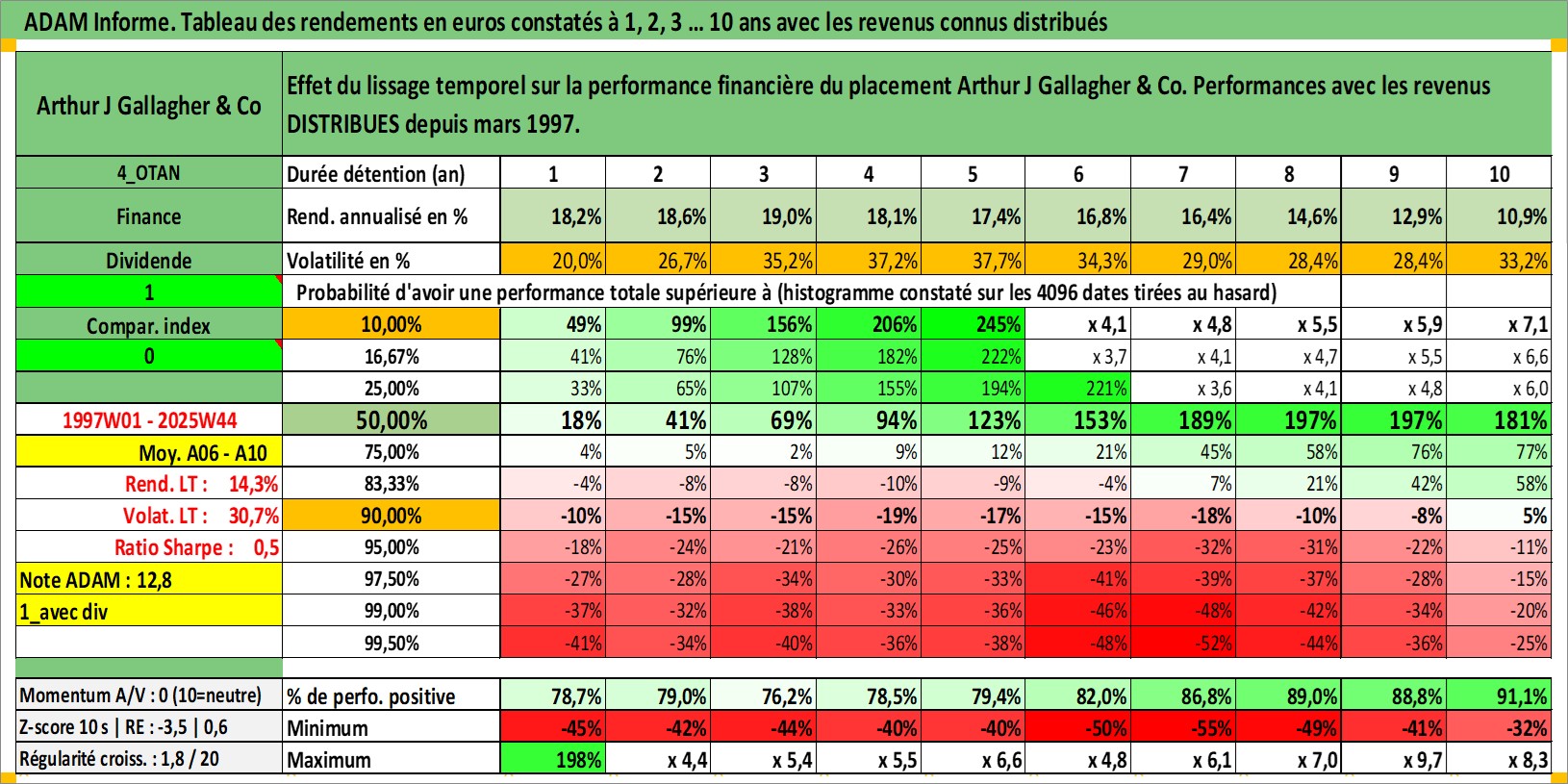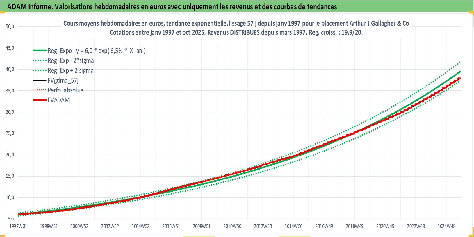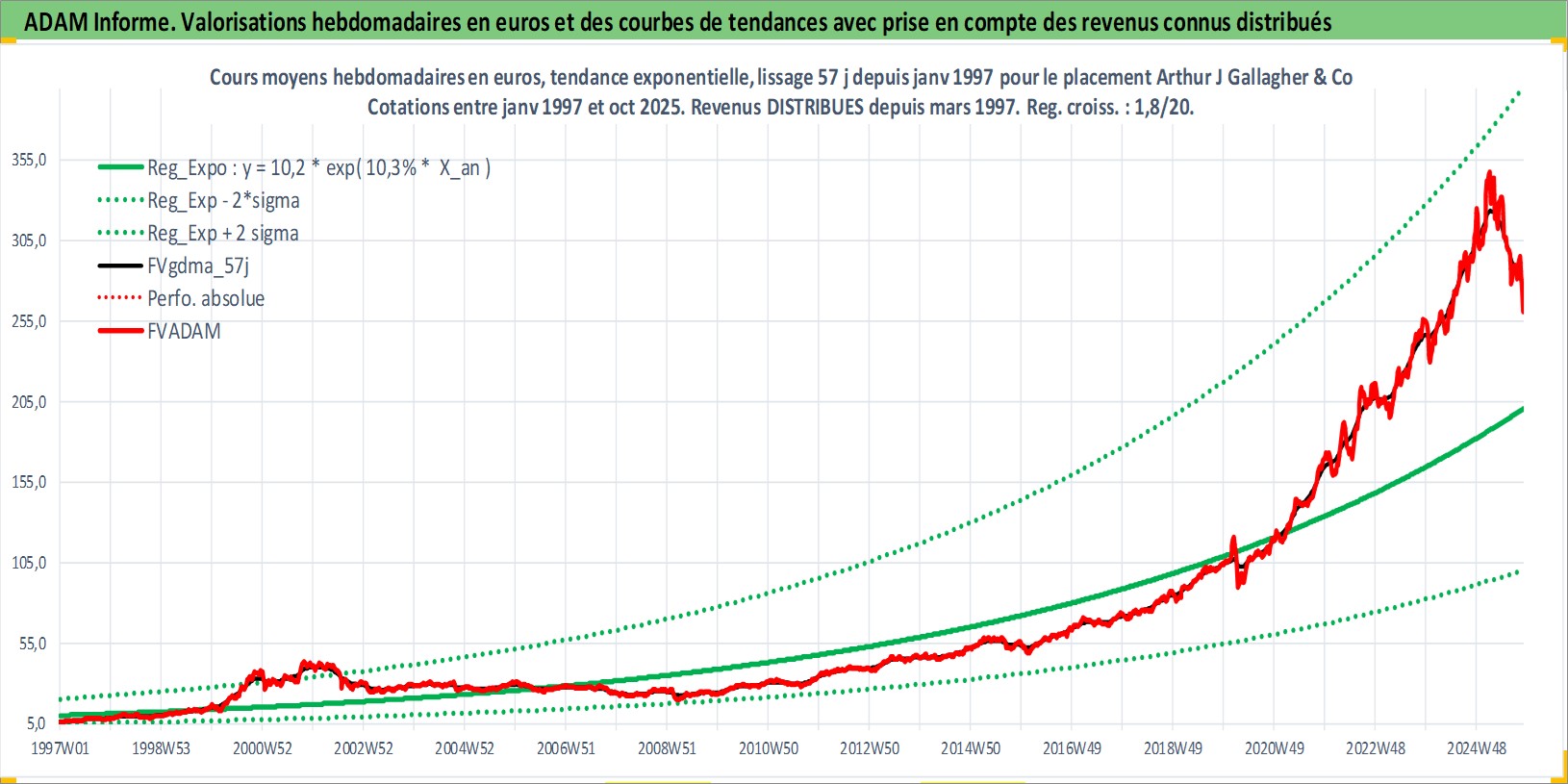 Site dédié aux investisseursPage dédiée sur site financeAnalyse des valorisations hebdomadaires de l'action Arthur J Gallagher & Co. Cet actif est cote en USD. Les valorisations sont en contrevaleur EURO et couvrent les semaines 1997W01 a 2025W44. Les revenus de cet actif financier sont pris en compte depuis la semaine 1997W13. La note globale ESG de cet actif est estimee a 10.0 (apres rebasage entre 0 et 20).