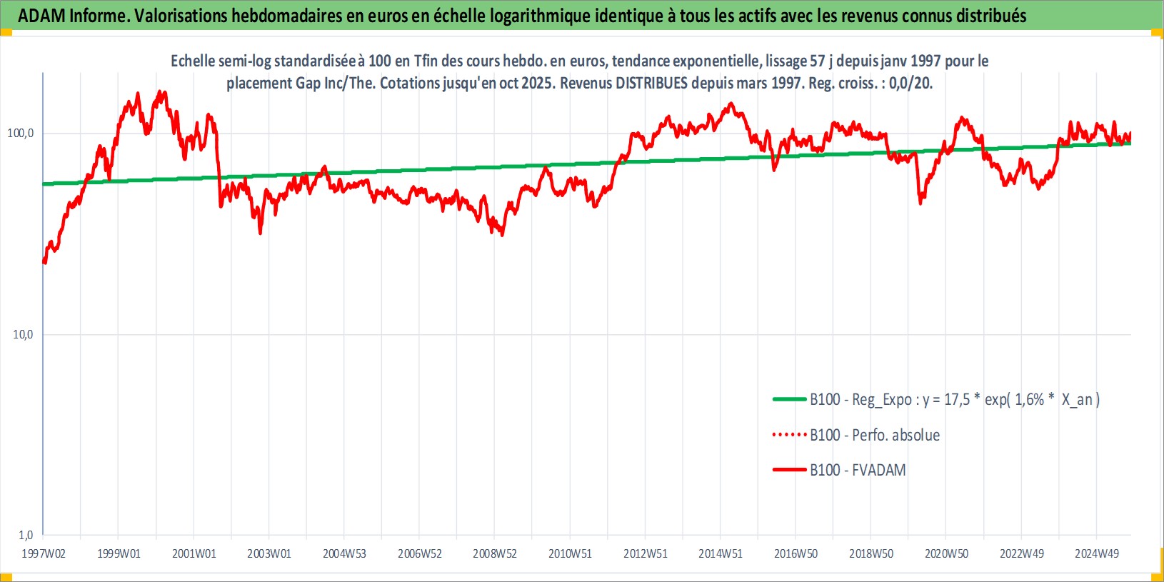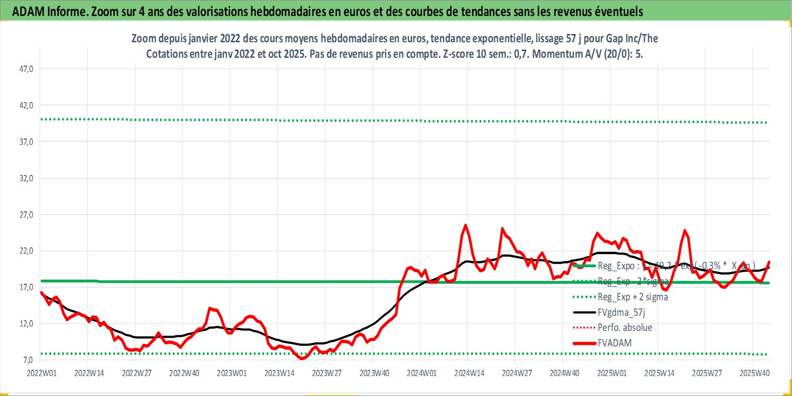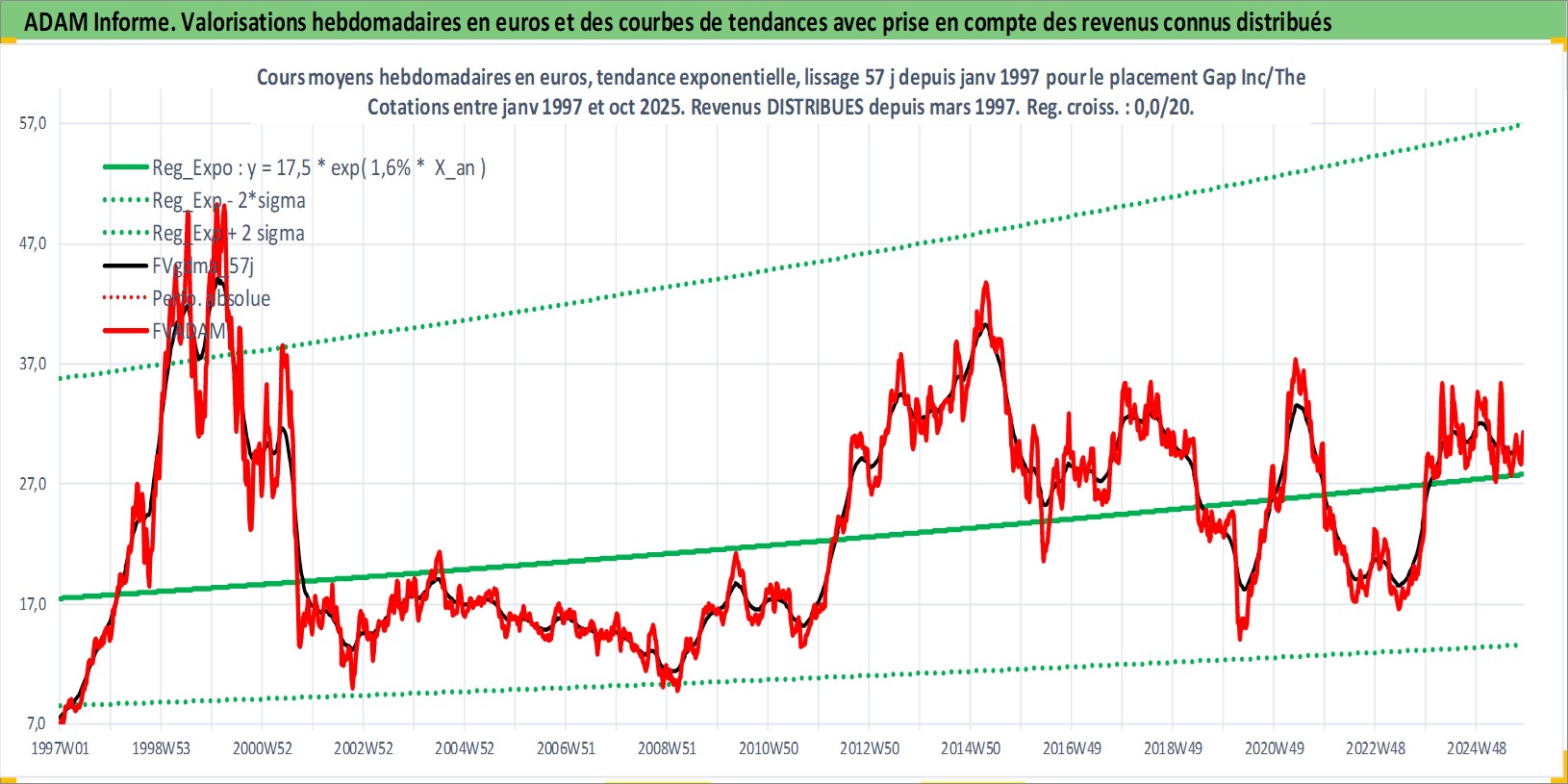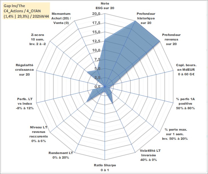 Site dédié aux investisseursPage dédiée sur site financeAnalyse des valorisations hebdomadaires de l'action Gap Inc/The. Cet actif est cote en USD. Les valorisations sont en contrevaleur EURO et couvrent les semaines 1997W01 a 2025W44. Les revenus de cet actif financier sont pris en compte depuis la semaine 1997W10. La note globale ESG de cet actif est estimee a 13.0 (apres rebasage entre 0 et 20).