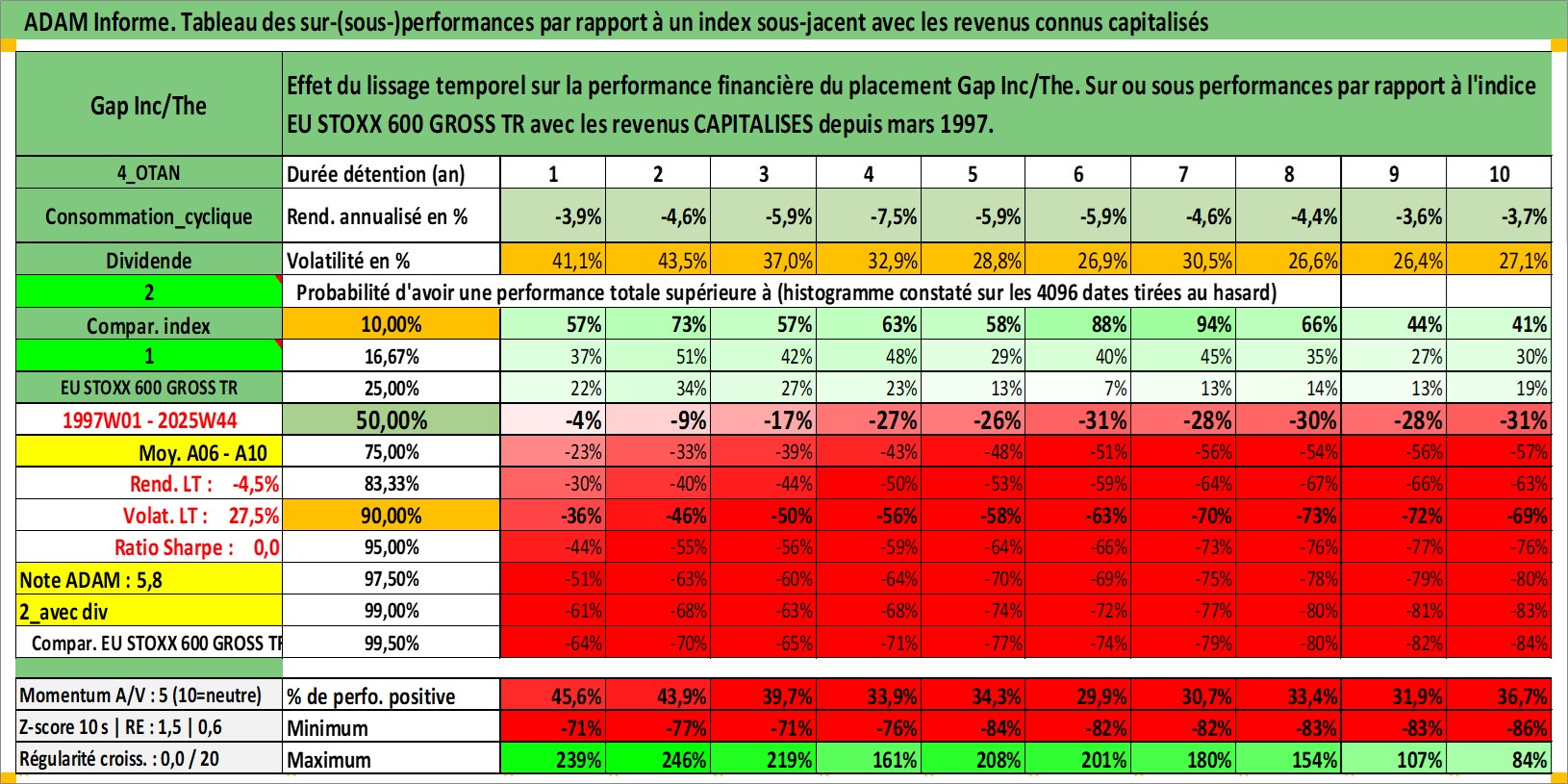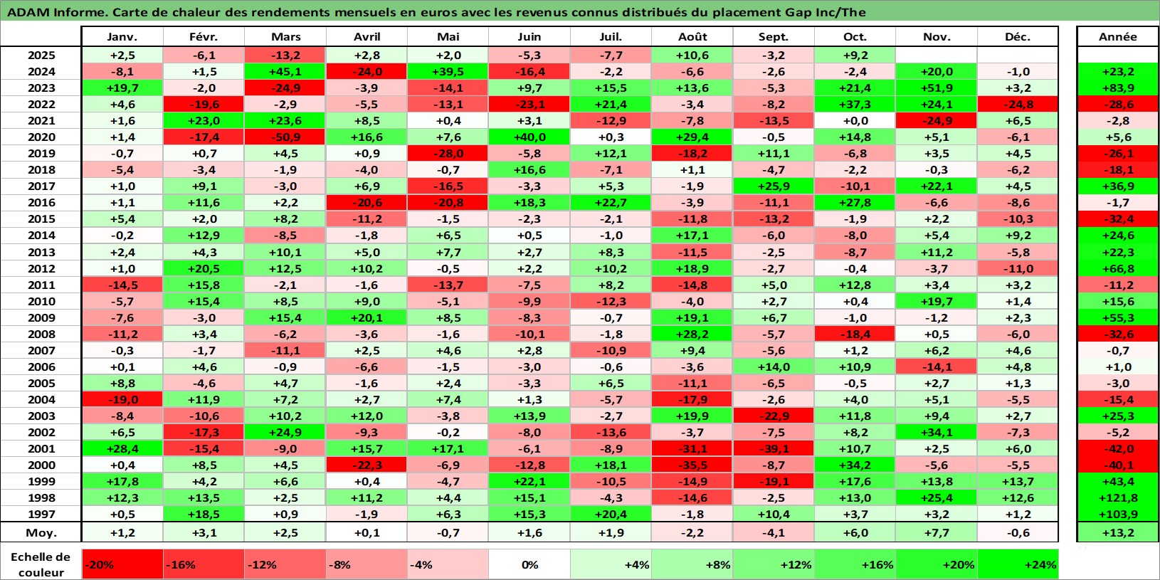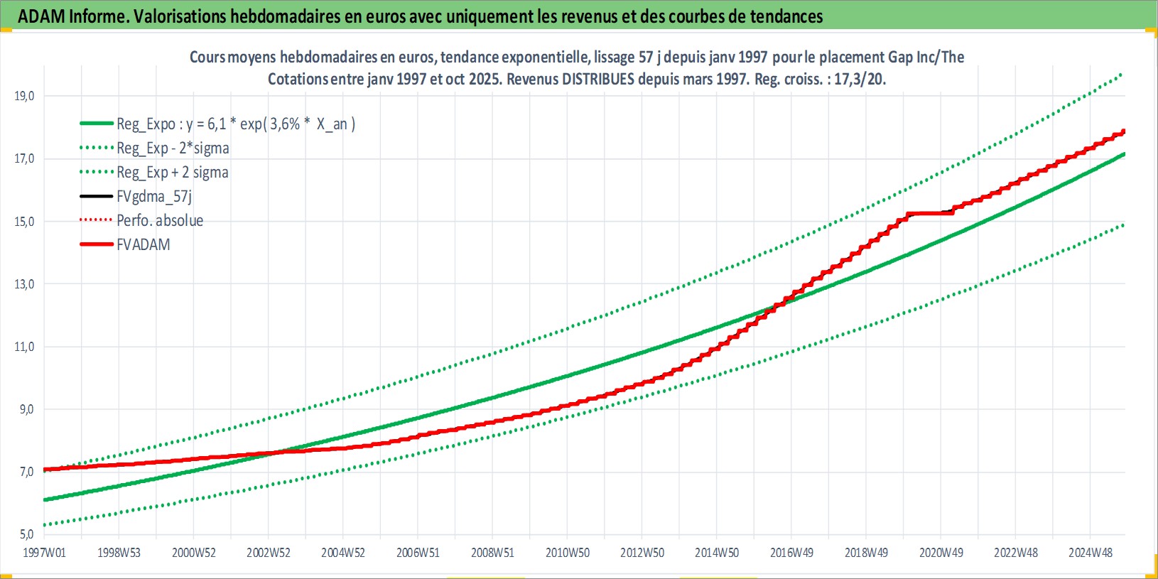 Site dédié aux investisseursPage dédiée sur site financeAnalyse des valorisations hebdomadaires de l'action Gap Inc/The. Cet actif est cote en USD. Les valorisations sont en contrevaleur EURO et couvrent les semaines 1997W01 a 2025W44. Les revenus de cet actif financier sont pris en compte depuis la semaine 1997W10. La note globale ESG de cet actif est estimee a 13.0 (apres rebasage entre 0 et 20).