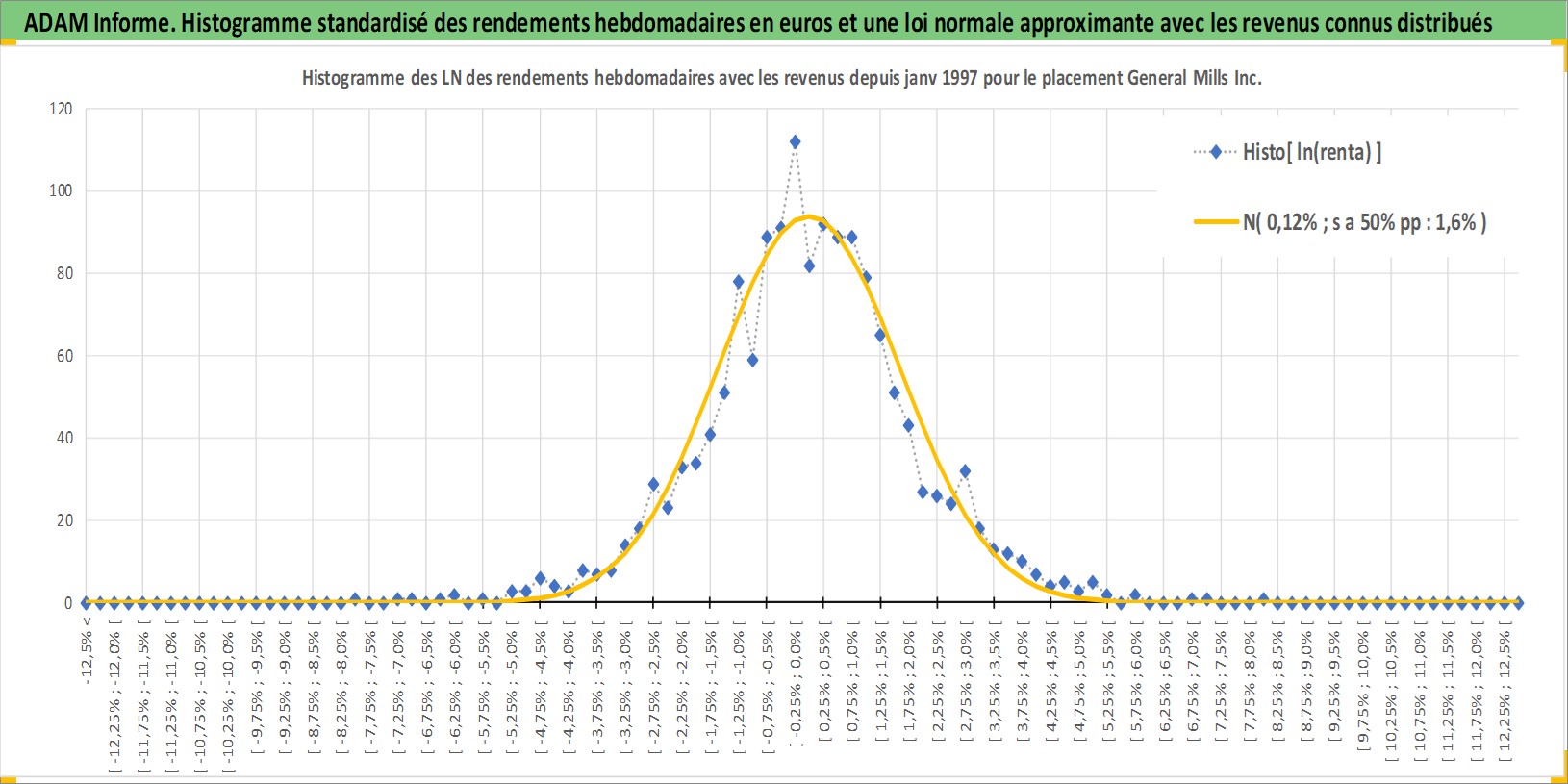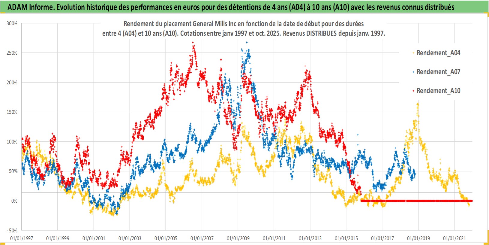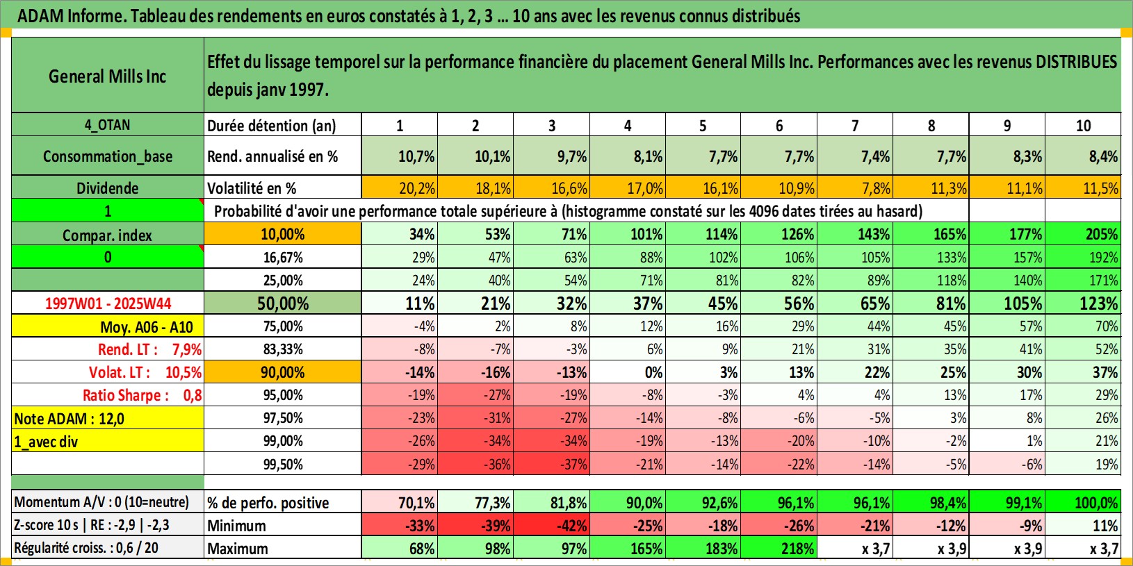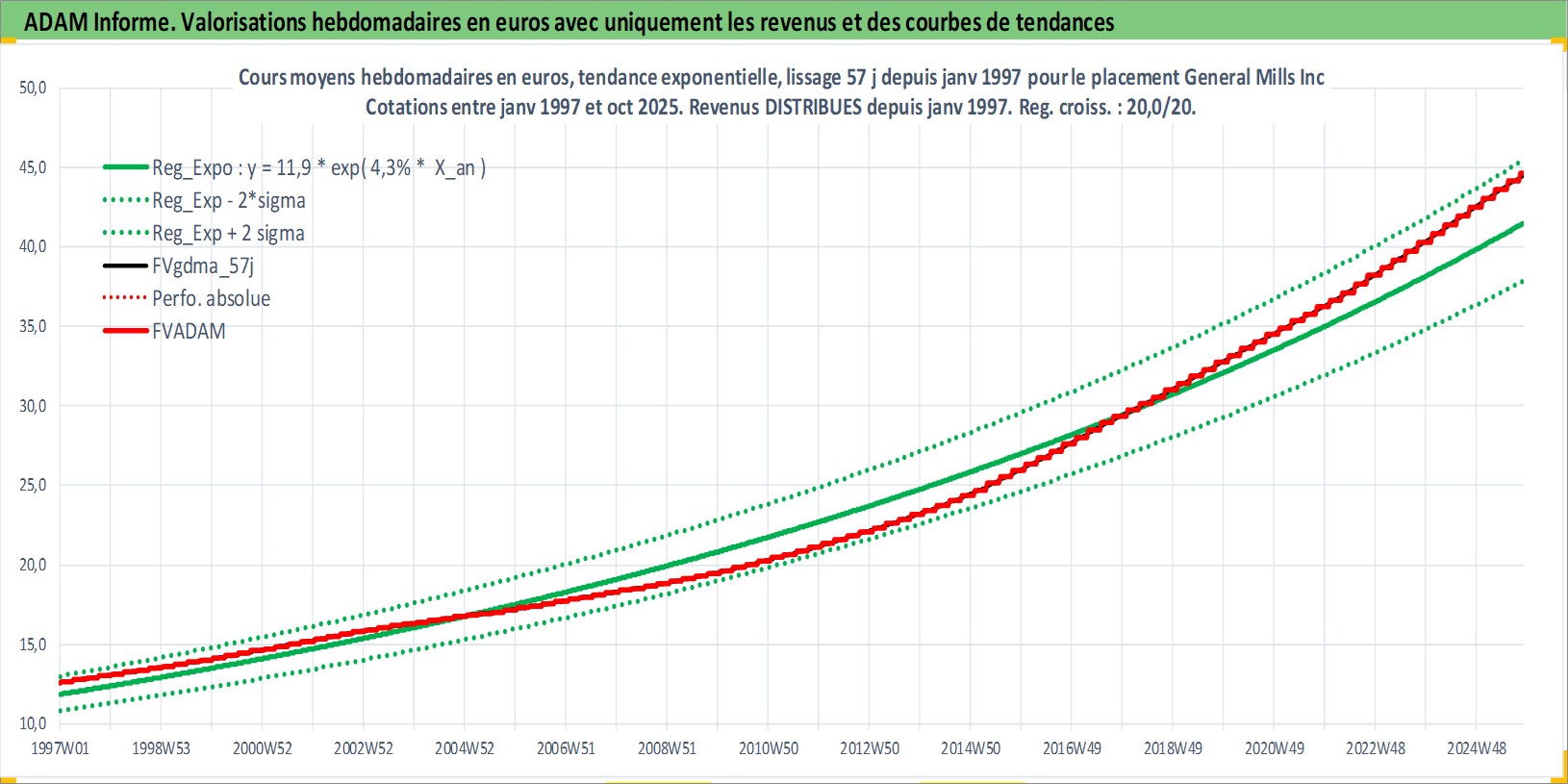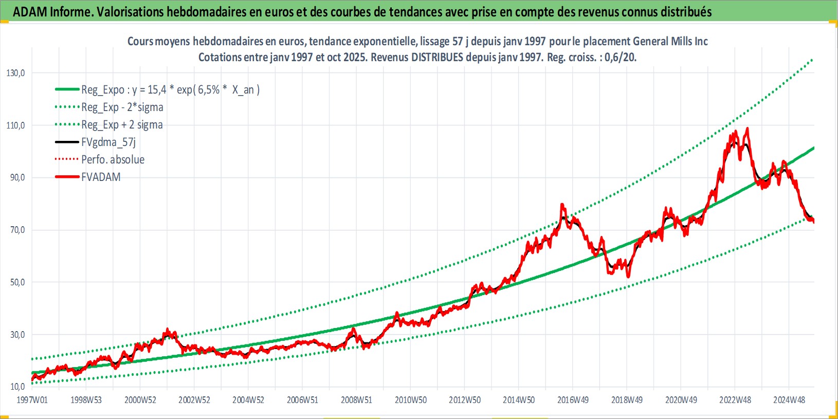Site dédié aux investisseursPage dédiée sur site financeAnalyse des valorisations hebdomadaires de l'action General Mills Inc. Cet actif est cote en USD. Les valorisations sont en contrevaleur EURO et couvrent les semaines 1997W01 a 2025W44. Les revenus de cet actif financier sont pris en compte depuis la semaine 1997W02. La note globale ESG de cet actif est estimee a 9.0 (apres rebasage entre 0 et 20).