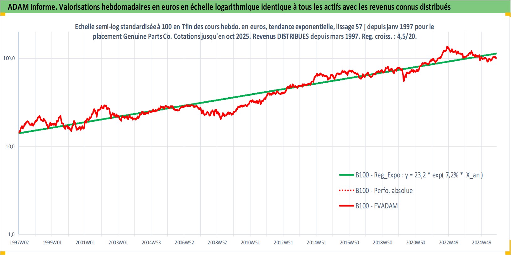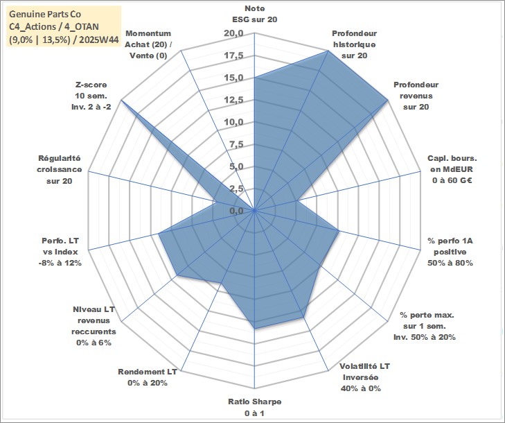 Site dédié aux investisseursPage dédiée sur site financeAnalyse des valorisations hebdomadaires de l'action Genuine Parts Co. Cet actif est cote en USD. Les valorisations sont en contrevaleur EURO et couvrent les semaines 1997W01 a 2025W44. Les revenus de cet actif financier sont pris en compte depuis la semaine 1997W10. La note globale ESG de cet actif est estimee a 15.0 (apres rebasage entre 0 et 20).