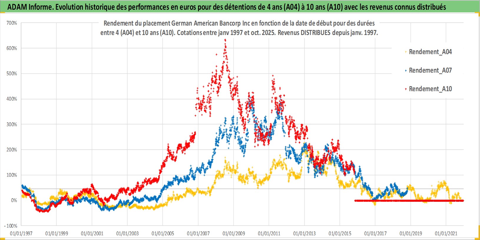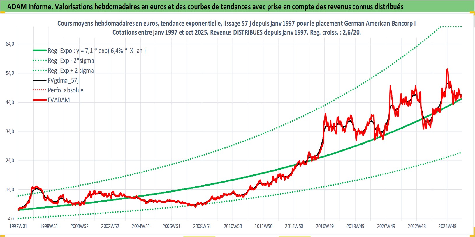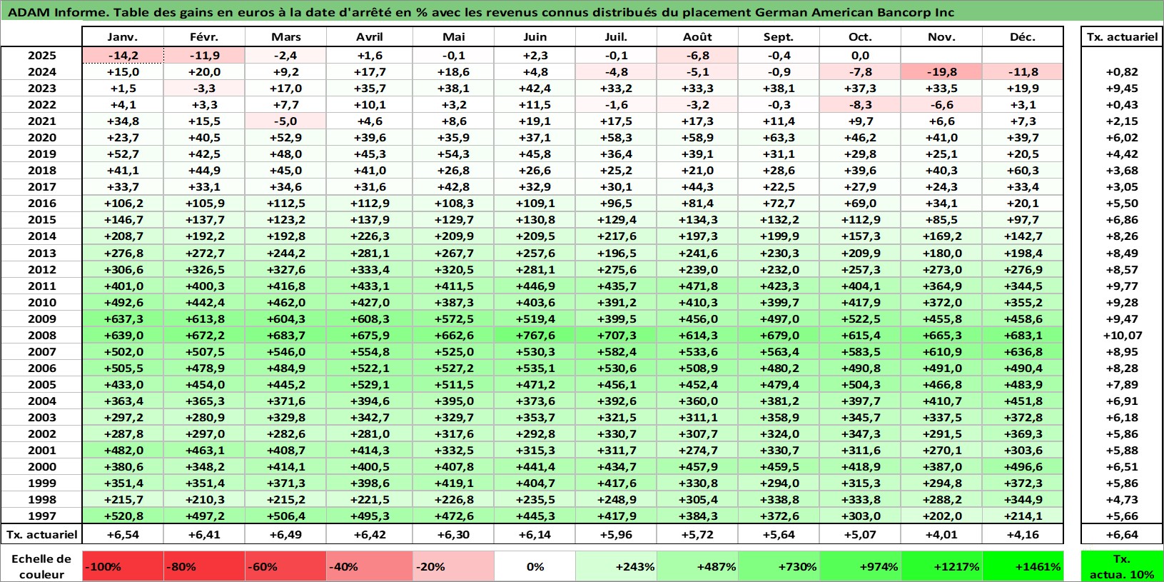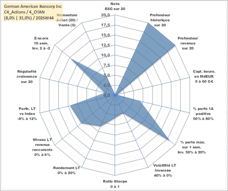 Site dédié aux investisseursPage dédiée sur site financeAnalyse des valorisations hebdomadaires de l'action German American Bancorp Inc. Cet actif est cote en USD. Les valorisations sont en contrevaleur EURO et couvrent les semaines 1997W01 a 2025W44. Les revenus de cet actif financier sont pris en compte depuis la semaine 1997W04. La note ESG de cet actif n'est pas connue.